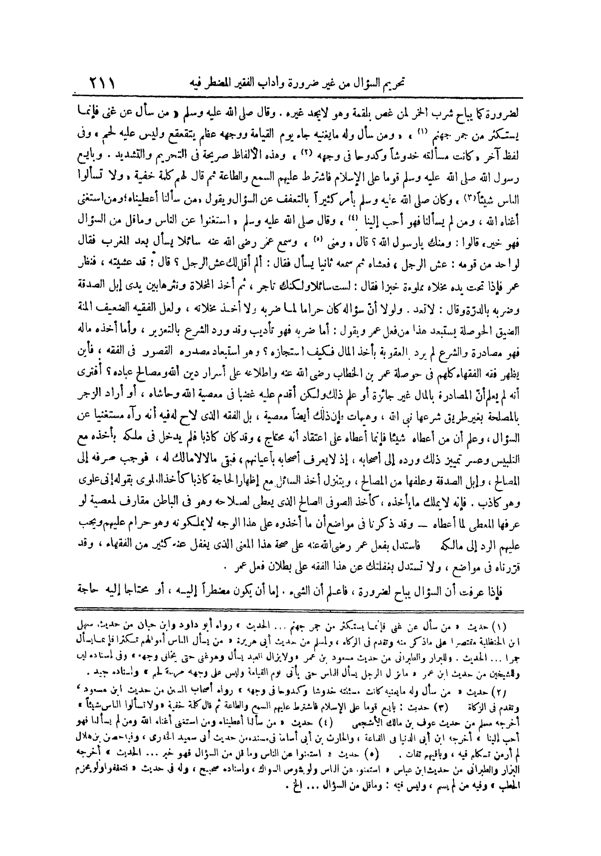 وَلَوْلَا أن سُؤَالُهُ كَانَ حَرَامًا لَمَا ضَرَبَهُ وَلَا أَخَذَ مخلاته ولعل الفقيه الضعيف المنة الضيق الحوصلة يستبعد هذا من فعل عمر ويقول أما ضربه فهو تأديب وقد ورد الشرع بالتعزير وأما أخذه ماله فهو مصادرة والشرع لم يرد بالعقوبة بأخذ المال فكيف استجازه وهو استبعاد مصدره القصور في الفقه فأين يظهر فقه الفقهاء كلهم في حوصلة عمر بن الخطاب رضي الله عنه وإطلاعه على أسرار دين الله ومصالح عباده أفترى أنه لم يعلم أن المصادرة بالمال غير جائزة أو علم ذلك ولكن أقدم عليه غضباً في معصية الله وحاشاه أو أراد الزجر بالمصلحة بغير طريق شرعها نبي الله وهيهات فإن ذلك أيضاً معصية بل الفقه الذي لَاحَ لَهُ فِيهِ أَنَّهُ رَآهُ مُسْتَغْنِيًا عَنِ السُّؤَالِ وَعَلِمَ أَنَّ مَنْ أَعْطَاهُ شَيْئًا فَإِنَّمَا أَعْطَاهُ عَلَى اعْتِقَادِ أَنَّهُ مُحْتَاجٌ وَقَدْ كَانَ كاذباً فلم يدخل في ملكه بأخذه مع التَّلْبِيسِ وَعَسُرَ تَمْيِيزُ ذَلِكَ وَرَدُّهُ إِلَى أَصْحَابِهِ إِذْ لَا يُعْرَفُ أَصْحَابُهُ بِأَعْيَانِهِمْ فَبَقِيَ مَالًا لَا مَالِكَ لَهُ فَوَجَبَ صَرْفُهُ إِلَى الْمَصَالِحِ وإبل الصدقة وعلفها من المصالح ويتنزل أخذ السائل مع إظهار الحاجة كاذباً كأخذ العلوي بقوله إني علوي وهو كاذب