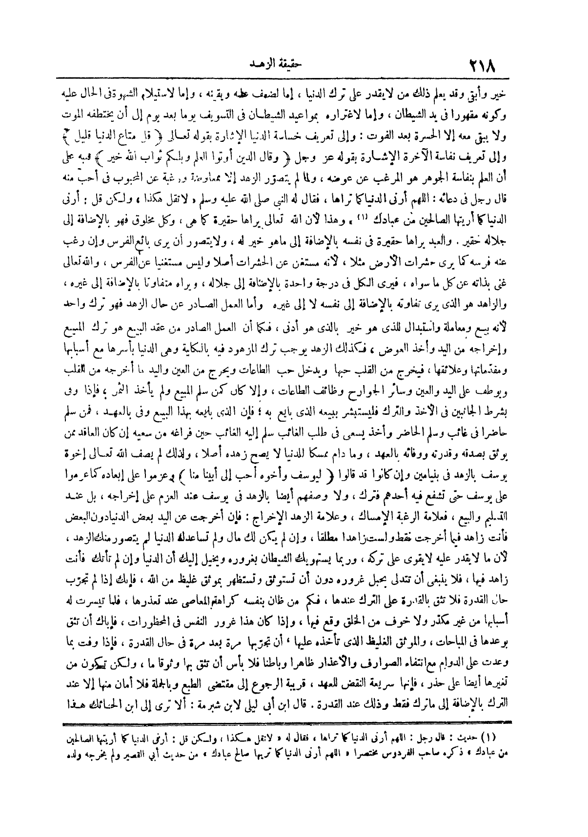 خير وأبقى وقد يعلم ذلك من لا يقدر على ترك الدنيا إما لضعف علمه ويقينه وإما لاستيلاء الشهوة في الحال عليه وكونه مقهوراً في يد الشيطان وإما لاغتراره بمواعيد الشيطان في التسويف يوماً بعد يوم إلى أن يختطفه الموت ولا يبقى معه إلا الحسرة بعد الفوت وإلى تعريف خساسة الدنيا الإشارة بقوله تعالى قل متاع الدنيا قليل وإلى تعريف نفاسة الآخرة الإشارة بقوله عز وجل وقال الذين أوتوا العلم ويلكم ثواب الله خير فنبه على أن العلم بنفاسة الجوهر هو المرغب عن عوضه ولما لم يتصور الزهد إلا بمعاوضة ورغبة عن المحبوب في أحب منه قال رجل في دعائه اللهم أرني الدنيا كما تراها فقال له النبي صلى الله عليه وسلم لا تقل هكذا ولكن قل أرني الدنيا كما أريتها الصالحين من عبادك (¬1) وهذا لأن الله تعالى يراها حقيرة كما هي وكل مخلوق فهو بالإضافة إلى جلاله حقيرة والعبد يراها حقيرة في نفسه بالإضافة إلى ما هو خير له ولا يتصور أن يرى بائع الفرس وإن رغب عنه فرسه كما يرى حشرات الأرض مثلاً لأنه مستغن عن الحشرات أصلاً وليس مستغنياً عن الفرس والله تعالى غني بذاته عن كل ما سواه فيرى الكل في درجة واحدة بالإضافة إلى جلاله ويراه متفاوتاً بالإضافة إلى غيره والزاهد هو الذي يرى تفاوته بالإضافة إلى نفسه لا إلى غيره وأما العمل الصادر عن حال الزهد فهو ترك واحد لأنه بيع ومعاملة واستبدال للذي هو خير بالذي هو أدنى فكما أن العمل الصادر من عقد البيع هو ترك المبيع وإخراجه من اليد وأخذ العوض فكذلك الزهد يوجب ترك المزهود فيه بالكلية وهي الدنيا بأسرها مع أسبابها ومقدماتها وعلائقها فيخرج من القلب حبها ويدخل حب الطاعات ويخرج من العين واليد ما أخرجه من القلب ويوظف على اليد والعين وسائر الجوارح وظائف الطاعات وإلا كان كمن سلم المبيع ولم يأخذ الثمن فإذا وفى بشرط الجانبين في الآخذ والترك فليستبشر ببيعه الذي بايع به فإن الذي بايعه بهذا البيع وفي بالعهد فمن سلم حاضراً في غائب وسلم الحاضر وأخذ يسعى في طلب الغائب سلم إليه الغائب حين فراغه من سعيه إن كان العاقد ممن يوثق بصدقه وقدرته ووفائه بالعهد وما دام ممسكاً للدنيا لا يصح زهده أصلاً ولذلك لم يصف الله تعالى أخوة يوسف بالزهد في بنيامين وإن كانوا قد قالوا ليوسف وأخوه أحب إلى أبينا منا وعزموا على إبعاده كما عزموا على يوسف حتى تشفع فيه أحدهم فترك ولا وصفهم أيضاً بالزهد في يوسف عند العزم على إخراجه بل عند التسليم والبيع فعلامة الرغبة والإمساك وعلامة الزهد والإخراج فإن أخرجت عن اليد بعض الدنيا دون البعض فأنت زاهد فيما أخرجت فقط ولست زاهداً مطلقاً وإن لم يكن لك مال ولم تساعدك الدنيا لم يتصور منك الزهد لأن ما لا يقدر عليه لا يقوى على تركه وربما يستهويك الشيطان بغروره ويخيل إليك أن الدنيا وإن لم تأتك فأنت زاهدا فيها فلا ينبغي أن تتدلى بحبل غروره دون أن تستوثق وتستظهر بموثق غليظ من الله فإنك إذا لم تجرب حال القدرة فلا تثق بالقدرة على الترك عندها فكم من ظان بنفسه كراهة المعاصي عند تعذرها فلما تيسرت له أسبابها من غير مكدر ولا خوف من الخلق وقع فيها وإذا كان هذا غرور النفس في المحظورات فإياك أن تثق بوعدها في المباحات والموثق الغليظ الذي تأخذه عليها أن تجربها مرة بعد مرة في حال القدرة فإذا وفت بما وعدت على الدوام مع انتقاء الصوارف والأعذار ظاهراً وباطناً فلا بأس أن تثق بها وثوقاً ما ولكن تكون من تغيرها أيضاً على حذر فإنها سريعة النقض للعهد قريبة الرجوع إلى مقتضى الطبع وبالجملة فلا أمان منها إلا عند الترك بالإضافة إلى ما ترك فقط وذلك عند القدرة قال ابن أبي ليلى لابن شبرمة ألا ترى إلى ابن الحائك هذا