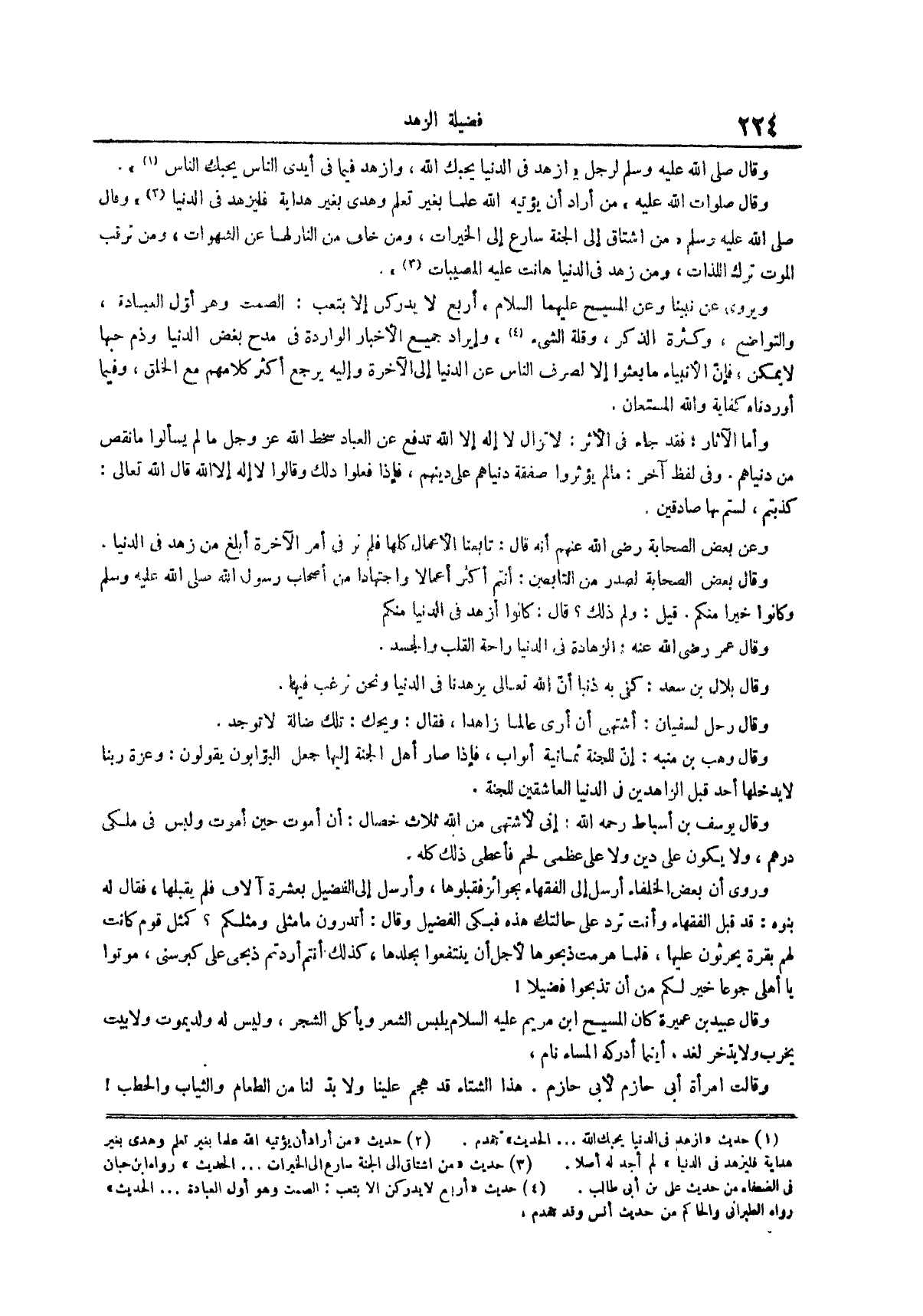 وقال صلى الله عليه وسلم لرجل ازْهَدْ فِي الدُّنْيَا يُحِبَّكَ اللَّهُ وَازْهَدْ فِيمَا في أيدي الناس يحبك الناس (¬1) وَقَالَ صَلَّى اللَّهُ عَلَيْهِ وَسَلَّمَ مَنْ أَرَادَ أن يؤتيه الله علماً بغير تعلم وهدى بغير هداية فليزهد في الدنيا (¬2) وقال صلى الله عليه وسلم من اشتاق إلى الجنة سارع إلى الخيرات ومن خاف من النار لها عن الشهوات ومن ترقب الموت ترك اللذات ومن زهد في الدنيا هانت عليه المصيبات (¬3)