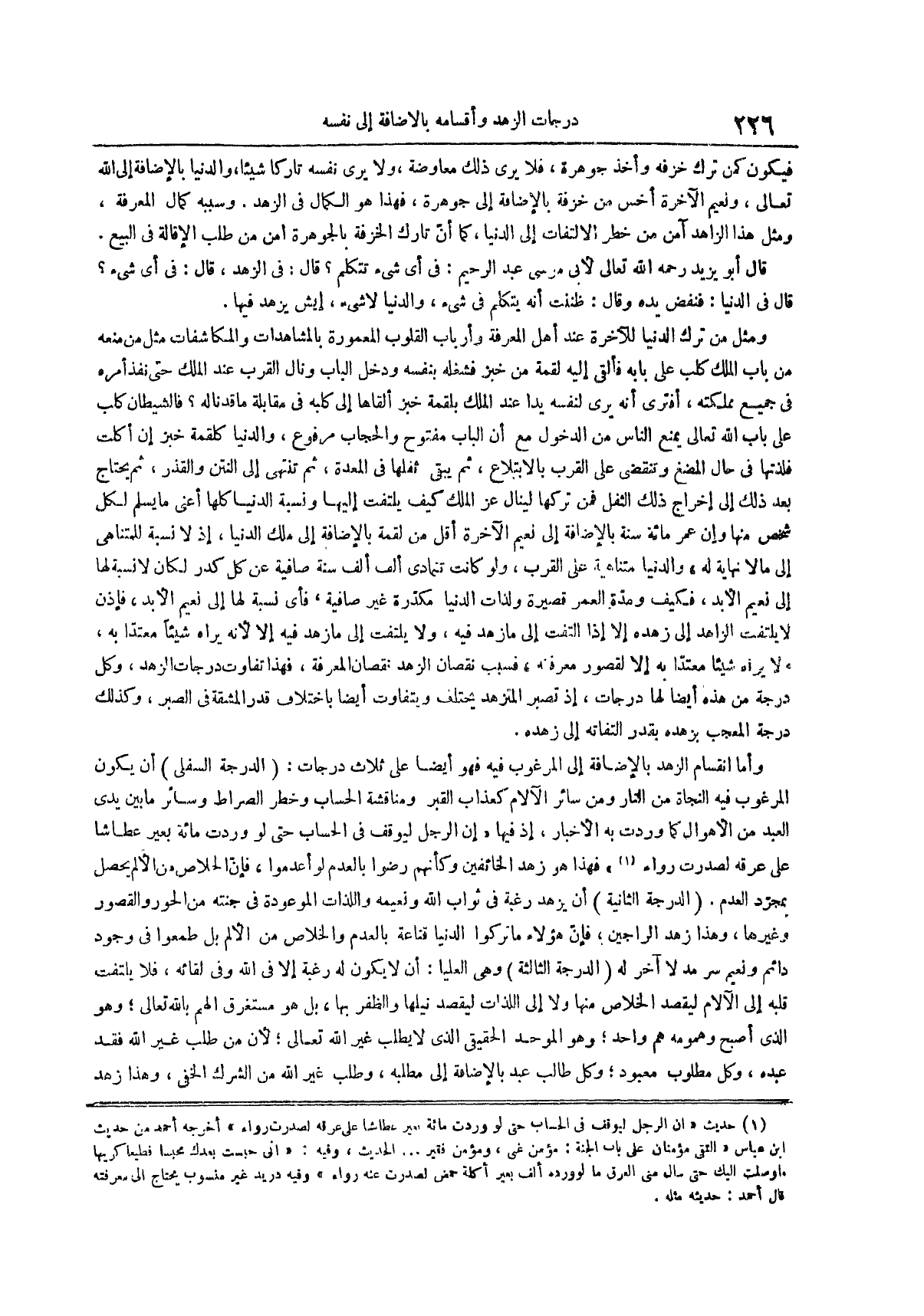 وأما انقسام الزهد بالإضافة إلى المرغوب فيه فهو أيضاً على ثلاث درجات الدرجة السفلى أن يكون المرغوب فيه النجاة من النار ومن سائر الآلام كعذاب القبر ومناقشة الحساب وخطر الصراط وسائر ما بين يدي العبد من الأهوال كما وردت به الأخبار إذ فيها إن الرجل ليوقف في الحساب حتى لو وردت مائة بعير عطاشاً على عرقه لصدرت رواء (¬1) فهذا هو زهد الخائفين وكأنهم رضوا بالعدم لو أعدموا فإن الخلاص من الألم يحصل بمجرد العدم