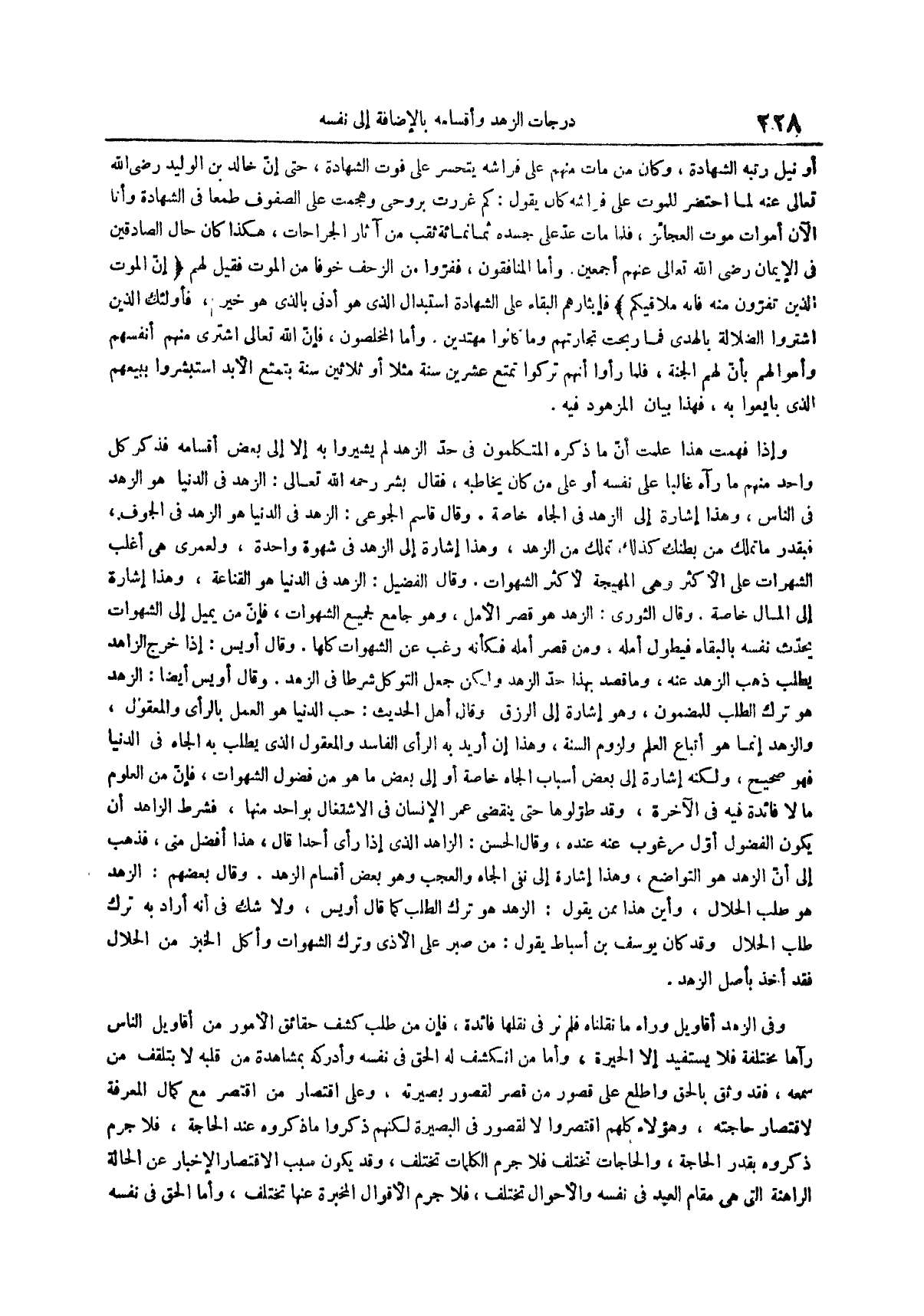 وقال أويس أيضاً الزهد هو ترك الطلب للمضمون وهو إشارة إلى الرزق وقال أهل الحديث حب الدنيا هو العمل بالرأي والمعقول والزهد إنما هو أتباع العلم ولزوم السنة وهذا إن أريد به الرأي الفاسد والمعقول الذي يطلب به الجاه في الدنيا فهو صحيح ولكنه إشارة إلى بعض أسباب الجاه خاصة أو إلى بعض ما هو من فضول الشهوات فإن من العلوم ما لا فائدة فيه في الآخرة وقد طولوها حتى ينقضي عمر الإنسان في الاشتغال بواحد منها فشرط الزاهد أن يكون الفضول أول مرغوب عنه عنده وقال الحسن الزاهد الذى إذا رأى أحداً قال هذا أفضل مني فذهب إلى أن الزهد هو التواضع وهذا إشارة إلى نفي الجاه والعجب وهو بعض أقسام الزهد وقال بعضهم الزهد هو طلب الحلال وأين هذا ممن يقول الزهد هو ترك الطلب كما قال أويس ولا شك في أنه أراد به ترك طلب الحلال وقد كان يوسف بن أسباط يقول من صبر على الأذى وترك الشهوات وأكل الخبز من الحلال فقد أخذ بأصل الزهد