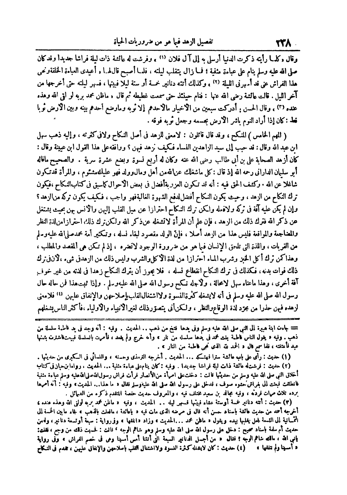 المهم الخامس المنكح وقد قال قائلون لا معنى للزهد في أصل النكاح ولا في كثرته وإليه ذهب سهل ابن عبد الله وقال قد حبب إلى سيد الزاهدين النساء فكيف نزهد فيهن ووافقه على هذا القول ابن عيينة وقال كان أزهد الصحابة عَلِيُّ بْنُ أَبِي طَالِبٍ رَضِيَ اللَّهُ عَنْهُ وكان له أربع نسوة وبضع عشرة سرية