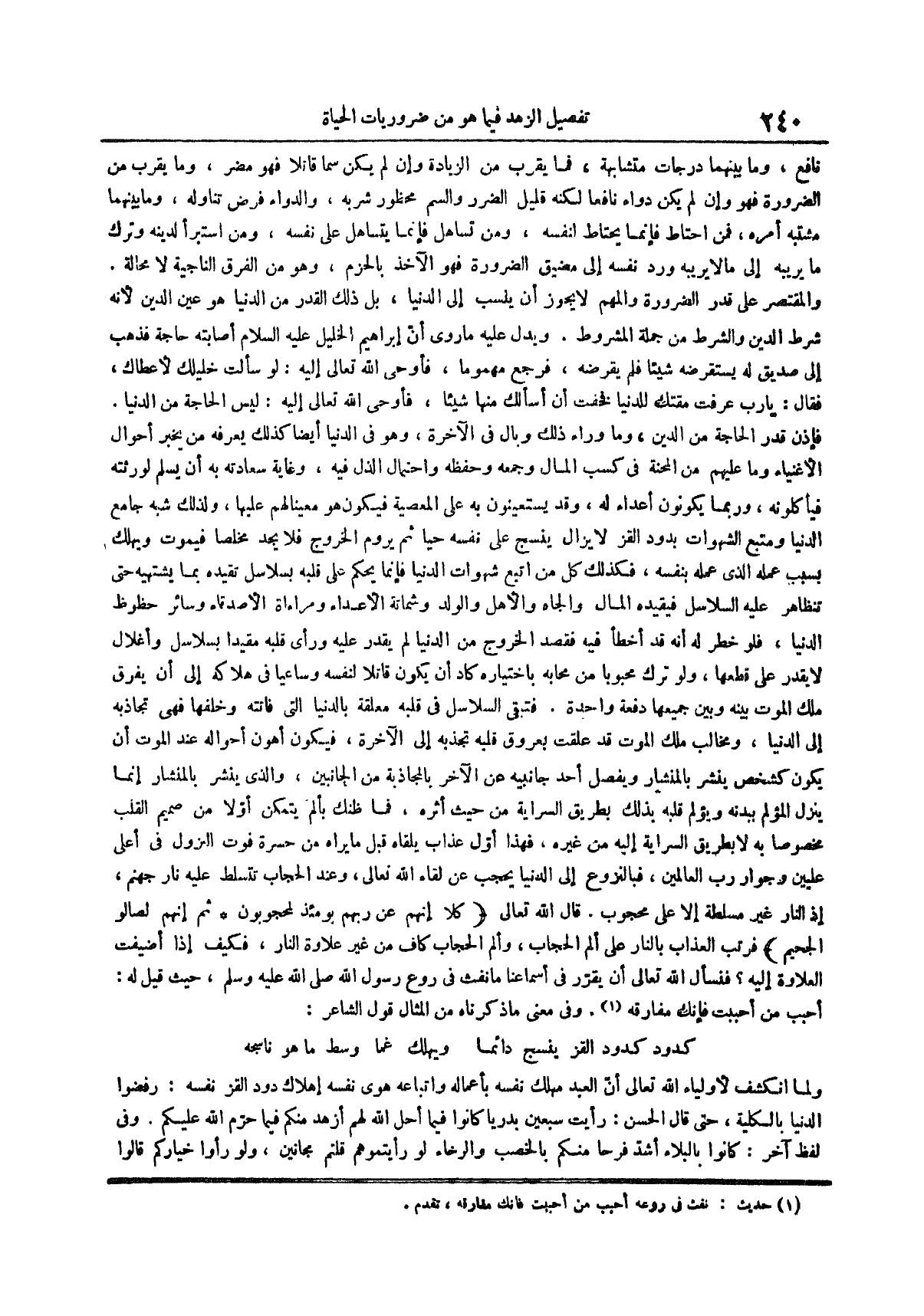 ويدل عليه ما روي أن إبراهيم الخليل عليه السلام أصابته حاجة فذهب إلى صديق له يستقرضه شيئاً فلم يقرضه فرجع مهموما فأوحى الله تعالى إليه لو سألت خليلك لأعطاك فقال يا رب عرفت مقتك للدنيا فخفت أن أسألك منها شيئاً فأوحى الله تعالى إليه ليس الحاجة من الدنيا فإذن قدر الحاجة من الدين وما وراء ذلك وبال في الآخرة وهو في الدنيا أيضاً كذلك يعرفه من يخبر أحوال الأغنياء وما عليهم من المحنة في كسب المال وجمعه وحفظه واحتمال الذل فيه وغاية سعادته به أن يسلم لورثته فيأكلون وربما يكونون أعداء له وقد يستعينون به على المعصية فيكون هو معيناً لهم عليها ولذلك شبه جامع الدنيا ومتبع الشهوات بدود القز لا يزال ينسج على نفسه حياً ثم يروم الخروج فلا يجد مخلصاً فيموت ويهلك بسبب عمله الذي عمله بنفسه فكذلك كل من اتبع شهوات الدنيا فإنما يحكم على قلبه بسلاسل تقيده بما يشتهيه حتى تتظاهر عليه السلاسل فيقيده المال والجاه والأهل والولد وشماتة الأعداء ومراءاة الأصدقاء وسائر حظوظ الدنيا فلو خطر له أنه قد أخطأ فيه فقصد الخروج من الدنيا لم يقدر عليه ورأى قلبه مقيداً بسلاسل وأغلال لا يقدر على قطعها ولو ترك محبوباً من محابه باختياره كاد أن يكون قاتلاً لنفسه وساعياً في هلاكه إلى أن يفرق ملك الموت بينه وبين جميعها دفعة واحدة