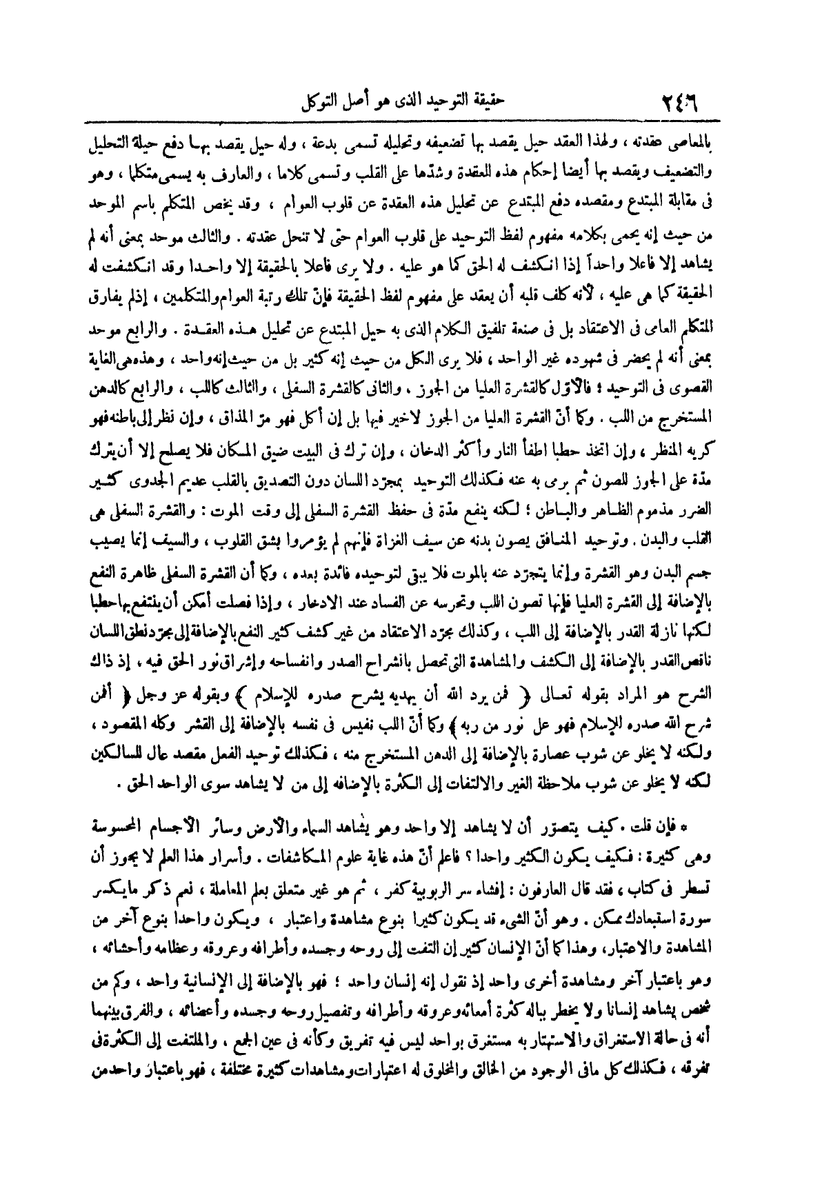 وتوحيد المنافق يصون بدنه عن سيف الغزاة فإنهم لم يؤمروا بشق القلوب والسيف إنما يصيب جسم البدن وهو القشرة وإنما يتجرد عنه بالموت فلا يبقى لتوحيده فائدة بعده وكما أن القشرة السفلى ظاهرة النفع بالإضافة إلى القشرة العليا فإنها تصون اللب وتحرسه عن الفساد عند الادخار وإذا فصلت أمكن أن ينتفع بها حطباً لكنها نازلة القدر بالإضافة إلى اللب وكذلك مجرد الاعتقاد من غير كشف كثير النفع بالإضافة إلى مجرد نطق اللسان ناقص القدر بالإضافة إلى الكشف والمشاهدة التي تحصل بانشراح الصدر وانفساحه وإشراق نور الحق فيه إذ ذاك الشرح هو المراد بقوله تعالى {فمن يرد الله أن يهديه يشرح صدره للإسلام} وبقوله عز وجل {أفمن شرح الله صدره للإسلام فهو على نور من ربه} وكما أن اللب نفيس في نفسه بالإضافة إلى القشر وكله المقصود ولكنه لا يخلو عن شوب عصارة بالإضافة إلى الدهن المستخرج منه فكذلك توحيد الفعل مقصد عال للسالكين لكنه لا يخلو عن شوب ملاحظة الغير والالتفات إلى الكثرة بالإضافة إلى من لا يشاهد سوى الواحد الحق
