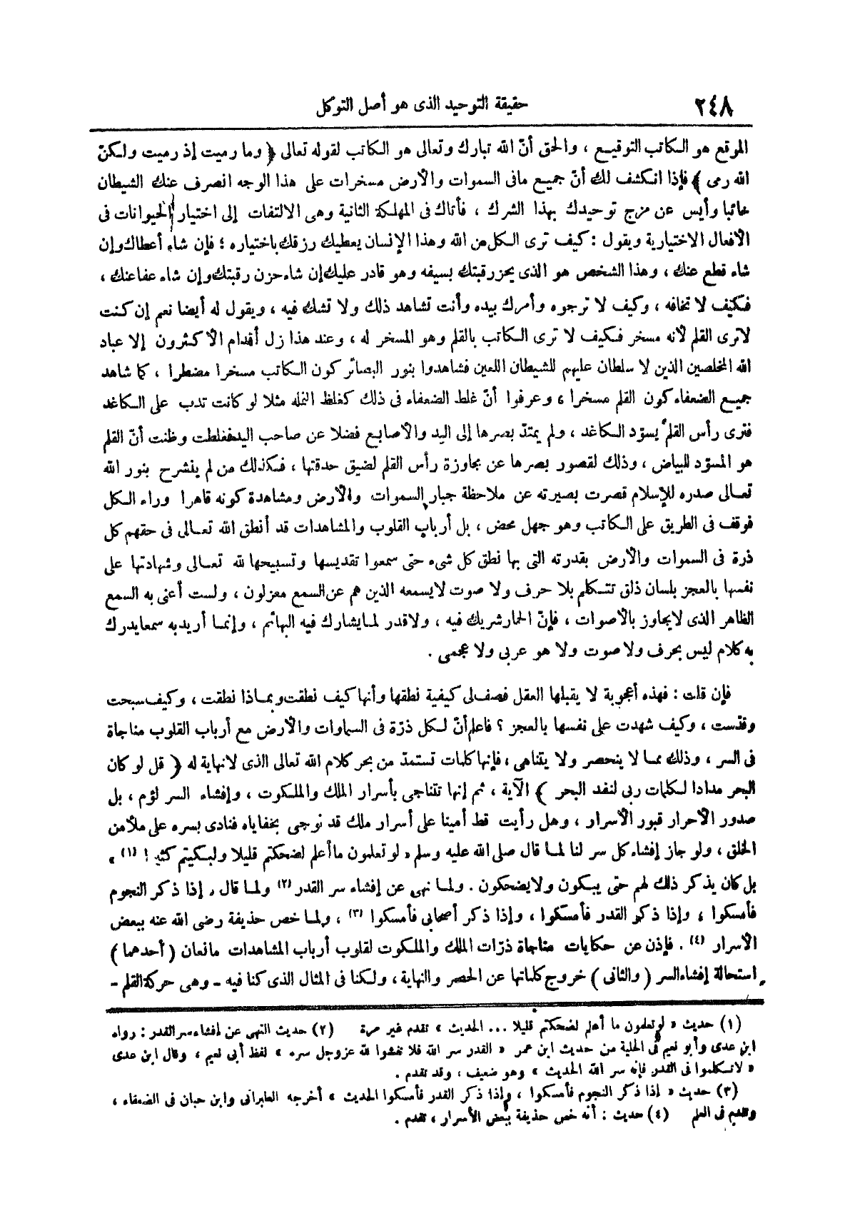 ولما نهى عن إفشاء سر القدر (¬2) ولما قال إذا ذكر النجوم فأمسكوا وإذا ذكر القدر فأمسكوا وإذا ذكر أصحابي فأمسكوا (¬3) ولما خص حذيفة رضي الله عنه ببعض الأسرار (¬4) فإذن عن حكايات مناجاة ذرات الملك والملكوت لقلوب أرباب المشاهدات مانعان أحدهما استحالة إفشاء السر والثاني خروج كلماتها عن الحصر والنهاية ولكنا في المثال الذي كنا فيه وهي حركة القلم