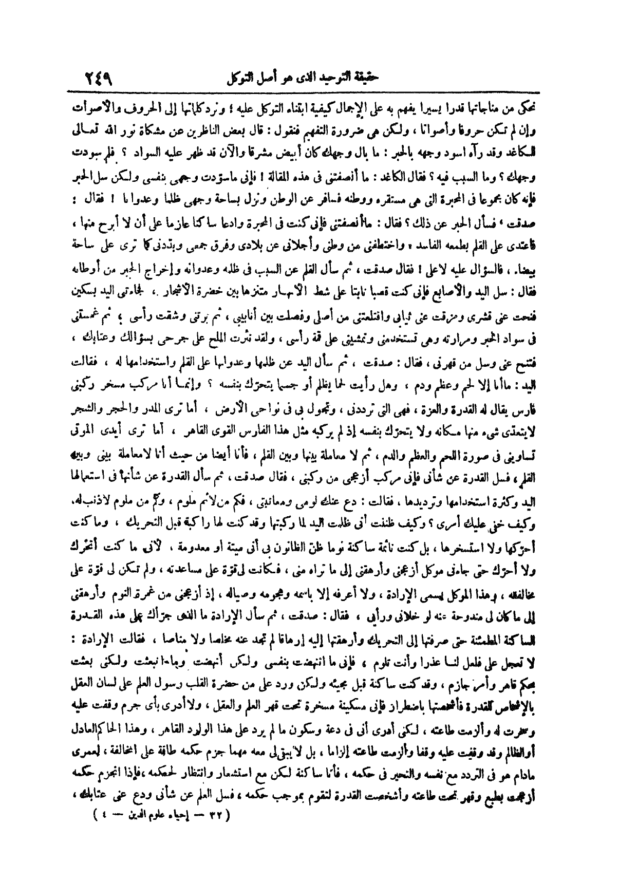 نحكى من مناجاتها قدراً يسيراً يفهم به على الإجمال كيفية ابتناء التوكل عليه ونرد كلماتها إلى الحروف والأصوات وإن لم تكن حروفاً وأصواتاً ولكن هي ضرورة التفهيم فنقول قال بعض الناظرين عن مشكاة نور الله تعالى للكاغد وقد رآه اسود وجهه بالحبر ما بال وجهك كان أبيض مشرقاً والآن قد ظهر عليه السواد فلم سودت وجهك وما السبب فيه فقال الكاغد ما انصفتني في هذه المقالة فإني ما سودت وجهي بنفسي ولكن سل الحبر فإنه كان مجموعاً في المحبرة التي هي مستقره ووطنه فسافر عن الوطن ونزل بساحة وجهي ظلما وعدوا فقال صدقت فسأل الحبر عن ذلك فقال ما أنصفتني فإني كنت في المحبرة وادعاً ساكناً عازماً على أن لا أبرح منها فاعتدى علي القلم بطمعه الفاسد واختطفني من وطني وأجلاني عن بلادي وفرق جمعي وبدني كما ترى على ساحة بيضاء فالسؤال عليه لا علي فقال صدقت ثم سأل القلم عن السبب في ظلمه وعدوانه وإخراج الحبر من أوطانه فقال سل اليد والأصابع فإني كنت قصباً نابتاً على شط الأنهار متنزهاً بين خضرة الأشجار فجاءتني اليد بسكين فنحت عني قشري ومزقت عني ثيابي واقتلعتني من أصلي وفصلت بين أنابيبي ثم برتني وشقت رأسي ثم غمستني في سواد الخبر ومرارته وهي تستخدمني وتمشيني على قمة رأسي ولقد نثرت الملح على جرحي بسؤالك وعتابك فتنح عني وسل من قهرني فقال صدقت ثم سأل اليد عن ظلمها وعدولها على القلم واستخدامها له فقالت اليد ما أنا إلا لحم وعظم ودم وهل رأيت لحماً يظلم أو جسماً يتحرك بنفسه وإنما أنا مركب مسخر ركبني فارس يقال له القدرة والعزة فهي التي ترددني وتجول بي في نواحي الأرض أما ترى المدر والحجر والشجر لا يتعدى شيئا منها مكانه ولا يتحرك بنفسه إذ لم يركبه مثل هذا الفارس القوي القاهر أما ترى أيدي الموتى تساويني في صورة اللحم والعظم والدم ثم لا معاملة بينها وبين القلم فأنا أيضاً من حيث أنا لا معاملة بيني وبين القلم فسل القدرة عن شأني فإني مركب أزعجي من ركبني فقال صدقت ثم سأل القدرة عن شأنها في استعمالها اليد وكثرة استخدامها وترديدها فقالت دع عنك لومي ومعاتبتي فكم من لائم ملوم وكم من ملوم لا ذنب له وكيف خفي عليك أمري وكيف ظننت أني ظلمت اليد لما ركبتها وقد كنت لها راكبة قبل التحريك وما كنت أحركها ولا أستسخرها بل كنت نائمة ساكنة نوماً ظن الظانون بي أني ميتة أو معدومة لأني ما كنت أتحرك ولا أحرك حتى جاءني موكل أزعجني وأرهقني إلى ما تراه مني فكانت لي قوة على مساعدته ولم تكن لي قوة على مخالفته وهذا الموكل يسمى الإرادة ولا أعرفه إلا باسمه وهجومه وصياله إذ أزعجني من غمرة النوم وأرهقني إلى ما كان لي مندوحة عنه لو خلاني ورأبي فقال صدقت ثم سأل الإرادة ما الذي جرأك على هذه القدرة الساكنة المطمئنة حتى صرفتها إلى التحريك وأرهقتها إليه إرهاقا لم تجد عنه مخلصاً ولا مناصاً فقالت الإرادة لا تعجل علي فلعل لنا عذراً وأنت تلوم فإني ما انتهضت بنفسي ولكني انهضت وما أن انبعثت ولكني بعثت بحكم قاهر وأمر جازم وقد كنت ساكنة قبل مجيئه ولكن ورد علي من حضرة القلب رسول العلم على لسان العقل بالإشخاص للقدرة فأشخصتها باضطرار فإني مسكينة مسخرة تحت قهر العلم والعقل ولم أدري بأي جرم وقفت عليه وسخرت له وألزمت طاعته لكني أدري أني في دعة وسكون مالم يرد على هذا الولود القاهر وهذا الحاكم العادل أو الظالم وقد وقفت عليه وقفا وألزمت طاعته إلزاماً بل لا يبقى لي معه مهما جزم حكمه طاقة على المخالفة لعمري ما دام هو في التردد مع نفسه والتحير في حكمه فأنا ساكنة لكن مع استشعار وانتظار لحكمه فإذا انجزم حكمه أزعجت بطبع وقهر تحت طاعته وأشخصت القدرة لتقوم بموجب حكمه فسل العلم عن شأني ودع عني عتابك