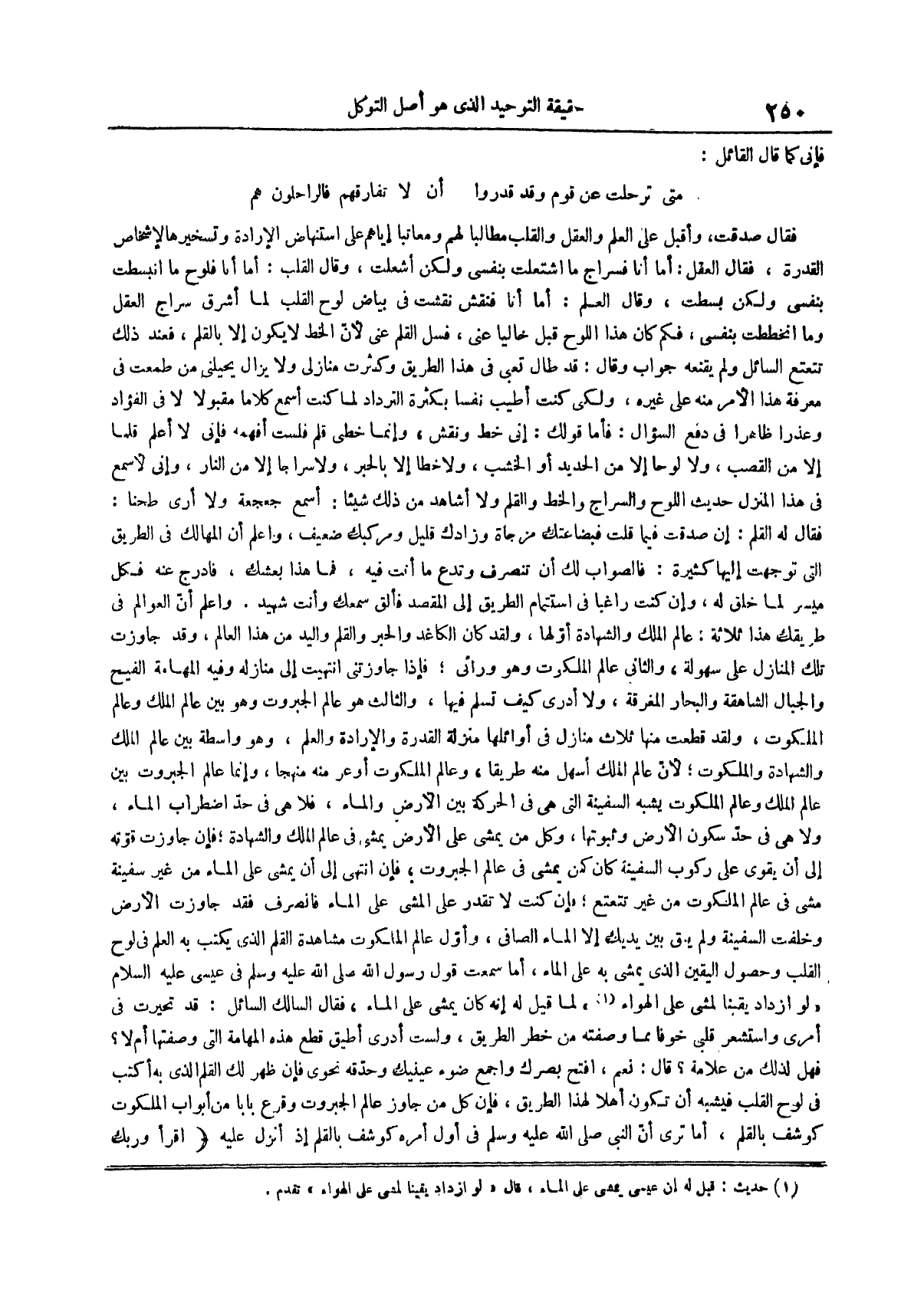 واعلم أن العوالم في طريقك هذا ثلاثة عالم الملك والشهادة أولها ولقد كان الكاغد والحبر والقلم واليد من هذا العالم وقد جاوزت تلك المنازل على سهولة والثاني عالم الملكوت وهو ورائي فإذا جاوزتني انتهيت إلى منازله وفيه المهامة الفيح والجبال الشاهقة والبحار المغرقة ولا أدري كيف تسلم فيها والثالث هو عالم الجبروت وهو بين عالم الملك وعالم الملكوت ولقد قطعت منها ثلاث منازل في أوائلها منزلة القدرة والإرادة والعلم وهو واسطة بين عالم الملك والشهادة والملكوت لأن عالم الملك أسهل منه طريقاً وعالم الملكوت أوعر منه منهجاً وإنما عالم الجبروت بين عالم الملك وعالم الملكوت يشبه السفينة التي هي في الحركة بين الأرض والماء فلا هي في حد اضطراب الماء ولا هي في حد سكون الأرض وثبرتها وكل من يمشي على الأرض يمشى في عالم الملك والشهادة فإن جاوزت قوته إلى أن يقوى على ركوب السفينة كان كمن يمشي في عالم الجبروت فإن انتهى إلى أن يمشي على الماء من غير سفينة مشى في عالم الملكوت من غير تتعتع فإن كنت لا تقدر على المشي على الماء فانصرف فقد جاوزت الأرض وخلفت السفينة ولم يبق بين يديك إلا الماء الصافي وأول عالم الملكوت مشاهدة القلم الذي يكتب به العلم في لوح القلب وحصول اليقين الذي يمشي به على الماء أما سمعت قول رسول الله صلى الله عليه وسلم في عيسى عليه السلام لو ازداد يقيناً لمشي على الهواء (¬1) لما قيل له إنه كان يمشي على الماء فقال السالك السائل قد تحيرت في أمري واستشعر قلبي خوفاً مما وصفته من خطر الطريق ولست أدري أطيق قطع هذه المهامة التي وصفتها أم لا فهل لذلك من علامة قال نعم افتح بصرك واجمع ضوء عينيك وحدقهنحوي فإن ظهر لك القلم الذي به أكتب في لوح القلب فيشبه أن تكون أهلاً لهذا الطريق فإن كل من جاوز عالم الجبروت وقرع باباً من أبواب الملكوت كوشف بالقلم أما ترى أن النبي صلى الله عليه وسلم في أول أمره كوشف بالقلم إذ أنزل عليه اقرأ وربك