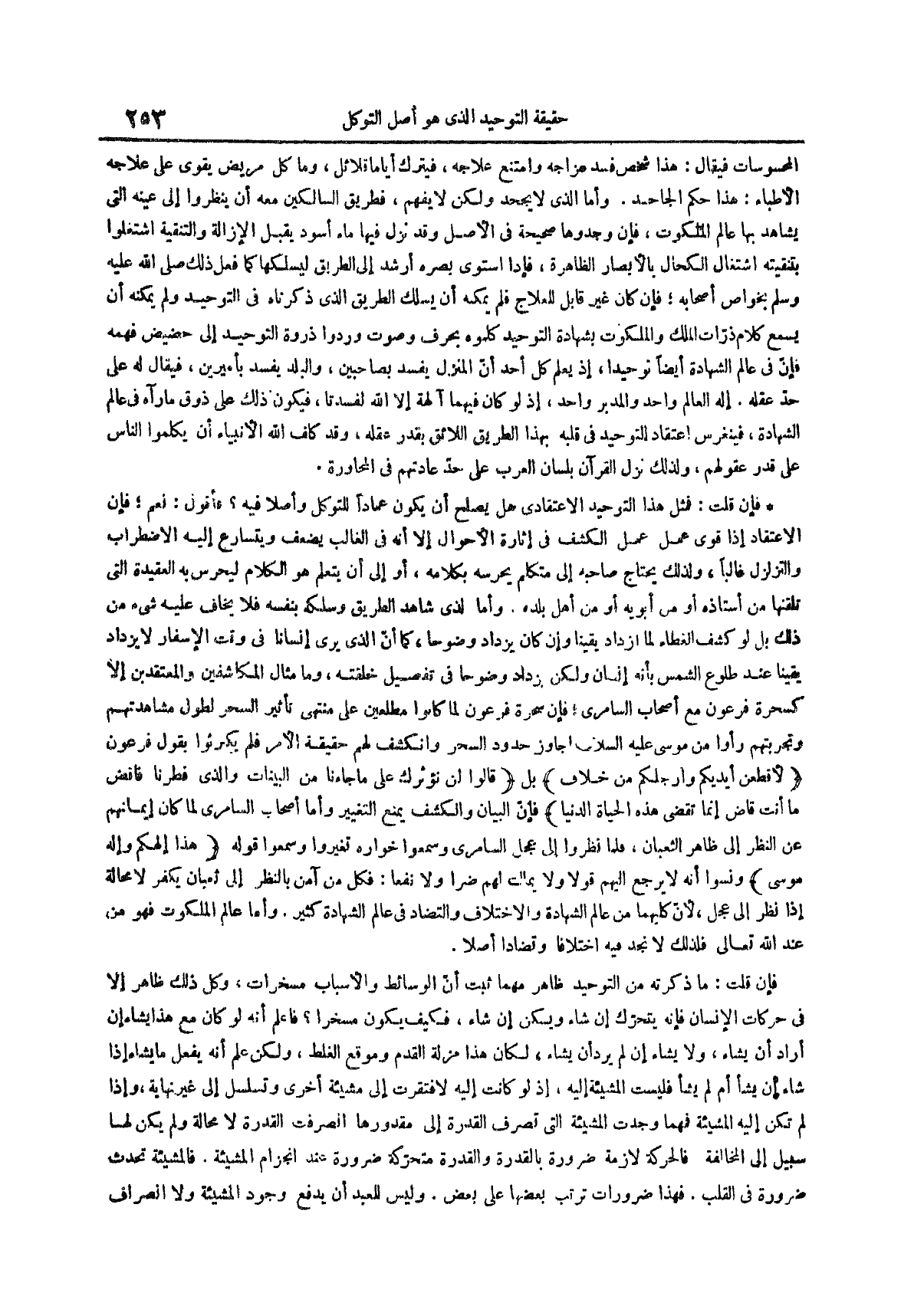 فإن قلت فمثل هذا التوحيد الاعتقادي هل يصلح أن يكون عماداً للتوكل وأصلاً فيه فأقول نعم فإن الاعتقاد إذا قوي عَمِلَ عَمَلَ الكشف في إثارة الأحوال إلا أنه في الغالب يضعف ويتسارع إليه الاضطراب والتزلزل غالباً ولذلك يحتاج صاحبه إلى متكلم يحرسه بكلامه أو إلى أن يتعلم هو الكلام ليحرس به العقيدة التي تلقنها من أستاذه أو من أبويه أو من أهل بلده