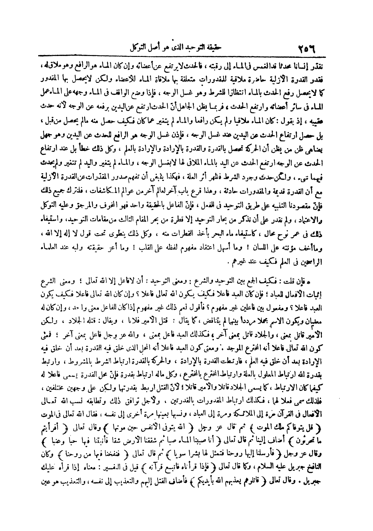 فإن قلت فكيف الجمع بين التوحيد والشرع ومعنى التوحيد أن لا فاعل إلا الله تعالى ومعنى الشرع إثبات الأفعال للعباد فإن كان العبد فاعلاً فكيف يكون الله تعالى فاعلاً وإن كان الله تعالى فاعلا فكيف يكون العبد فاعلاً ومفعول بين فاعلين غير مفهوم فأقول نعم ذلك غير مفهوم إذا كان للفاعل معنى واحد وإن كان له معنيان ويكون الاسم مجملاً مردداً بينهما لم يتناقض كما يقال قتل الأمير فلاناً ويقال قتله الجلاد ولكن الأمير قاتل بمعنى والجلاد قاتل بمعنى آخر فكذلك العبد فاعل بمعنى والله عز وجل فاعل بمعنى آخر فمعنى كون الله تعالى فاعلا أنه المخترع الموجد ومعنى كون العبد فاعلاً أنه المحل الذي خلق فيه القدرة بعد أن خلق فيه الإرادة بعد أن خلق فيه العلم فارتبطت القدرة بالإرادة والحركة بالقدرة ارتباط الشرط بالمشروط وارتبط بقدرة الله ارتباط المعلول بالعلة وارتباط المخترع بالمخترع وكل ما له ارتباط بقدرة فإن محل القدرة يسمى فاعلاً له كيفما كان الارتباط كما يسمى الجلاد قاتلاً والأمير قاتلاً لأن القتل ارتبط بقدرتهما ولكن على وجهين مختلفين فلذلك سمي فعلاً لهما فكذلك ارتباط المقدورات بالقدرتين ولأجل توافق ذلك وتطابقه نسب الله تعالى الأفعال في القرآن مرة إلى الملائكة ومرة إلى العباد ونسبها بعينها مرة أخرى إلى نفسه فقال الله تعالى في الموت قل يتوفاكم ملك الموت ثم قال عز وجل الله يتوفى الأنفس حين موتها وقال تعالى أفرأيتم ما تحرثون أضاف إلينا ثم قَالَ تَعَالَى أَنَّا صَبَبْنَا الْمَاءَ صَبًّا ثُمَّ شَقَقْنَا الْأَرْضَ شَقًّا فَأَنْبَتْنَا فِيهَا حَبًّا وَعِنَبًا وقال عز وجل فأرسلنا إليها روحنا فتمثل لها بشراً سوياً ثم قال تعالى فنفخنا فيها من روحنا وكان النافخ جبريل عليه السلام وكما قال تعالى فإذا قرأناه فاتبع قرآنه قيل في التفسير معناه إذا قرأه عليك جبريل وقال تعالى قاتلوهم يعذبهم الله بأيديكم فأضاف القتل إليهم والتعذيب إلى نفسه والتعذيب هو عين