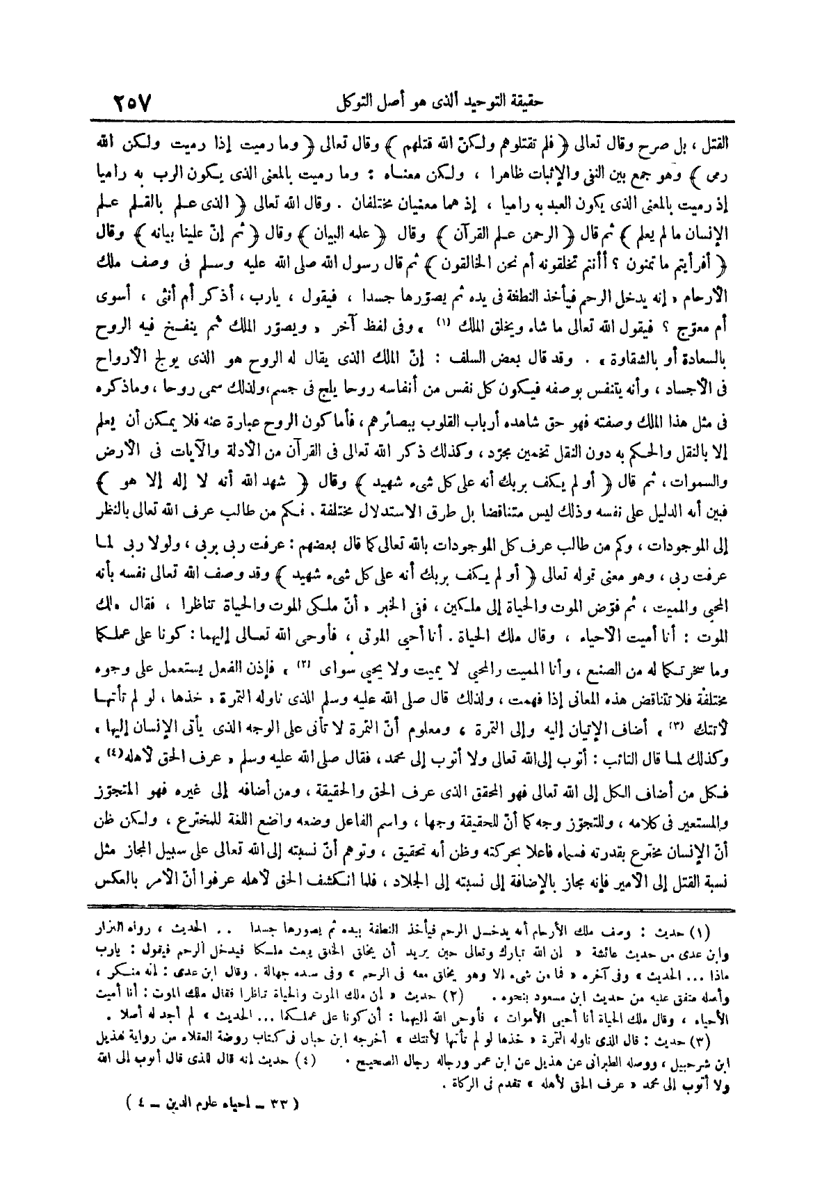 فكم من طالب عرف الله تعالى بالنظر إلى الموجودات وكم من طالب عرف كل الموجودات بالله تعالى كما قال بعضهم عرفت ربي بربي ولولا ربي لما عرفت ربي وهو معنى قوله تعالى أو لم يكف بربك أنه على كل شيء شهيد وقد وصف الله تعالى نفسه بأنه المحيي والمميت ثم فوض الموت والحياة إلى ملكين ففي الخبر أن ملكي الموت والحياة تناظرا فقال ملك الموت أنا أميت الأحياء وقال ملك الحياة أنا أحيي الموتى فأوحى الله تعالى إليهما كونا على عملكما وما سخرتكما له من الصنع وأنا المميت والمحيي لا يميت ولا يحيي سواي (¬2) فإذن الفعل يستعمل على وجوه مختلفة فلا تتناقض هذه المعاني إذا فهمت ولذلك قال صلى الله عليه وسلم للذي ناوله التمرة خذها لو لم تأتها لأتتك (¬3) أضاف الإتيان إليه وإلى التمرة ومعلوم أن التمرة لا تأتي على الوجه الذي يأتي الإنسان إليها وكذلك لما قال التائب أتوب إلى الله تعالى ولا أتوب إلى محمد فقال صلى الله عليه وسلم عرف الحق لأهله (¬4) فكل من أضاف الكل إلى الله تعالى فهو المحقق الذي عرف الحق والحقيقة ومن أضافه إلى غيره فهو المتجوز والمستعير في كلامه وللتجوز وجه كما أن للح 4 قيقة وجهاً واسم الفاعل وضعه واضع اللغة للمخترع ولكن ظن أن الإنسان مخترع بقدرته فسماه فاعلاً بحركته وظن أنه تحقيق وتوهم أن نسبته إلى الله تعالى على سبيل المجاز مثل نسبة القتل إلى الأمير فإنه مجاز بالإضافة إلى نسبته إلى الجلاد فلما انكشف الحق لأهله عرفوا أن الأمر بالعكس