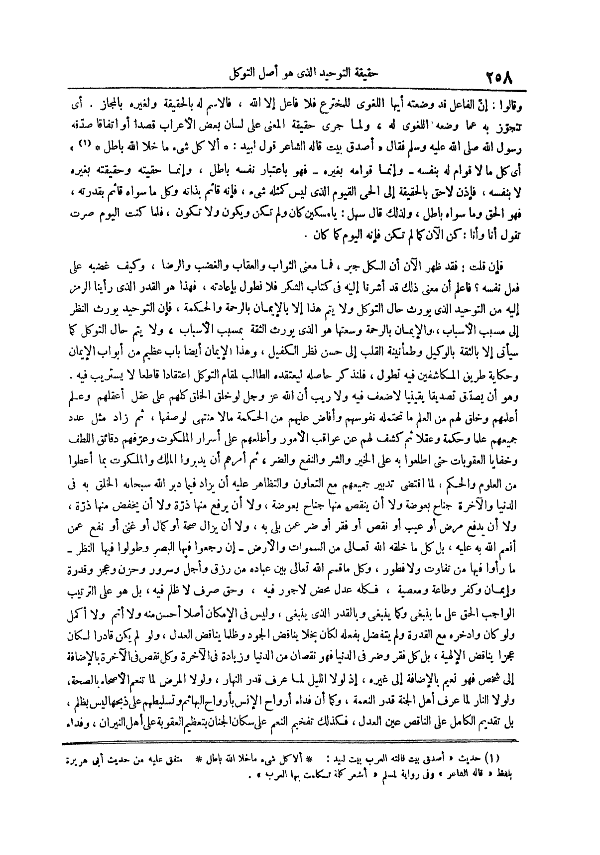 وهو أن يصدق تصديقاً يقينياً لا ضعف فيه ولا ريب إن الله عز وجل لو خلق الخلق كلهم على عقل أعقلهم وعلم أعلمهم وخلق لهم من العلم ما تحتمله نفوسهم وأفاض عليهم من الحكمة مالا منتهى لوصفها ثم زاد مثل عدد جميعهم علماً وحكمة وعقلاً ثم كشف لهم عن عواقب الأمور وأطلعهم على أسرار الملكوت وعرفهم دقائق اللطف وخفايا العقوبات حتى اطلعوا به على الخير والشر والنفع والضر ثم أمرهم أن يدبروا الملك والملكوت بما أعطوا من العلوم والحكم لما اقتضى تدبير جميعهم مع التعاون والتظاهر عليه أن يزاد فيما دبر الله سبحانه الخلق به في الدنيا والآخرة جناح بعوضة ولا أن ينقص منها جناح بعوضة ولا أن يرفع منها ذرة ولا أن يخفض منها ذرة ولا أن يدفع مرض أو عيب أو نقص أو فقر أو ضر عمن بلي به ولا أن يزال صحة أو كمال أو غنى أو نفع عمن أنعم الله به عليه بل كل ما خلقه الله تعالى من السموات والأرض إن رجعوا فيها البصر وطولوا فيها النظر ما رأوا فيها من تفاوت ولا فطور وكل ما قسم الله تعالى بين عباده من رزق وأجل وسرور وحزن وعجز وقدرة وإيمان وكفر وطاعة ومعصية فكله عدل محض لا جور فيه وحق صرف لا ظلم فيه بل هو على الترتيب الواجب الحق على ما ينبغي وكما ينبغي بالقدر الذي ينبغي وليس في الإمكان أصلاً أحسن منه ولا أتم ولا أكمل ولو كان وادخره مع القدرة ولم يتفضل بفعله لكان بخلاً يناقض الجود وظلماً يناقض العدل ولو لم يكن قادراً لكان عجزاً يناقض الإلهية بل كل فقر وضر في الدنيا فهو نقصان من الدنيا وزيادة في الآخرة وكل نقص في الآخرة بالإضافة إلى شخص فهو نعيم بالإضافة إلى غيره إذ لولا الليل لما عرف قدر النهار ولولا المرض لما تنعم الأصحاء بالصحة ولولا النار لما عرف أهل الجنة قدر النعمة وكما أن فداء أرواح الإنس بأرواح البهائم وتسليطهم على ذبحها ليس بظلم بل تقديم الكامل على الناقص عين العدل فكذلك تفخيم النعم على سكان الجنان بتعظيم العقوبة على أهل النيران وفداء