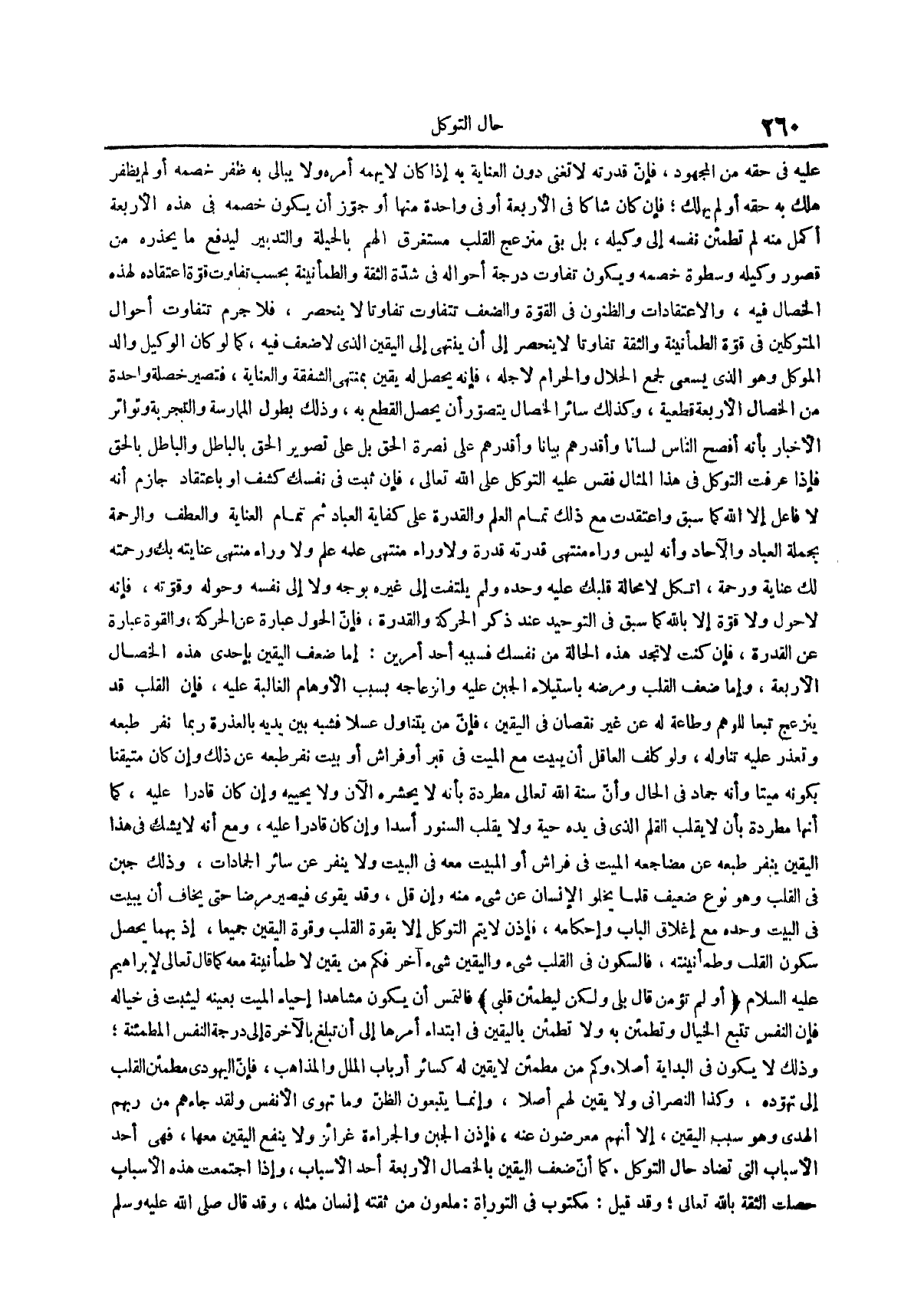 عليه في حقه من المجهود فإن قدرته لا تغني دون العناية به إذا كان لا يهمه أمره ولا يبالي به ظفر خصمه أو لم يظفر هلك به حقه أو لم يهلك فإن كان شاكاً في الأربعة أو في واحدة منها أو جوز أن يكون خصمه في هذه الأربعة أكمل منه لم تطمئن نفسه إلى وكيله بل بقي منزعج القلب مستغرق الهم بالحيلة والتدبير ليدفع ما يحذره من قصور وكيله وسطوة خصمه ويكون تفاوت درجة أحواله في شدة الثقة والطمأنينة بحسب تفاوت قوة اعتقاده لهذه الخصال فيه والاعتقادات والظنون في القوة والضعف تتفاوت تفاوتا لا ينحصر فلا جرم تتفاوت أحوال المتوكلين في قوة الطمأنينة والثقة تفاوتاً لا ينحصر إلى أن ينتهي إلى اليقين الذي لا ضعف فيه كما لو كان الوكيل والد الموكل وهو الذي يسعى لجمع الحلال والحرام لأجله فإنه يحصل له يقين بمنتهى الشفقة والعناية فتصير خصلة واحدة من الخصال الأربعة قطعية وكذلك سائرا الخصال يتصور أن يحصل القطع به وذلك بطول الممارسة والتجربة وتواتر الأخبار بأنه أفصح الناس لساناً وأقدرهم بيانا وأقدرهم على نصرة الحق بل على تصوير الحق بالباطل والباطل بالحق فإذا عرفت التوكل في هذا المثال فقس عليه التوكل على الله تعالى فإن ثبت في نفسك كشف أو باعتقاد جازم أنه لا فاعل إلا الله كما سبق واعتقدت مع ذلك تمام العلم والقدرة على كفاية العباد ثم تمام العناية والعطف والرحمة بجملة العباد والآحاد وأنه ليس وراء منتهى قدرته قدرة ولا وراء منتهى علمه علم ولا وراء منتهى عنايته بك ورحمته لك عناية ورحمة اتكل لا محالة قلبك عليه وحده ولم يلتفت إلى غيره بوجه ولا إلى نفسه وحوله وقوته فإنه لا حول ولا قوة إلا بالله كما سبق في التوحيد عند ذكر الحركة والقدرة فإن الحول عبارة عن الحركة والقوة عبارة عن القدرة فإن كنت لا تجد هذه الحالة من نفسك فسببه أحد أمرين إما ضعف اليقين بإحدى هذه الخصال الأربعة وإما ضعف القلب ومرضه باستيلاء الجبن عليه وانزعاجه بسبب الأوهام الغالبة عليه فإن القلب قد ينزعج تبعاً للوهم وطاعة له عن غير نقصان في اليقين فإن من يتناول عسلاً فشبه بين يديه بالعذرة ربما نفر طبعه وتعذر عليه تناوله ولو كلف العاقل أن يبيت مع الميت في قبر أو فراش أو بيت نفر طبعه عن ذلك وإن كان متيقناً بكونه ميتاً وأنه جماد في الحال وأن سنة الله تعالى مطردة بأنه لا يحشره الآن ولا يحييه وإن كان قادراً عليه كما أنها مطردة بأن لا يقلب القلم الذي في يده حية ولا يقلب السنور أسداً وإن كان قادراً عليه ومع أنه لا يشك في هذا اليقين ينفر طبعه عن مضاجعة الميت في فراش أو المبيت معه في البيت ولا ينفر عن سائر الجمادات وذلك جبن في القلب وهو نوع ضعيف فلما يخلو الإنسان عن شيء منه وإن قل وقد يقوى فيصير مرضاً حتى يخاف أن يبيت في البيت وحده مع إغلاق الباب وإحكامه فإذن لا يتم التوكل إلا بقوة القلب وقوة اليقين جميعاً إذ بهما يحصل سكون القلب وطمأنينته فالسكون في القلب شيء واليقين شيء آخر فكم من يقين لا طمأنينتة معه كما قال تعالى لإبراهيم عليه السلام {أو لم تؤمن قال بلى ولكن ليطمئن قلبي} فالتمس أن يكون مشاهداً إحياء الميت بعينه ليثبت في خياله فإن النفس تتبع الخيال وتطمئن به ولا تطمئن باليقين في ابتداء أمرها إلى أن تبلغ بالآخرة إلى درجة النفس المطمئنة وذلك لا يكون في البداية أصلاً وكم من مطمئن لا يقين له كسائر أرباب الملل والمذاهب فإن اليهودي مطمئن القلب إلى تهوده وكذا النصراني ولا يقين لهم أصلاً وإنما يتبعون الظن وما تهوى الأنفس ولقد جاءهم من ربهم الهدى وهو سبب اليقين إلا أنهم معرضون عنه فإذن الجبن والجراءة غرائز ولا ينفع اليقين معها فهي أحد الأسباب التي تضاد حال التوكل كما أن ضعف اليقين بالخصال الأربعة أحد الأسباب وإذا اجتمعت هذه الأسباب حصلت الثقة بالله تعالى وقد قيل مكتوب في التوراة ملعون من ثقته إنسان مثله وَقَدْ قَالَ صَلَّى اللَّهُ عَلَيْهِ وَسَلَّمَ