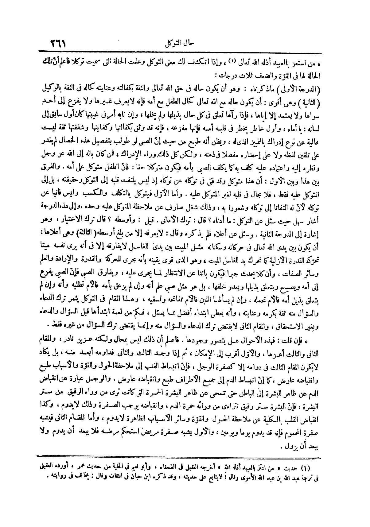 من استعز بالعبيد أذله الله تعالى // حدديث من اعتز بالعبيد أذلة الله أخرجه العقيلى في الضعفاء وأبو نعيم في الحلية من حديث عمر أورده العقيلي في ترجمة عبد الله بن عبد الله الأموي وقال لا يتابع على حديثه وقد ذكره ابن حبان في الثقات وقال يخالف في روايته وإذا انكشف لك معنى التوكل وعلمت الحالة التي سميت توكلاً فاعلم أن تلك الحالة لها في القوة والضعف ثلاث درجات