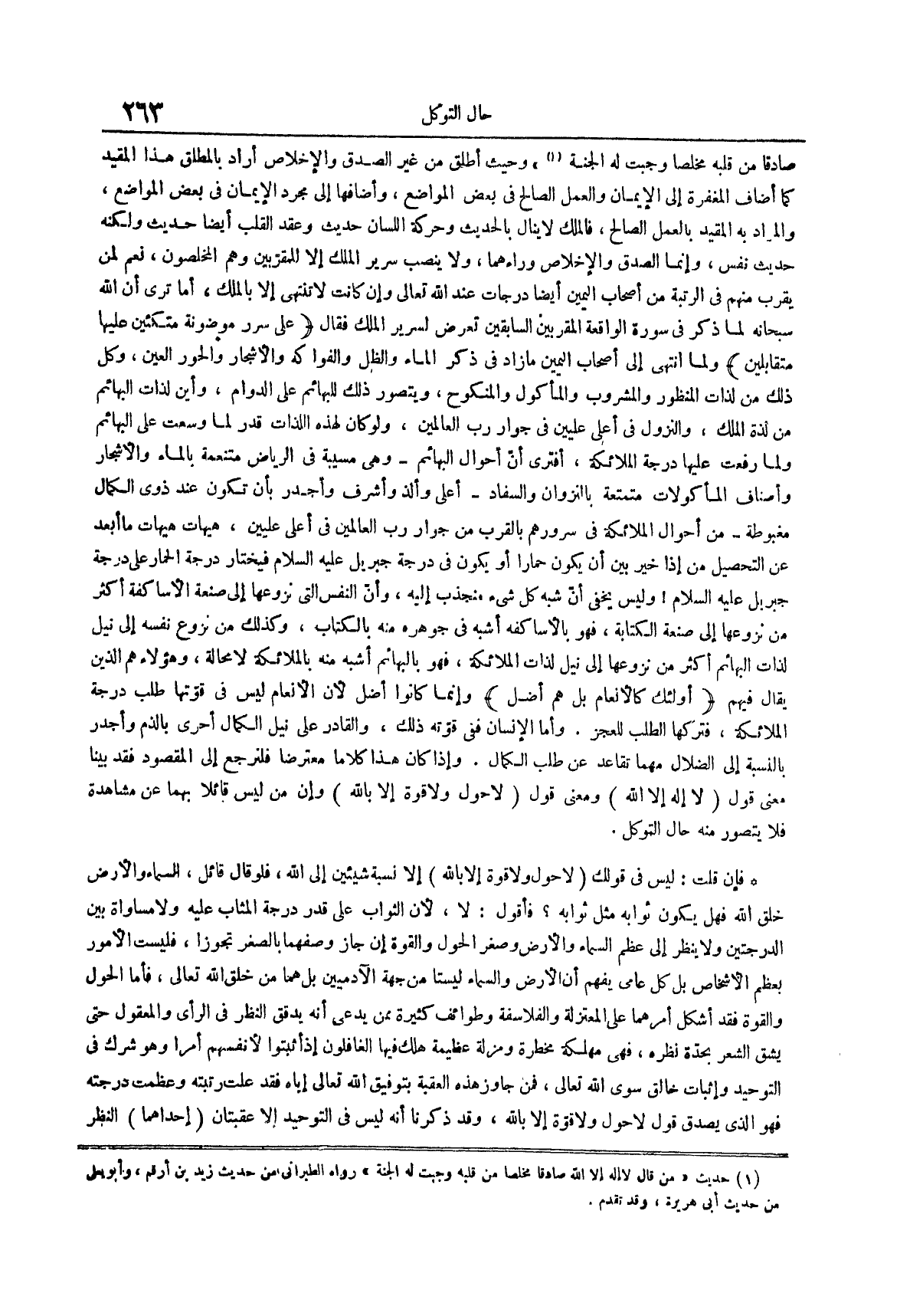 صادقاً من قلبه مخلصاً وجبت له الجنة (¬1) وحيث أطلق من غير الصدق والإخلاص أراد بالمطلق هذا المقيد كما أضاف المغفرة إلى الإيمان والعمل الصالح في بعض المواضع وأضافها إلى مجرد الإيمان في بعض المواضع والمراد به المقيد بالعمل الصالح فالملك لا ينال بالحديث وحركة اللسان حديث وعقد القلب أيضاً حديث ولكنه حديث نفس وإنما الصدق والإخلاص وراءهما ولا ينصب سرير الملك إلا للمقربين وهم المخلصون نعم لمن يقرب منهم في الرتبة من أصحاب اليمين أيضاً درجات عند الله تعالى وإن كانت لا تنتهي إلا بالملك أما ترى أن الله سبحانه لما ذكر في سورة الواقعة المقربين السابقين تعرض لسرير الملك فقال {على سرر موضونة متكئين عليها متقابلين} ولما انتهى إلى أصحاب اليمين ما زاد في ذكر الماء والظل والفواكه والأشجار والحور العين وكل ذلك من لذات المنظور والمشروب والمأكول والمنكوح ويتصور ذلك للبهائم على الدوام وأين لذات البهائم من لذة الملك والنزول في أعلى عليين في جوار رب العالمين ولو كان لهذه اللذات قدر لما وسعت على البهائم ولما رفعت عليها درجة الملائكة أفترى أن أحوال البهائم وهي مسيبة في الرياض متنعمة بالماء والأشجار وأصناف المأكولات متمتعة بالنزوان والسفاد أعلى وألذ وأشرف وأجدر بأن تكون عند ذوي الكمال مغبوطة من أحوال الملائكة في سرورهم بالقرب من جوار رب العالمين في أعلى عليين هيهات هيهات ما أبعد عن التحصيل من إذا خير بين أن يكون حماراً أو يكون في درجة جبريل عليه السلام فيختار درجة الحمار على درجة جبريل عليه السلام وليس يخفى أن شبه كل شيء منجذب إليه وأن النفس التي نزوعها إلى صنعة الأساكفة أكثر من نزوعها إلى صنعة الكتابة فهو بالأساكفة أشبه في جوهره منه بالكتاب وكذلك من نزوع نفسه إلى نيل لذات البهائم أكثر من نزوعها إلى نيل لذات الملائكة فهو بالبهائم أشبه منه بالملائكة لا محالة وهؤلاء هم الذين يقال فيهم {أولئك كالأنعام بل هم أضل} وإنما كانوا أضل لأن الأنعام ليس في قوتها طلب درجة الملائكة فتركها الطلب للعجز وأما الإنسان ففي قوته ذلك والقادر على نيل الكمال أحرى بالذم وأجدر بالنسبة إلى الضلال مهما تقاعد عن طلب الكمال وإذا كان هذا كلاماً معترضاً فلنرجع إلى المقصود فقد بينا معنى قول {لا إله إلا الله} ومعنى قول لا حول ولا قوة إلا بالله وإن من ليس قائلاً بهما عن مشاهدة فلا يتصور منه حال التوكل