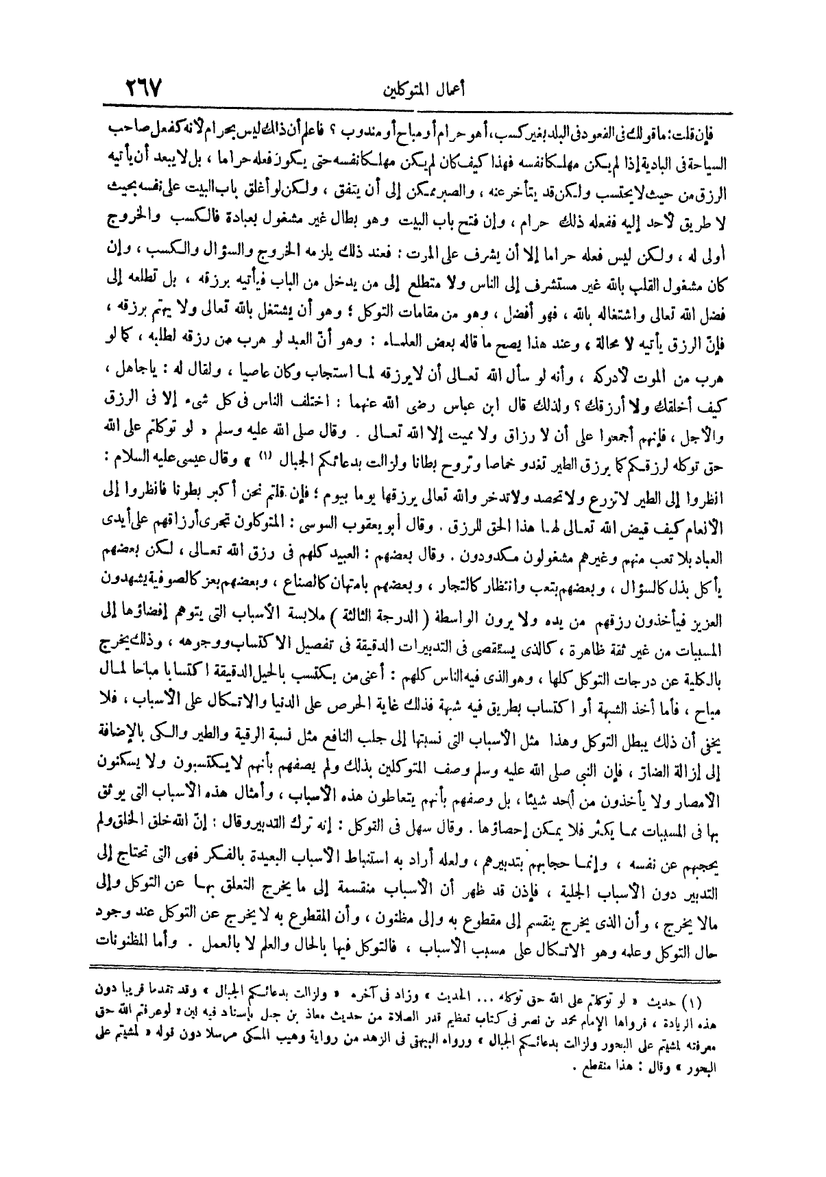 (¬1) حديث لو توكلتم على الله حق توكله الحديث وزاد فى آخره ولزالت بدعائكم الجبال وقد تقدما قريبا دون هذه الزيادة فرواها الإمام محمد بن نصر فى كتاب تعظيم قدر الصلاة من حديث معاذ بن جبل بإسناد فيه لين لو عرفتم الله حق معرفته لمشيتم على البحور ولزالت بدعائكم الجبال ورواه البيهقى فى الزهد من رواية وهيب المكى مرسلا دون قوله لمشيتم على البحور وقال هذا منقطع