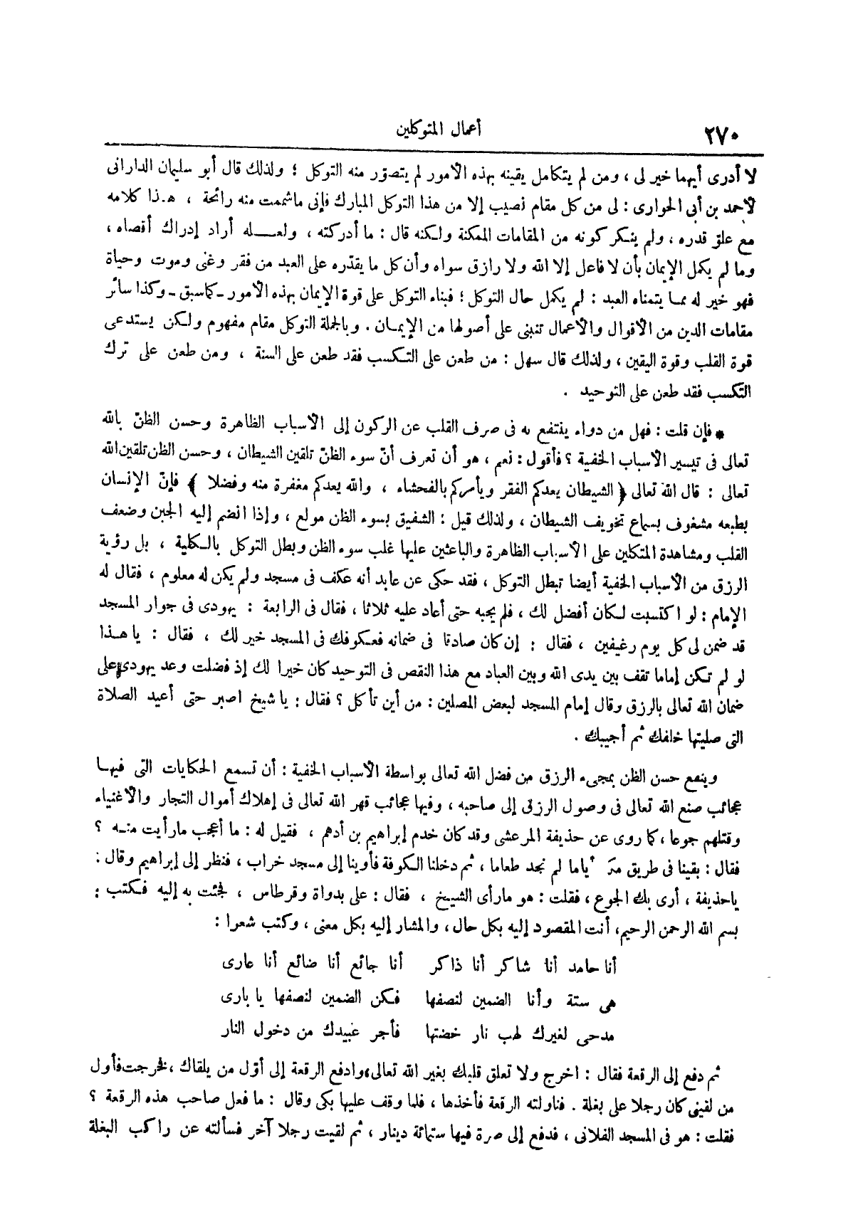 وينفع حسن الظن بمجيء الرزق من فضل الله تعالى بواسطة الأسباب الخفية أن تسمع الحكايات التي فيها عجائب صنع الله تعالى في وصول الرزق إلى صاحبه وفيها عجائب قهر الله تعالى في إهلاك أموال التجار والأغنياء وقتلهم جوعاً كما روي عن حذيفة المرعشي وقد كان خدم إبراهيم بن أدهم فقيل له ما أعجب ما رأيت منه فقال بقينا في طريق مكة أياماً لم نجد طعاماً ثم دخلنا الكوفة فأوينا إلى مسجد خراب فنظر إلي إبراهيم وقال يا حذيفة أرى بك الجوع فقلت هو ما رأى الشيخ فقال علي بدواة وقرطاس فجئت به إليه فكتب بسم الله الرحمن الرحيم أنت المقصود إليه بكل حال والمشار إليه بكل معنى وكتب شعراً