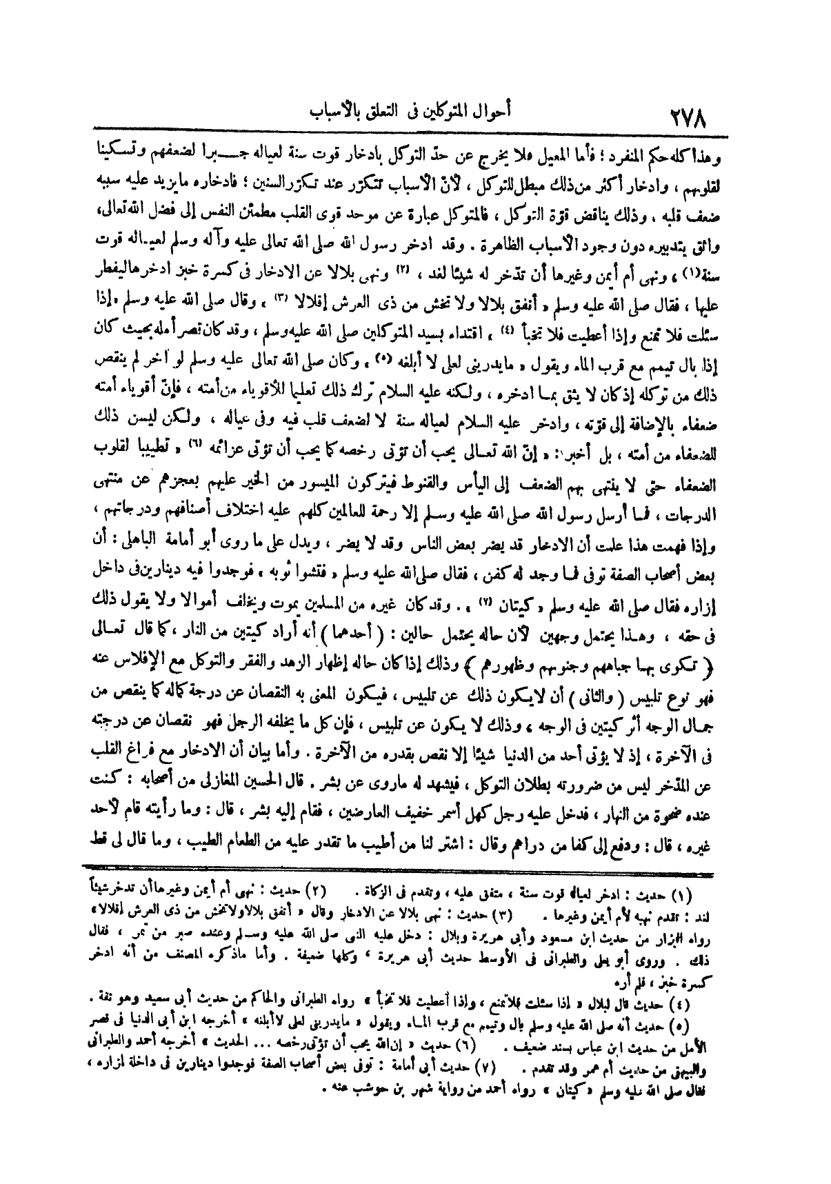 وهذا كله حكم المنفرد فأما المعيل فلا يخرج عن حد التوكل بادخار قوت سنة لعياله جبراً لضعفهم وتسكيناً لقلوبهم وادخار أكثر من ذلك مبطل للتوكل لأن الأسباب تتكرر عند تكرر السنين فادخاره ما يزيد عليه سببه ضعف قلبه وذلك يناقض قوة التوكل فالمتوكل عبارة عن موحد قوي القلب مطمئن النفس إلى فضل الله تعالى واثق بتدبيره دون وجود الأسباب الظاهرة وقد ادخر رسول الله صلى الله عليه وسلم لعياله قوت سنة (¬1) ونهى أم أيمن وغيرها أن تدخر له شيئاً لغد (¬2) ونهى بلالاً عن الادخار في كسرة خبز ادخرها ليفطر عليها فقال صلى الله عليه وسلم أنفق بلالاً ولا تخش من ذي العرش إقلالاً (¬3) وقال صلى الله عليه وسلم إذا سئلت فلا تمنع وإذا أعطيت فلا تخبأ (¬4) إقتداء بسيد المتوكلين صلى الله عليه وسلم وقد كان قصر أمله بحيث كان إذا بال تيمم مع قرب الماء ويقول ما يدريني لعلي لا أبلغه (¬5) وكان صلى الله عليه وسلم لو أخر لم ينقص ذلك من توكله إذ كان لا يثق بما ادخره ولكنه عليه السلام ترك ذلك تعليماً للأقوياء من أمته فإن أقوياء أمته ضعفاء بالإضافة إلى قوته وادخر عليه السلام لعياله سنة لا لضعف قلب فيه وفي عياله ولكن ليسن ذلك للضعفاء من أمته بل أخبر إن الله تعالى يحب أن تؤتى رخصه كما يحب أن تؤتى عزائمه (¬6) تطييباً لقلوب الضعفاء حتى لا ينتهي بهم الضعف إلى اليأس والقنوط فيتركون الميسور من الخير عليهم بعجزهم عن منتهى الدرجات فما أرسل رسول الله صلى الله عليه وسلم إلا رحمة للعالمين كلهم عليه اختلاف أصنافهم ودرجاتهم وإذا فهمت هذا علمت أن الادخار قد يضر بعض الناس وقد لا يضر ويدل على ما روى أبو أمامة الباهلي أن بعض أصحاب الصفة توفي فما وجد له كفن فقال صلى الله عليه وسلم فتشوا ثوبه فوجدوا فيه دينارين في داخل إزاره فقال صلى الله عليه وسلم كيتان (¬7) وقد كان غيره من المسلمين يموت ويخلف أموالاً ولا يقول ذلك في حقه وهذا يحتمل وجهين لأن حاله يحتمل حالين أحدهما أنه أراد كيتين من النار كما قال تعالى تكوى بها جباههم وجنوبهم وظهورهم وذلك إذا كان حاله إظهار الزهد والفقر والتوكل مع الإفلاس عنه فهو نوع تلبيس والثاني أن لا يكون ذلك عن تلبيس فيكون المعنى به النقصان عن درجة كماله كما ينقص من جمال الوجه أثر كيتين في الوجه وذلك لا يكون عن تلبيس فإن كل ما يخلفه الرجل فهو نقصان عن درجته في الآخرة إذ لا يؤتى أحد من الدنيا شيئاً إلا نقص بقدره من الآخرة وأما بيان أن الادخار مع فراغ القلب عن المدخر ليس من ضرورته بطلان التوكل فيشهد له ما روي عن بشر قال الحسين المغازلي من أصحابه كنت عنده ضحوة من النهار فدخل عليه رجل كهل أسمر خفيف العارضين فقام إليه بشر قال وما رأيته قام لأحد غيره قال ودفع إلي كفاً من دراهم وقال اشتر لنا من أطيب ما تقدر عليه من الطعام الطيب وما قال لي قط