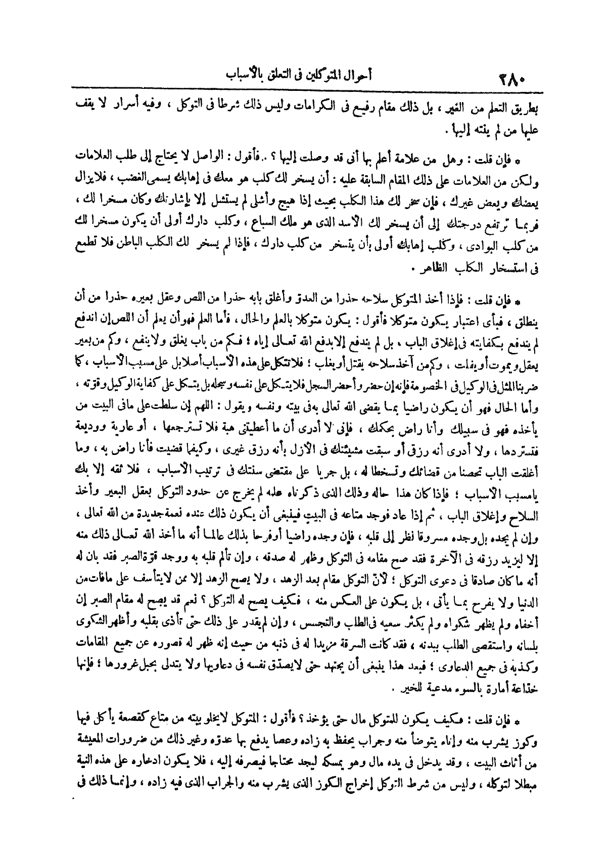 فإن قلت فإذا أخذ المتوكل سلاحه حذراً من العدو وأغلق بابه حذراً من اللص وعقل بعيره حذراً من أن ينطلق فبأي اعتبار يكون متوكلاً فأقول يكون متوكلاً بالعلم والحال فأما العلم فهو أن يعلم أن اللص إن اندفع لم يندفع بكفايته في إغلاق الباب بل لم يندفع إلا بدفع الله تعالى إياه فكم من باب يغلق ولا ينفع وكم من بعير يعقل ويموت أو يفلت وكم من آخذ سلاحه يقتل أو يغلب فلا تتكل على هذه الأسباب أصلاً بل على مسبب الأسباب كما ضربنا المثل في الوكيل في الخصومة فإنه إن حضر وأحضر السجل فلا يتكل على نفسه وسجله بل يتكل على كفاية الوكيل وقوته وأما الحال فهو أن يكون راضياً بما يقضي الله تعالى به في بيته ونفسه ويقول اللهم إن سلطت علي ما في البيت من يأخذه فهو في سبيلك وأنا راض بحكمك فإني لا أدري أن ما أعطيتني هبة فلا تسترجعها أو عارية ووديعة فتستردها ولا أدري أنه رزقي أو سبقت مشيئتك في الأزل بأنه رزق غيري وكيفما قضيت فأنا راض به وما أغلقت الباب تحصنا من قضاؤك وتسخطاً له بل جرياً على مقتضى سنتك في ترتيب الأسباب فلا ثقة إلا بك يا مسبب الأسباب فإذا كان هذا حاله وذلك الذي ذكرناه علمه لم يخرج عن حدود التوكل بعقل البعير وأخذ السلاح وإغلاق الباب ثم إذا عاد فوجد متاعه في البيت فينبغي أن يكون ذلك عنده نعمة جديدة من الله تعالى وإن لم يجده بل وجده مسروقا نظر إلى قلبه فإن وجده راضياً أو فرحاً بذلك عالماً أنه ما أخذ الله تعالى ذلك منه إلا ليزيد رزقه في الآخرة فقد صح مقامه في التوكل وظهر له صدقه وإن تألم قلبه به ووجد قوة الصبر فقد بان له أنه ما كان صادقاً في دعوى التوكل لأن التوكل مقام بعد الزهد ولا يصح الزهد إلا ممن لا يتأسف على ما فات من الدنيا ولا يفرح بما يأتي بل يكون على العكس منه فكيف يصح له التوكل نعم قد يصح له مقام الصبر إن أخفاه ولم يظهر شكواه ولم يكثر سعيه في الطلب والتجسس وإن لم يقدر على ذلك حتى تأذى بقلبه وأظهر الشكوى بلسانه واستقصى الطلب ببدنه فقد كانت السرقة مزيداً له في ذنبه من حيث إنه ظهر له قصوره عن جميع المقامات وكذبه في جميع الدعاوي فبعد هذا ينبغي أن يجتهد حتى لا يصدق نفسه في دعاويها ولا يتدلى بحبل غرورها فإنها خداعة أمارة بالسوء مدعية للخير