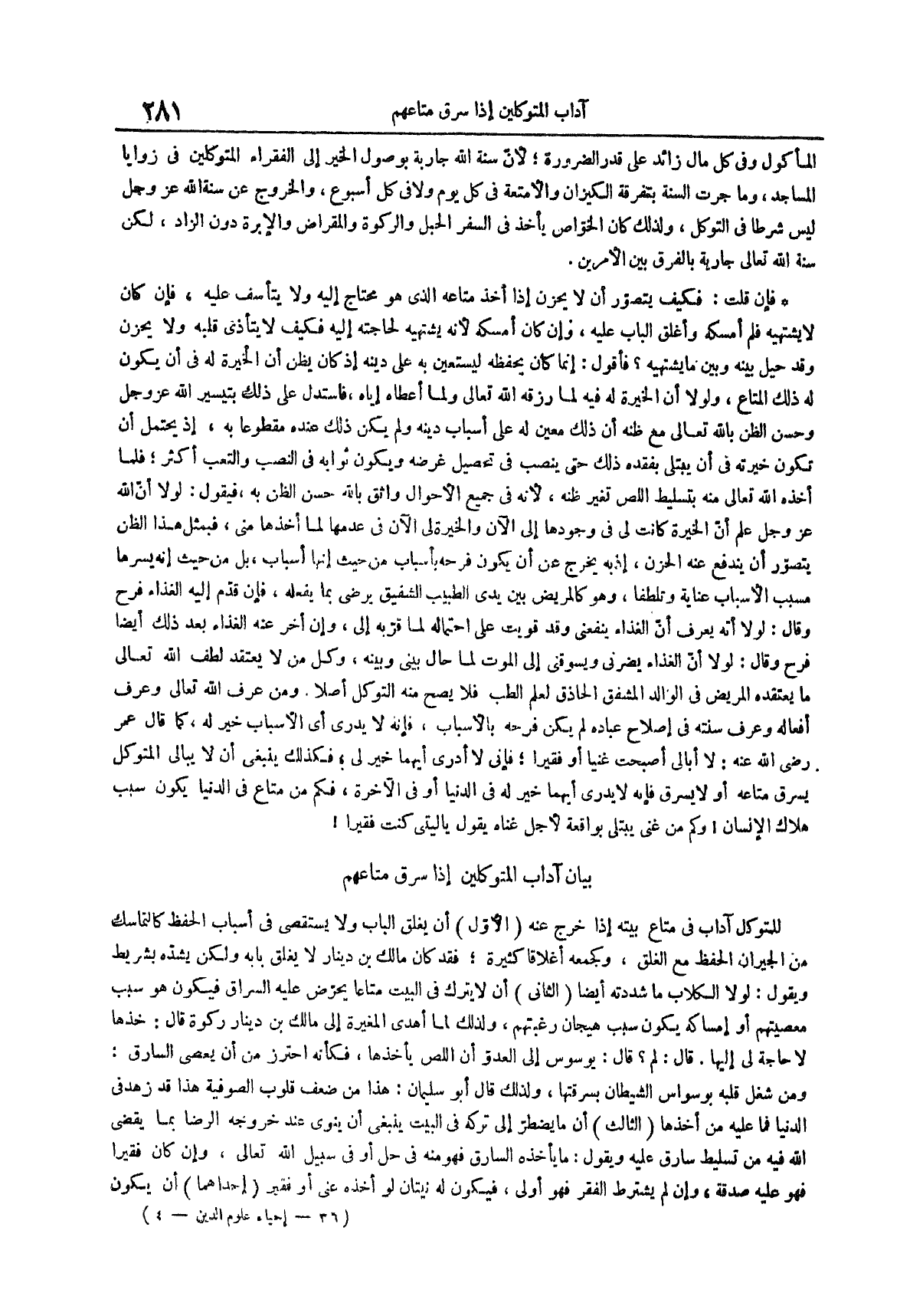 للمتوكل آداب في متاع بيته إذا خرج عنه {الأول} أن يغلق الباب ولا يستقصي في أسباب الحفظ كالتماسك من الجيران الحفظ مع الغلق وكجمعه أغلاقاً كثيرة فقد كان مالك بن دينار لا يغلق بابه ولكن يشده بشريط ويقول لولا الكلاب ما شددته أيضاً الثاني أن لا يترك في البيت متاعاً يحرض عليه السراق فيكون هو سبب معصيتهم أو إمساكه يكون سبب هيجان رغبتهم ولذلك لما أهدى المغيرة إلى مالك بن دينار ركوة قال خذها لا حاجة لي إليها قال لم قال يوسوس إلي العدو أن اللص يأخذها فكأنه احترز من أن يعصي السارق ومن شغل قلبه بوسواس الشيطان بسرقتها ولذلك قال أبو سليمان هذا من ضعف قلوب الصوفية هذا قد زهد في الدنيا فما عليه من أخذها الثالث أن ما يضطر إلى تركه في البيت ينبغي أن ينوي عند خروجه الرضا بما يقضي الله فيه من تسليط سارق عليه ويقول ما يأخذه السارق فهو منه في حل أو في سبيل الله تعالى وإن كان فقيراً فهو عليه صدقة وإن لم يشترط الفقر فهو أولى فيكون له نيتان لو أخذه غني أو فقير {إحداهما} أن يكون