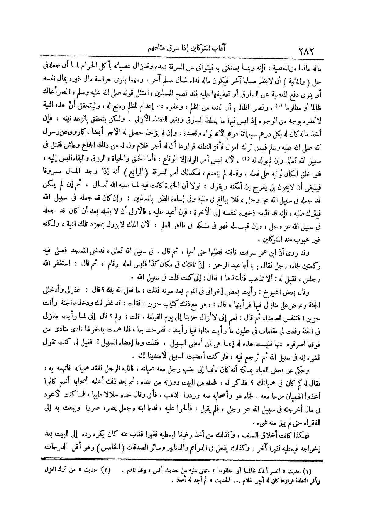 ماله مانعاً من المعصية فإنه ربما يستغني به فيتوانى عن السرقة بعده وقد زال عصيانه بأكل الحرام لما أن جعله في حل والثانية أن لا يظلم مسلماً آخر فيكون ماله فداءً لمال مسلم آخر ومهما ينوي حراسة مال غيره بمال نفسه أو ينوي دفع المعصية عن السارق أو تخفيفها عليه فقد نصح للمسلمين وامتثل قوله صلى الله عليه وسلم انصر أخاك ظالماً أو مظلوماً (¬1) ونصر الظالم أن تمنعه من الظلم وعفوه عنه إعدام للظلم ومنع له وليتحقق أن هذه النية لا تضره بوجه من الوجوه إذ ليس فيها ما يسلط السارق ويغير القصاء الأزلي ولكن يتحقق بالزهد نيته فإن أخذ ماله كان له بكل درهم سبعمائة درهم لأنه نواه وقصده وإن لم يؤخذ حصل له الأجر أيضاً كما روي عَنْ رَسُولِ اللَّهِ صَلَّى اللَّهُ عَلَيْهِ وَسَلَّمَ فيمن ترك العزل فأقر النطفة قرارها أن له أجر غلام ولد له من ذلك الجماع وعاش فقتل في سبيل الله تعالى وإن لم يولد له (¬2) لأنه ليس أمر الولد إلا الوقاع فأما الخلق والحياة والرزق والبقاء فليس إليه فلو خلق لكان ثوابه على فعله وفعله لم ينعدم فكذلك أمر السرقة الرابع أنه إذا وجد المال مسروقاً فينبغي أن لا يحزن بل يفرح إن أمكنه ويقول لولا أن الخيرة كانت فيه لما سلبه الله تعالى ثم إن لم يكن قد جعله في سبيل الله عز وجل فلا يبالغ في طلبه وفي إساءة الظن بالمسلمين وإن كان قد جعله في سبيل الله فيترك طلبه فإنه قد قدمه ذخيرة لنفسه إلى الآخرة فإن أعيد عليه فالأولى أن لا يقبله بعد أن كان قد جعله في سبيل الله عز وجل وإن قبله فهو في ملكه في ظاهر العلم لأن الملك لا يزول بمجرد تلك النية ولكنه غير محبوب عند المتوكلين
