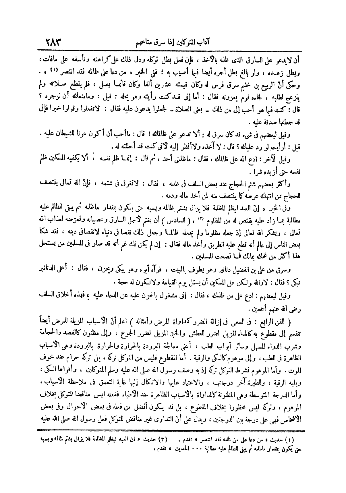 أن لا يدعو على السارق الذي ظلمه بالأخذ فإن فعل بطل توكله ودل ذلك على كراهته وتأسفه على ما فات وبطل زهده ولو بالغ بطل أجره أيضاً فيما أصيب به ففي الخبر من دعا على ظالمه فقد انتصر (¬1) وحكي أن الربيع بن خثيم سرق فرس له وكان قيمته عشرين ألفاً وكان قائماً يصلي فلم يقطع صلاته ولم ينزعج لطلبه فجاءه قوم يعزونه فقال أما إني قد كنت رأيته وهو يحله قيل وما منعك أن تزجره قال كنت فيما هو أحب إلي من ذلك يعني الصلاة فجعلوا يدعون عليه فقال لا تفعلوا وقولوا خيراً فإني قد جعلتها صدقة عليه