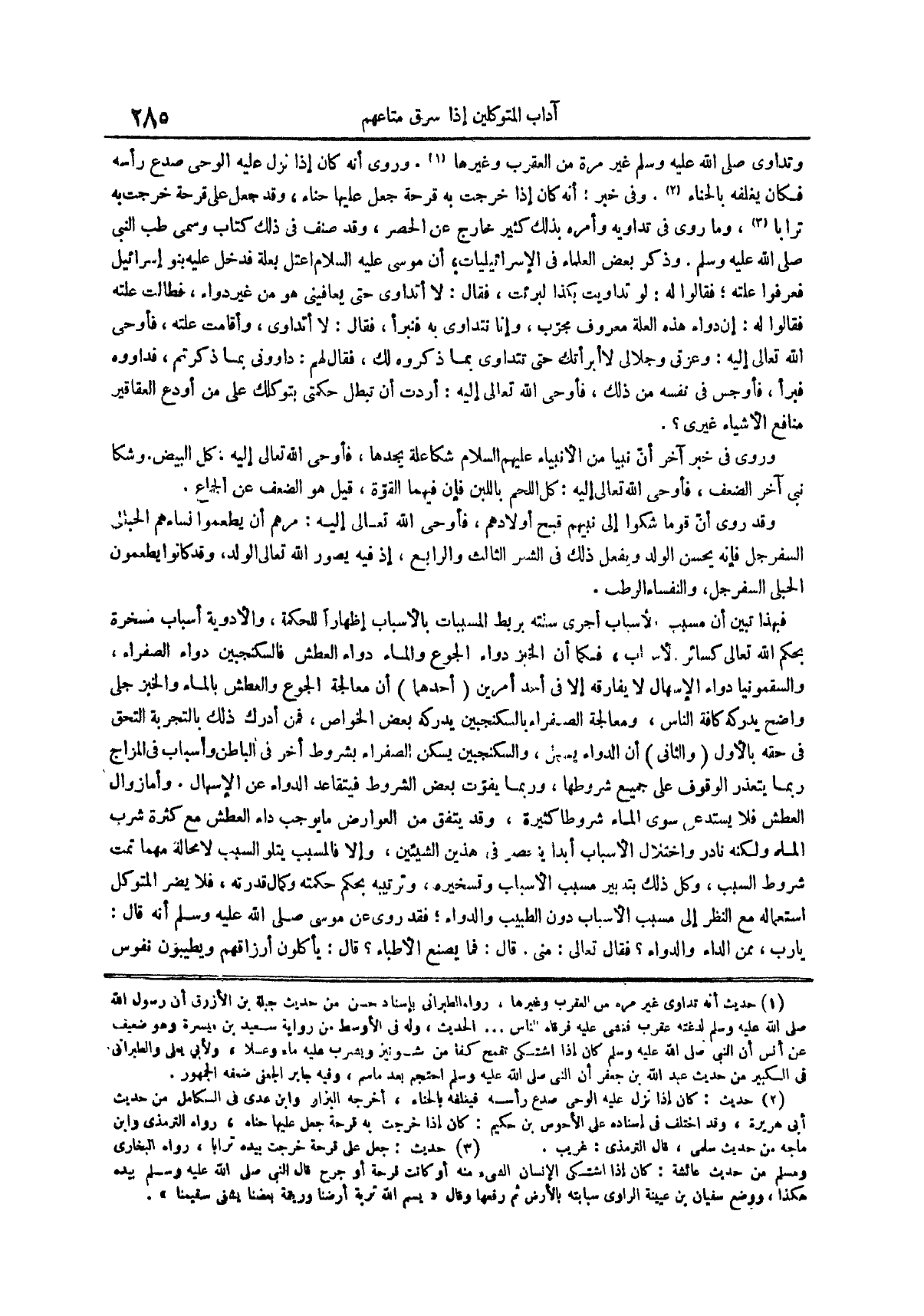 وتداوى صلى الله عليه وسلم غير مرة من العقرب وغيرها (¬1) حديث كان إذى نزل الوحي صدع رأسه فيغلفه بالحناء أخرجه البزار وابن عدي في الكامل من حديث أبي هريرة وقد اختلف في إسناده على الأحوص بن حكيم كان إذا خرجت به قرحة جعل عليها حناء رواه الترمذي وابن ماجة من حديث سلمى قال الترمذي غريب وفي خبر: أنه كان إذا خرجت به قرحة جعل عليها حناء وقد جعل على قرحة خرجت به ترابا جعل على قرحة خرجت بيده ترابا حديث جعل على قرحة خرجة بيده ترابا رواه البخاري ومسلم من حديث عائشة كان إذا اشتكى الإنسان الشيء منه أو كانت فرحة أو جرح قال النبي صلى الله عليه وسلم بيده ووضع سفيان عيينه الراوي سبابته بالأرض ثم رفعها وقال بسم الله تربة أرضنا وريقة بعضنا يشفى سقيمنا // وما روي في تداويه وأمره بذلك كثير خارج عن الحصر وقد صنف في ذلك كتاب وسمي طب النبي صلى الله عليه وسلم وذكر بعض العلماء في الإسرائيليات أن موسى عليه السلام اعتل بعلة فدخل عليه بنو إسرائيل فعرفوا علته فقالوا له لو تداويت بكذا لبرئت فقال لا أتداوى حتى يعافيني هو من غير دواء فطالت علته فقالوا له إن دواء هذه العلة معروف مجرب وإنا نتداوى به فنبرأ فقال لا أتداوى وأقامت علته فأوحى الله تعا رضي الله عنها لى إليه وعزتي وجلالي لا أبرأتك حتى تتداوى بما ذكروه لك فقال لهم داووني بما ذكرتم فداووه فبرأ فأوجس في نفسه من ذلك فأوحى الله تعالى إليه أردت أن تبطل حكمتي بتوكلك على من أودع العقاقير منافع الأشياء غيري وروي في خبر آخر أن نبياً من الأنبياء عليهم السلام شكا علة يجدها فأوحى الله تعالى إليه كل البيض وشكا نبي آخر الضعف فأوحى الله تعالى إليه كل اللحم باللبن فإن فيهما القوة قيل هو الضعف عن الجماع وقد روي أن قوماً شكوا إلى نبيهم قبح أولادهم فأوحى الله تعالى إليه مرهم أن يطعموا نساءهم الحبلى السفرجل فإنه يحسن الولد ويفعل ذلك في الشهر الثالث والرابإذ فيه يصور الله تعالى الولد وقد كانوا يطعمون الحبلى السفرجل والنفساء الرطب فبهذا تبين أن مسبب الأسباب أجرى سنته بربط المسببات بالأسباب إظهاراً للحكمة والأدوية أسباب مسخرة بحكم الله تعالى كسائر الأسباب فكما أن الخبز دواء الجوع والماء دواء العطش فالسكنجبين دواء الصفراء والسقمونيا دواء الإسهال لا يفارقه إلا في أحد أمرين {أحدهما} أن معالجة الجوع والعطش بالماء والخبز جلي واضح يدركه كافة الناس ومعالجة الصفراء بالسكنحبين يدركه بعض الخواص فمن أدرك ذلك بالتجربة التحق في حقه بالأول والثاني آن الدواء يسهل والسكنجبين يسكن الصفراء بشروط أخر في الباطن وأسباب في المزاج ربما يتعذر الوقوف على جميع شروطها وربما يفوت بعض الشروط فيتقاعد الدواء عن الإسهال وأما زوال العطش فلا يستدعي سوى الماء شروطاً كثيرة وقد يتفق من العوارض ما يوجب داء العطش مع كثرة شرب الماء ولكنه نادر واختلال الأسباب أبداً ينحصر في هذين الشيئين وإلا فالمسبب يتلو السبب لا محالة مهما تمت شروط السبب وكل ذلك بتدبير مسبب الأسباب وتسخيره وترتيبه بحكم حكمته وكمال قدرته فلا يضر المتوكل استعماله مع النظر إلى مسبب الأسباب دون الطبيب والدواء فقد روي عن موسى صلى صلى الله عليه وسلم انه قال يارب ممن الداء والدواء فقال تعالى مني قال: فما يصنع الأطباء قال يأكلون أرزاقهم ويطيبون نفوس