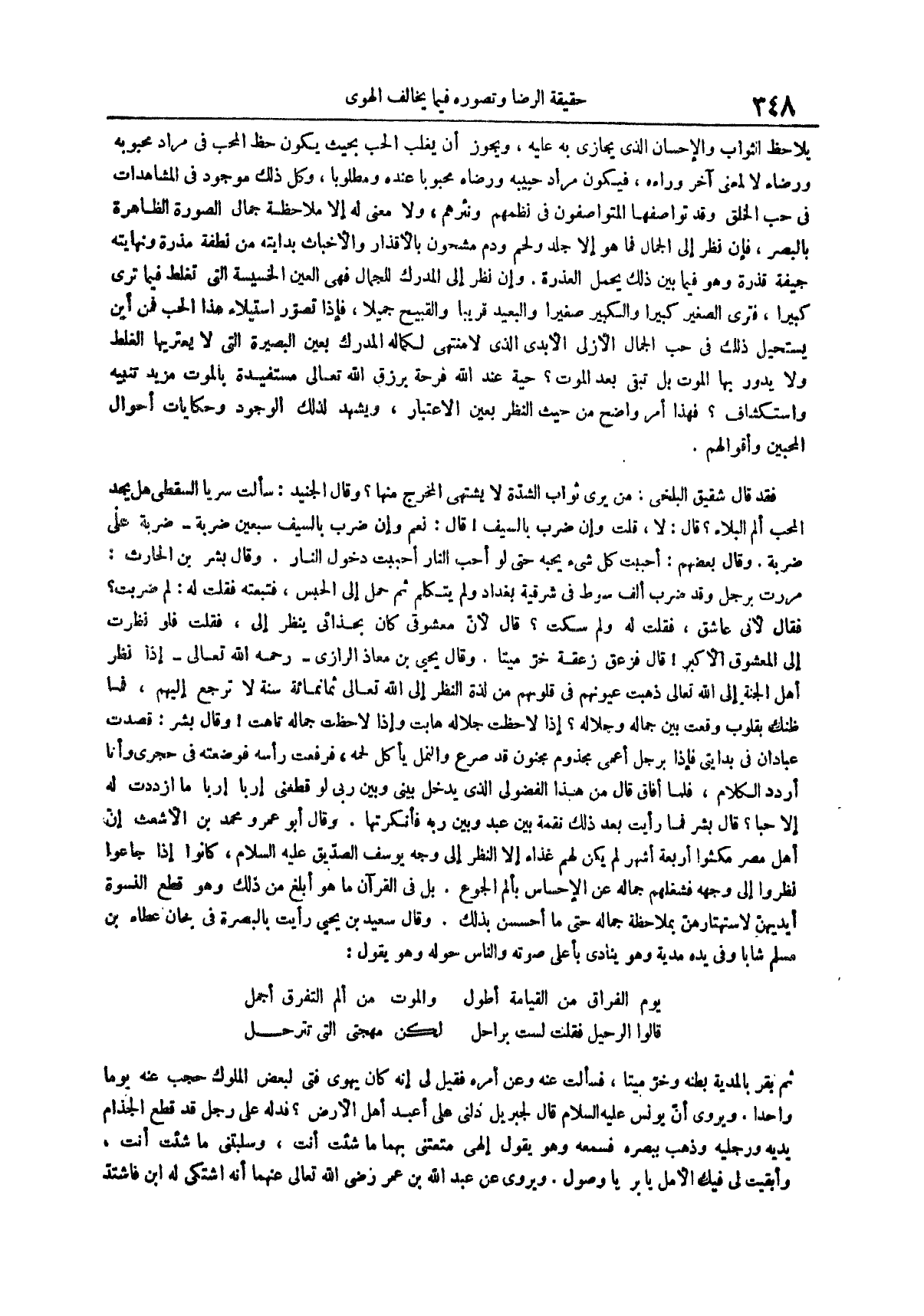 وإن نظر إلى المدرك للجمال فهي العين الخسيسة التي تغلط فيما ترى كبيراً فترى الصغير كبيراً والكبير صغيراً والبعيد قريباً والقبيح جميلاً فإذا تصور استيلاء هذا الحب فمن أين يستحيل ذلك في حب الجمال الأزلي الأبدي الذي لا منتهى لكماله المدرك بعين البصيرة التي لا يعتريها الغلط ولا يدور بها الموت بل تبقى بعد الموت حية عند الله فرحة برزق الله تعالى مستفيدة بالموت مزيد تنبيه واستكشاف فهذا أمر واضح من حيث النظر بعين الاعتبار ويشهد لذلك الوجود وحكايات أحوال المحبين وأقوالهم