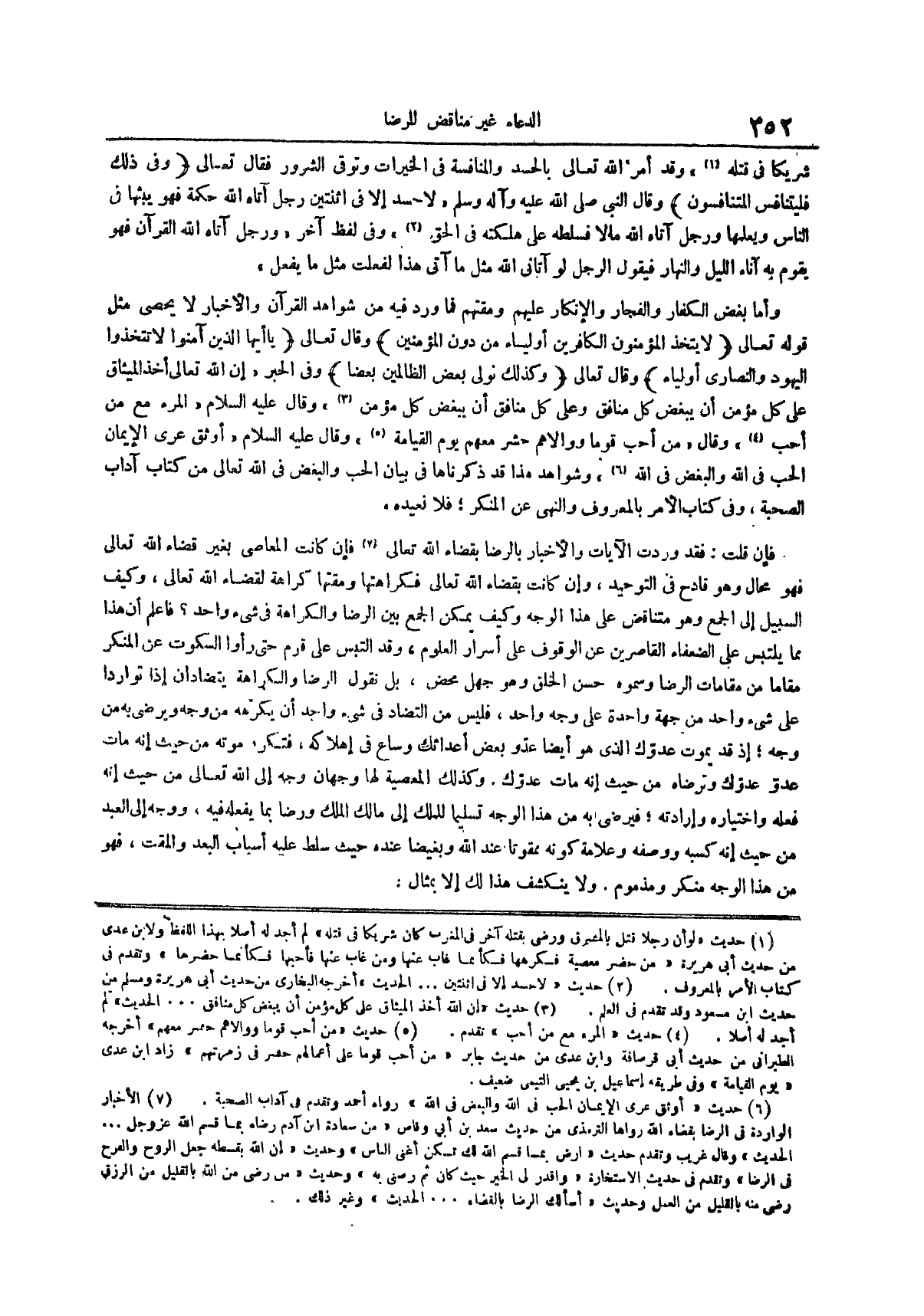 (¬7) الأخبار الواردة في الرضا بقضاء الله رواها الترمذى من حديث سعد بن أبي وقاص من سعادة ابن آدم وضاه بما قسم الله عز وجل الحديث وقال غريب وتقدم حديث ارض بما قسم الله لك تكن أغنى الناس وحديث إن الله بقسطه جعل الروح والفرح في الرضا وتقدم في حديث الاستخارة واقدر لِيَ الْخَيْرَ حَيْثُ كَانَ ثُمَّ رَضِّنِي بِهِ وحديث من رضي من الله بالقليل من الرزق رضي منه بالقليل من العمل وحديث أسألك الرضا بالقضاء الحديث وغير ذلك