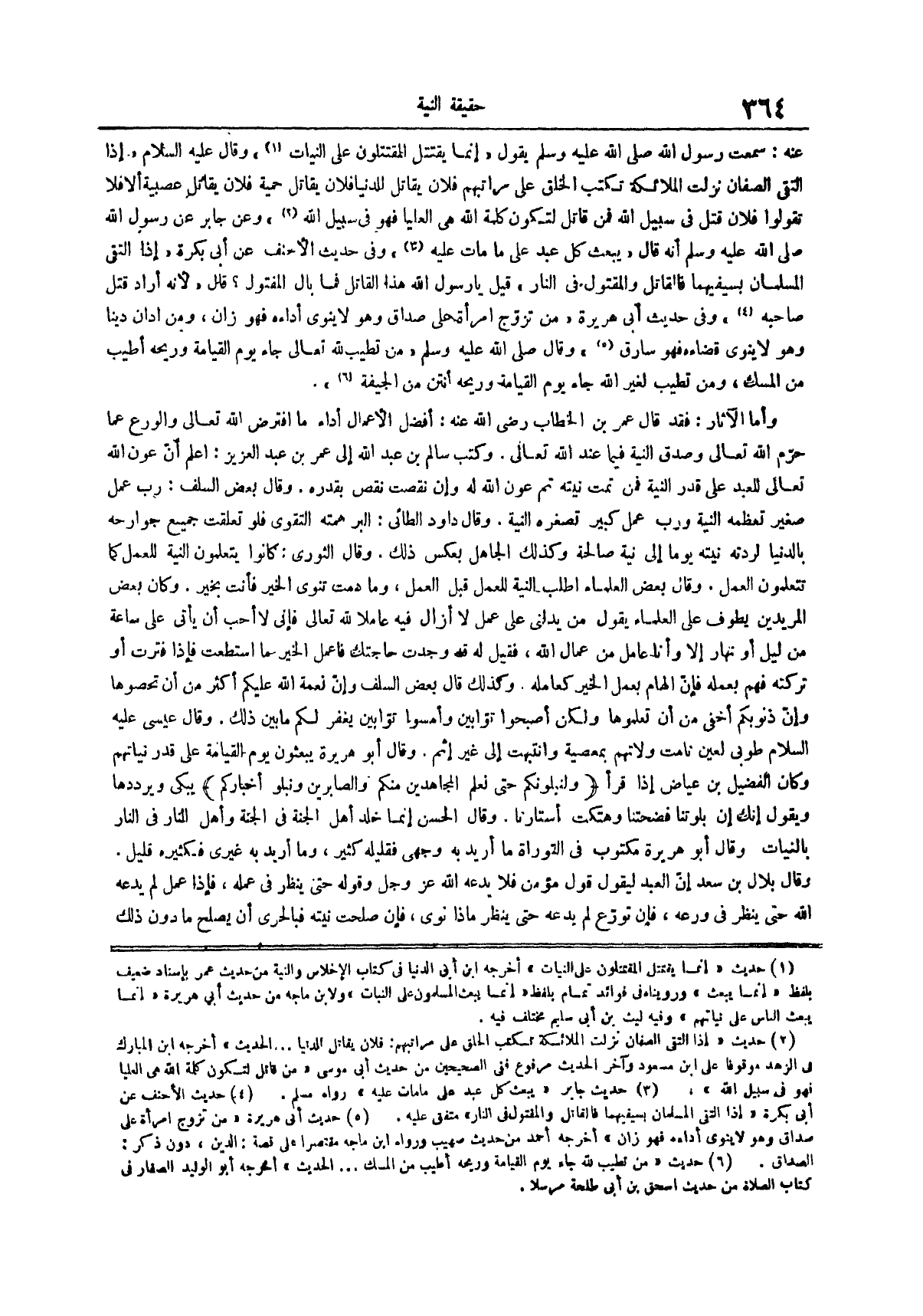 عنه سَمِعْتُ رَسُولَ اللَّهِ صَلَّى اللَّهُ عَلَيْهِ وَسَلَّمَ يقول إنما يقتتل المقتتلون على النيات أخرجه ابن أبى الدنيا في كتاب الإخلاص والنية من حديث عمر بإسناد ضعيف بلفظ إنما يبعث ورويناه في فوائد تمام بلفظ إنما يبعث المسلمون على النيات ولابن ماجه من حديث أبى هريرة إنما يبعث الناس على نياتهم وفيه ليث بن أبى سليم مختلف فيه وقال عليه السلام إذا التقى الصفان نزلت الملائكة تكتب الخلق على مراتبهم فلان يقاتل للدنيا فلان يقاتل حمية فلان يقاتل عصيبة ألا فلا تقولوا فلان قتل في سبيل الله فمن قاتل لتكون كلمة الله هي العليا فهو في سبيل الله (¬1) هي العليا فهو في سبيل الله وعن جابر عَنْ رَسُولِ اللَّهِ صَلَّى اللَّهُ عَلَيْهِ وَسَلَّمَ أنه قال يُبْعَثُ كُلُّ عَبْدٍ عَلَى مَا مَاتَ عَلَيْهِ (¬2) وفي حديث الأحنف عن أبي بكرة إذا التقى المسلمان بسيفيهما فالقاتل والمقتول في النار قيل يا رسول الله هذا القاتل فما بال المقتول قال لأنه أراد قتل صاحبه (¬3) وَفِي حَدِيثِ أَبِي هُرَيْرَةَ مَنْ تَزَوَّجَ امْرَأَةً عَلَى صَدَاقٍ وَهُوَ لَا يَنْوِي أَدَاءَهُ فَهُوَ زَانٍ وَمَنِ ادَّانَ دَيْنًا وَهُوَ لَا يَنْوِي قضاءه فهو سارق (¬4) وقال صلى الله عليه وسلم من تطيب لله تعالى جاء يوم القيامة وريحه أطيب من المسك ومن تطيب لغير الله جاء يوم القيامة وريحه أنتن من الجيفة (¬5)