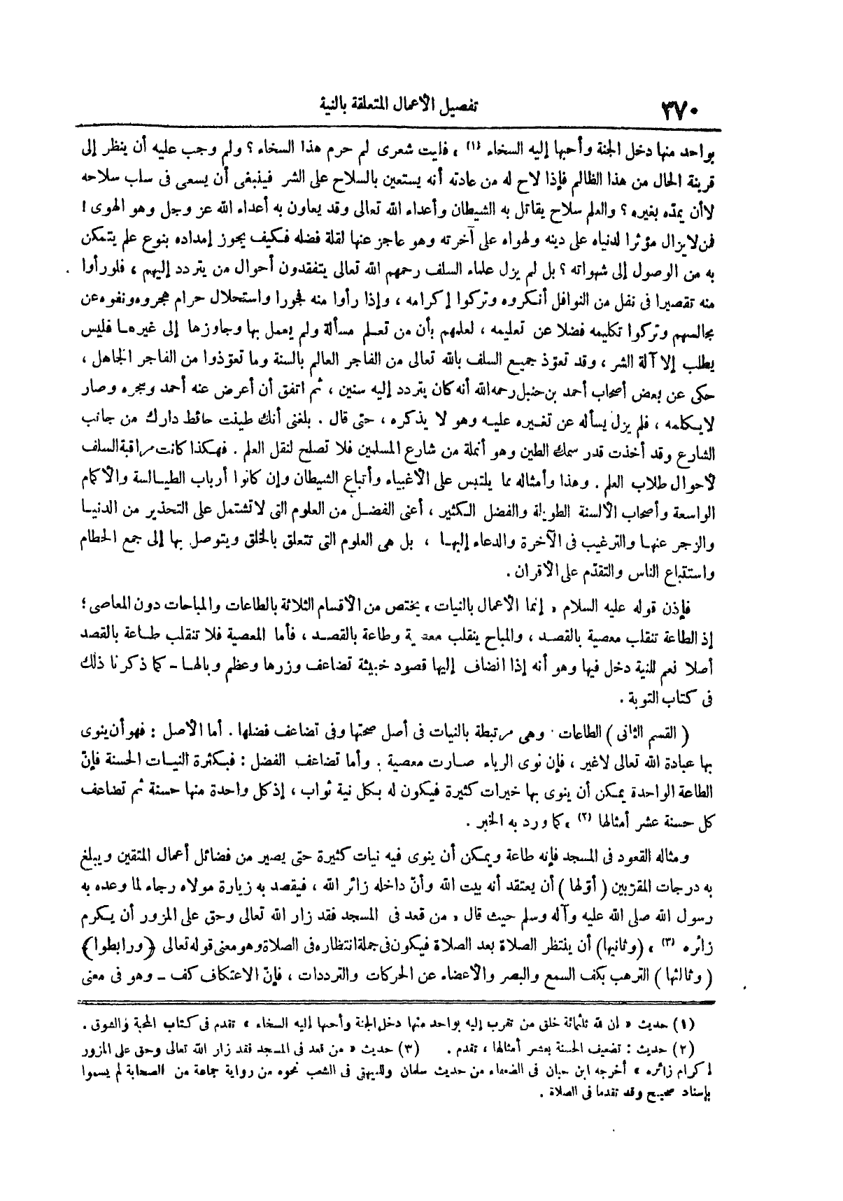 فإذن قوله عليه السلام إنما الأعمال بالنيات يختص من الأقسام الثلاثة بالطاعات والمباحات دون المعاصي إذ الطاعة تنقلب معصية بالقصد والمباح ينقلب معصية وطاعة بالقصد فأما المعصية فلا تنقلب طاعة بالقصد أصلاً نعم للنية دخل فيها وهو أنه إذا انضاف إليها قصود خبيثة تضاعف وزرها وعظم وبالها كما ذكرنا ذلك في كتاب التوبة