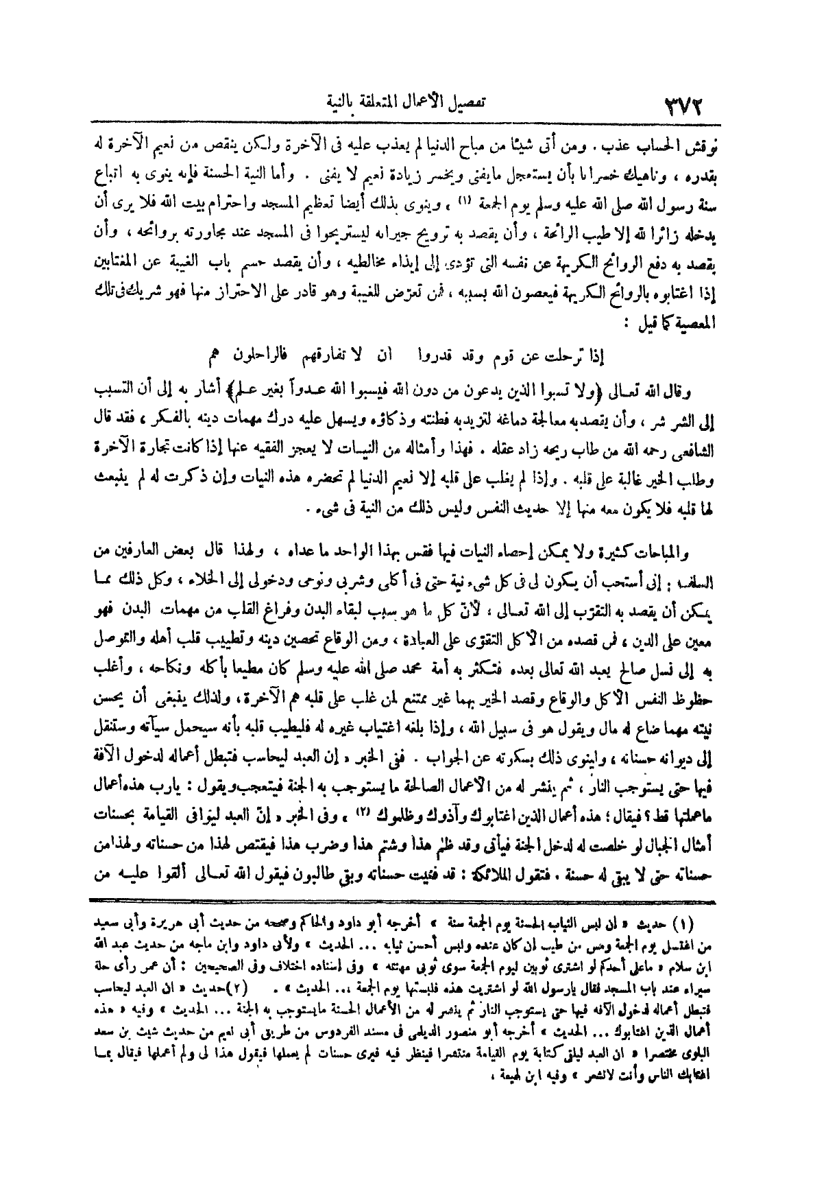 والمباحات كثيرة ولا يُمْكِنُ إِحْصَاءُ النِّيَّاتِ فِيهَا فَقِسْ بِهَذَا الْوَاحِدِ ما عداه ولهذا قال بعض العارفين من السلف إني أستحب أَنْ يَكُونَ لِي فِي كُلِّ شَيْءٍ نِيَّةٌ حتى في أكلي وشربي ونومي ودخولي إلى الخلاء وَكُلُّ ذَلِكَ مِمَّا يُمْكِنُ أَنْ يُقْصَدَ بِهِ التَّقَرُّبُ إِلَى اللَّهِ تَعَالَى لِأَنَّ كُلَّ مَا هُوَ سَبَبٌ لِبَقَاءِ الْبَدَنِ وَفَرَاغِ الْقَلْبِ مِنْ مُهِمَّاتِ الْبَدَنِ فَهُوَ مُعِينٌ عَلَى الدِّينِ فَمَنْ قصده مِنَ الْأَكْلِ التَّقَوِّيَ عَلَى الْعِبَادَةِ وَمِنَ الْوِقَاعِ تَحْصِينَ دِينِهِ وَتَطْيِيبَ قَلْبِ أَهْلِهِ وَالتَّوَصُّلَ بِهِ إلى نسل صالح يعبد الله تعالى بعده فتكثر به أمة محمد صلى الله عليه وسلم كان مطيعاً بأكله ونكاحه وأغلب حظوظ النفس الأكل والوقاع وقصد الخير بهما غير ممتنع لمن غلب على قلبه هم الآخرة ولذلك ينبغي أن يحسن نيته مهما ضاع له مال ويقول هو في سبيل الله وإذا بلغه اغتياب غيره له فليطيب قلبه بأنه سيحمل سيآته وستنقل إلى ديوانه حسناته ولينوي ذلك بسكوته عن الجواب