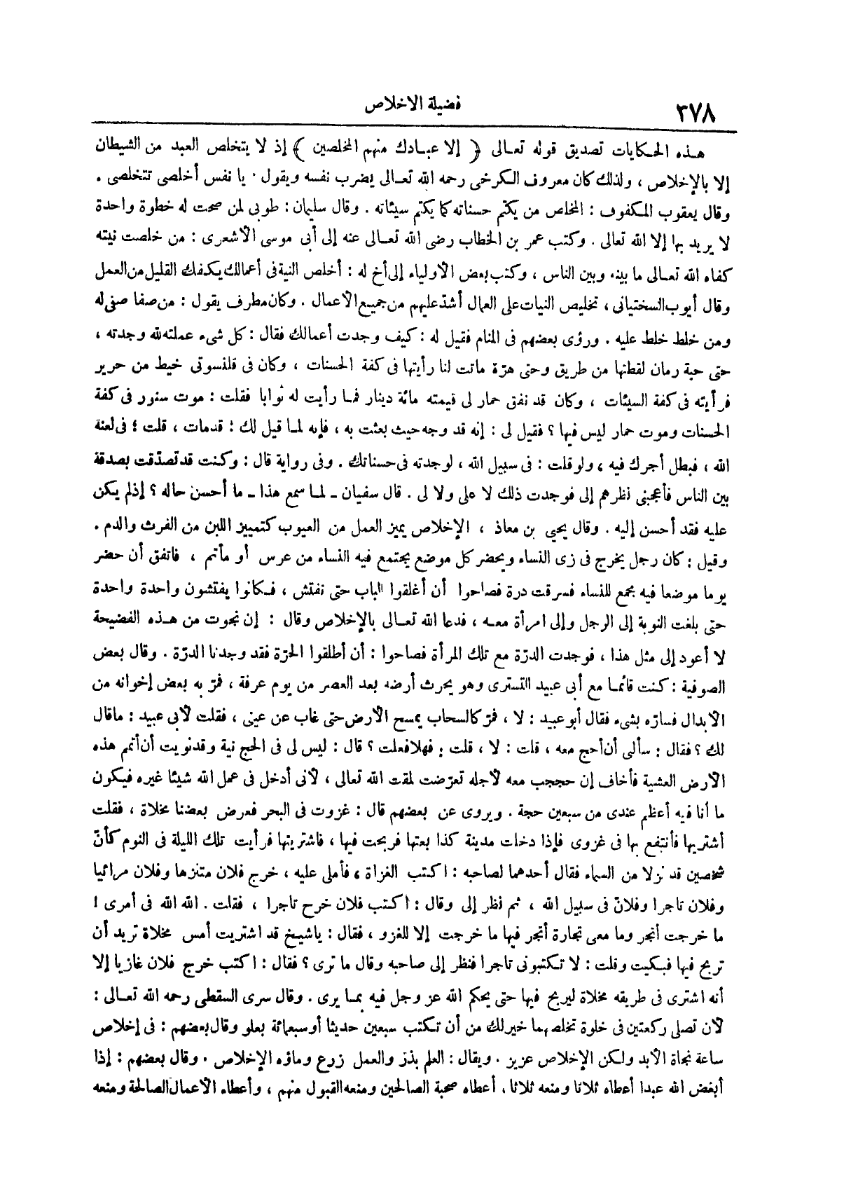 وفي رواية قال وكنت قد تصدقت بصدقة بين الناس فأعجبني نظرهم إلي فوجدت ذلك لا علي ولا لي قال سفيان لما سمع هذا ما أحسن حاله إذ لم يكن عليه فقد أحسن إليه وقال يحيى بن معاذ الإخلاص يميز العمل من العيوب كتمييز اللبن من الفرث والدم