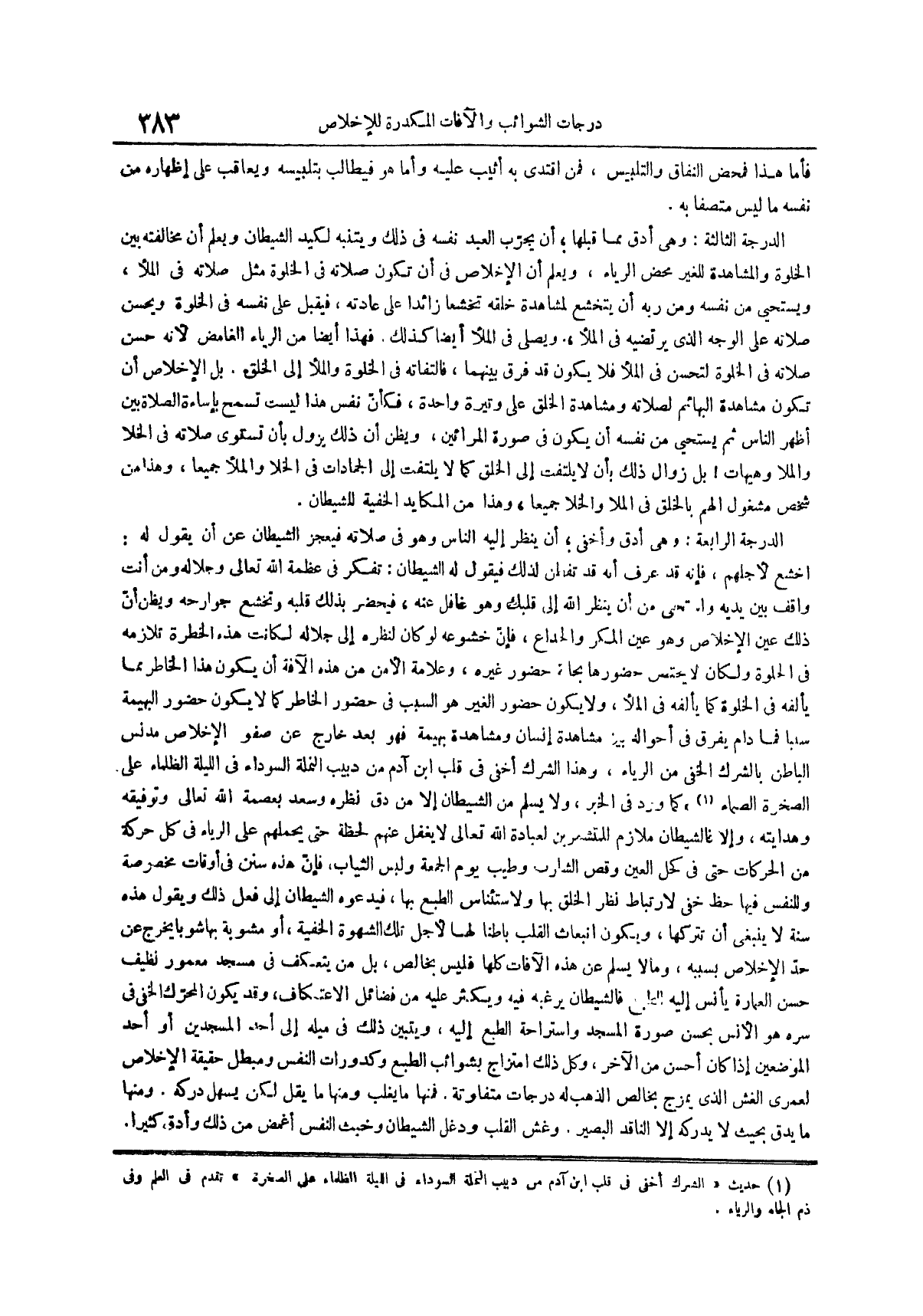 بل الإخلاص أن تكون مشاهدة البهائم لصلاته ومشاهدة الخلق على وتيرة واحدة فكأن نفس هذا ليست تسمح بإساءة الصلاة بين أظهر الناس ثم يستحيي من نفسه أن يكون في صورة المرائين ويظن أن ذلك يزول بأن تستوي صلاته في الخلا والملا وهيهات بل زوال ذلك بأن لا يلتفت إلى الخلق كما لا يلتفت إلى الجمادات في الخلا والملأ جميعاً وهذا من شخص مشغول الهم بالخلق في الملأ والخلا جميعاً وهذا من المكايد الخفية للشيطان