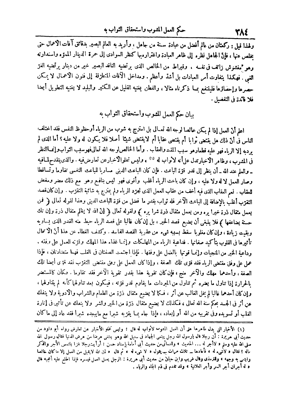 (¬1) الأخبار التى يدل ظاهرها على أن العمل المشوب لا ثواب له قال وليس تخلو الأخبار عن تعارض رواه أبو داود من حديث أبي هريرة أن رجلاً قال يا رسول الله رجل يبتغي الجهاد في سبيل الله وهو يبتغي عرضا من عرض الدنيا فقال رسول الله لا أجر له الحديث وللنسائي من حديث أبي أمامة بإسناد حسن أرأيت رجلا غزا يلتمس الأجر والذكر ماله فقال لا شيء له فأعادها ثلاث مرات يقول لا شيء له {ثم قال} أن الله لا يقبل من العمل إلا ما كان خالصا وابتغى به وجهه وللترمذي وقال غريب وابن حبان من حديث أبي هريرة الرجل يعمل العمل فيسره فإذا اطلع عليه أعجبه قال له أجران أجر السر وأجر العلانية وقد تقدم في ذم الجاه والرياء