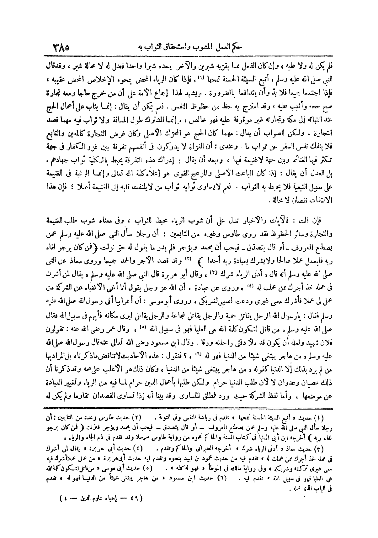فإن قلت فالآيات والأخبار تدل على أن شوب الرياء محبط للثواب وفي معناه شوب طلب الغنيمة والتجارة وسائر الحظوظ فقد روى طاوس وغيره من التابعين أن رجلاً سأل النبي صلى الله عليه وسلم عمن يصطنع المعروف أو قال يتصدق فيحب أن يحمد ويؤجر فلم يدر ما يقول له حتى نزلت {فمن كان يرجو لِقَاءَ رَبِّهِ فَلْيَعْمَلْ عَمَلًا صَالِحًا وَلَا يُشْرِكْ بعبادة ربه أحدا} (¬2) وقد قصد الأجر والحمد جميعاً وروى معاذ عَنِ النَّبِيِّ صَلَّى اللَّهُ عَلَيْهِ وَسَلَّمَ أَنَّهُ قال أدنى الرياء شرك (¬3) وقال أبو هريرة قال النبي صلى الله عليه وسلم يقال لمن أشرك في عمله خذ أجرك ممن عملت له (¬4) وروي عن عبادة إن الله عز وجل يقول أنا أغنى الأغنياء عن الشركة من عمل لي عملاً فأشرك معي غيري ودعت نصيبي لشريكي وروى أبو موسى أن أعرابياً أتى رسول الله صلى الله عليه وسلم فقال يا رسول الله الرجل يقاتل حمية والرجل يقاتل شجاعة والرجل يقاتل ليرى مكانه فأيهم فِي سَبِيلِ اللَّهِ فَقَالَ صَلَّى اللَّهُ عَلَيْهِ وسلم من قاتل لتكون كلمة الله هي العليا فهو في سبيل الله (¬5) وقال عمر رضي الله عنه تقولون فلان شهيد ولعله أن يكون قد ملأ دفتي راحلته ورقاً وقال ابن مسعود رضي الله تعالى عنه قَالَ رَسُولُ اللَّهِ صَلَّى اللَّهُ عَلَيْهِ وَسَلَّمَ من هاجر يبتغي شيئاً من الدنيا فهو له (¬6) فنقول هذه الأحاديث لا تناقض ما ذكرناه بل المراد بها من لم يرد بذلك إلا الدنيا كقوله من هاجر يبتغي شيئاً من الدنيا وكان ذلك هو الأغلب على همه وقد ذكرنا أن ذلك عصيان وعدوان لا لأن طلب الدنيا حرام ولكن طلبها بأعمال الدين حرام لما فيه من الرياء وتغيير العبادة عن موضعها وأما لفظ الشركة حيث ورد فمطلق للتساوي وقد بينا أنه إذا تساوى القصدان تقاوما ولم يكن له
