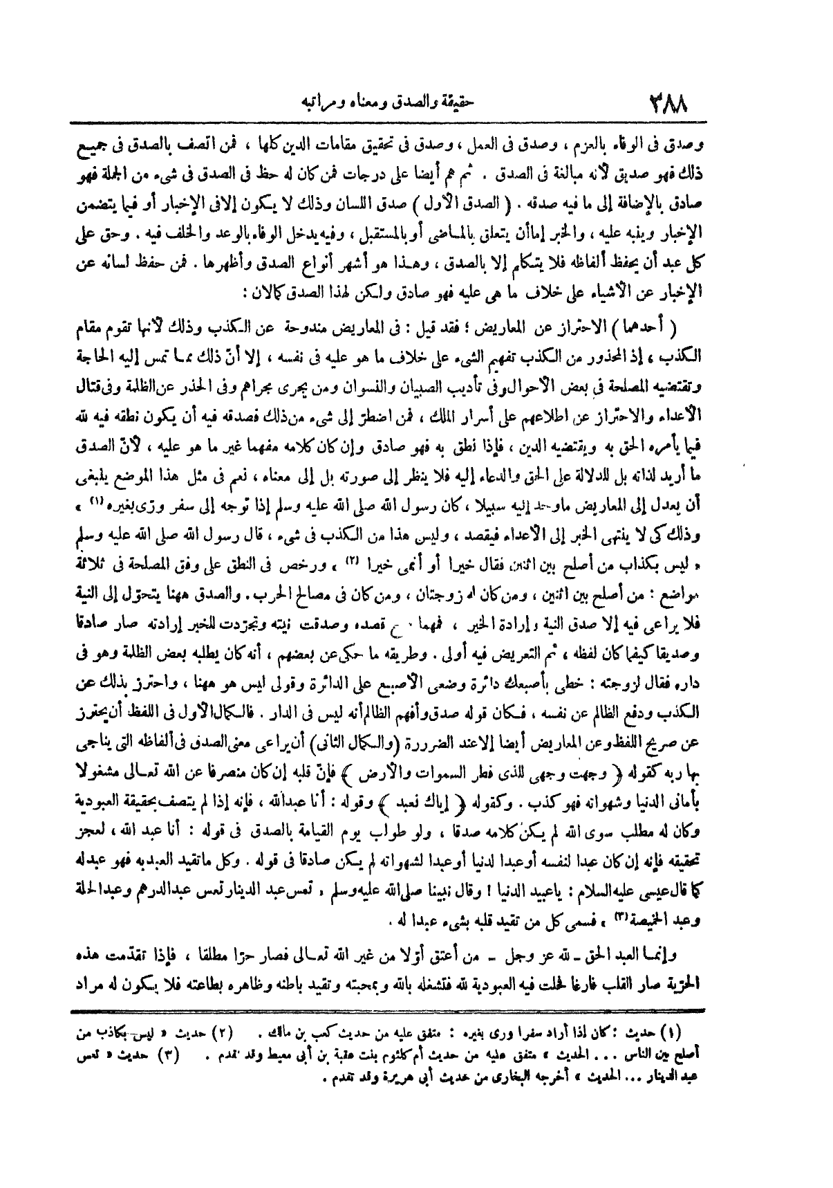 {أحدهما} الِاحْتِرَازُ عَنِ الْمَعَارِيضِ فَقَدْ قِيلَ فِي الْمَعَارِيضِ مَنْدُوحَةٌ عَنِ الْكَذِبِ وَذَلِكَ لِأَنَّهَا تَقُومُ مَقَامَ الكذب إذ المحذور من الكذب تفهيم الشيء على خلاف ما هو عليه في نفسه إِلَّا أَنَّ ذَلِكَ مِمَّا تَمَسُّ إِلَيْهِ الْحَاجَةُ وَتَقْتَضِيهِ الْمَصْلَحَةُ فِي بَعْضِ الْأَحْوَالِ وَفِي تَأْدِيبِ الصِّبْيَانِ وَالنِّسْوَانِ وَمَنْ يَجْرِي مَجْرَاهُمْ وَفِي الْحَذَرِ عَنِ الظَّلَمَةِ وَفِي قِتَالِ الْأَعْدَاءِ وَالِاحْتِرَازِ عَنِ إطلاعهم على أسرار الملك فَمَنِ اضْطُرَّ إِلَى شَيْءٍ مِنْ ذَلِكَ فَصِدْقُهُ فِيهِ أَنْ يَكُونَ نُطْقُهُ فِيهِ لِلَّهِ فِيمَا يَأْمُرُهُ الْحَقُّ بِهِ وَيَقْتَضِيهِ الدِّينُ فَإِذَا نَطَقَ بِهِ فَهُوَ صَادِقٌ وَإِنْ كَانَ كَلَامُهُ مُفْهِمًا غَيْرَ مَا هُوَ عَلَيْهِ لِأَنَّ الصِّدْقَ مَا أُرِيدَ لِذَاتِهِ بَلْ لِلدَّلَالَةِ عَلَى الْحَقِّ وَالدُّعَاءِ إِلَيْهِ فَلَا يُنْظَرُ إِلَى صُورَتِهِ بَلْ إِلَى مَعْنَاهُ نَعَمْ فِي مِثْلِ هَذَا الْمَوْضِعِ يَنْبَغِي أن يعدل إلى المعاريض ما وحد إِلَيْهِ سَبِيلًا كَانَ رَسُولُ اللَّهِ صَلَّى اللَّهُ عَلَيْهِ وَسَلَّمَ إِذَا تَوَجَّهَ إِلَى سَفَرٍ وَرَّى بِغَيْرِهِ (¬1) وَذَلِكَ كَيْ لَا يَنْتَهِيَ الْخَبَرُ إِلَى الْأَعْدَاءِ فَيُقْصَدَ وَلَيْسَ هَذَا مِنَ الْكَذِبِ فِي شَيْءٍ قَالَ رَسُولُ اللَّهِ صَلَّى اللَّهُ عَلَيْهِ وَسَلَّمَ لَيْسَ بِكَذَّابٍ مَنْ أَصْلَحَ بَيْنَ اثْنَيْنِ فَقَالَ خَيْرًا أَوْ أَنْمَى خَيْرًا (¬2) وَرَخَّصَ فِي النُّطْقِ عَلَى وِفْقِ الْمَصْلَحَةِ فِي ثَلَاثَةِ مَوَاضِعَ مَنْ أَصْلَحَ بَيْنَ اثْنَيْنِ وَمَنْ كَانَ لَهُ زَوْجَتَانِ وَمَنْ كَانَ فِي مَصَالِحِ الْحَرْبِ