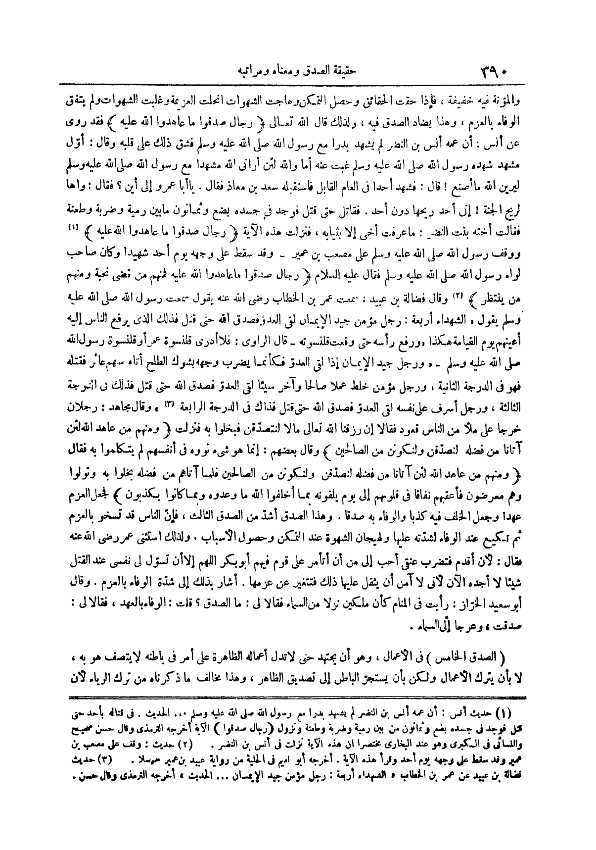 والمؤنة فِيهِ خَفِيفَةٌ فَإِذَا حُقَّتِ الْحَقَائِقُ وَحَصَلَ التَّمَكُّنُ وَهَاجَتِ الشَّهَوَاتُ انْحَلَّتِ الْعَزِيمَةُ وَغَلَبَتِ الشَّهَوَاتُ وَلَمْ يَتَّفِقِ الْوَفَاءُ بِالْعَزْمِ وَهَذَا يُضَادُّ الصِّدْقَ فِيهِ وَلِذَلِكَ قَالَ اللَّهُ تَعَالَى رِجَالٌ صَدَقُوا مَا عاهدوا الله عليه فَقَدْ رُوِيَ عَنْ أنس أَنَّ عَمَّهُ أنس بن النضر لَمْ يَشْهَدْ بَدْرًا مَعَ رَسُولِ اللَّهِ صَلَّى اللَّهُ عَلَيْهِ وَسَلَّمَ فَشَقَّ ذَلِكَ عَلَى قَلْبِهِ وَقَالَ أَوَّلُ مَشْهَدٍ شَهِدَهُ رَسُولُ اللَّهِ صَلَّى اللَّهُ عَلَيْهِ وَسَلَّمَ غِبْتُ عَنْهُ أَمَا وَاللَّهِ لَئِنْ أَرَانِي اللَّهُ مَشْهَدًا مَعَ رَسُولِ اللَّهِ صَلَّى اللَّهُ عَلَيْهِ وَسَلَّمَ لَيَرَيَنَّ اللَّهُ مَا أَصْنَعُ قَالَ فَشَهِدَ أُحُدًا فِي الْعَامِ الْقَابِلِ فَاسْتَقْبَلَهُ سَعْدُ بْنُ مُعَاذٍ فَقَالَ يا أبا عمرو إِلَى أَيْنَ فَقَالَ وَاهًا لِرِيحِ الْجَنَّةِ إِنِّي أَجِدُ رِيحَهَا دُونَ أُحُدٍ