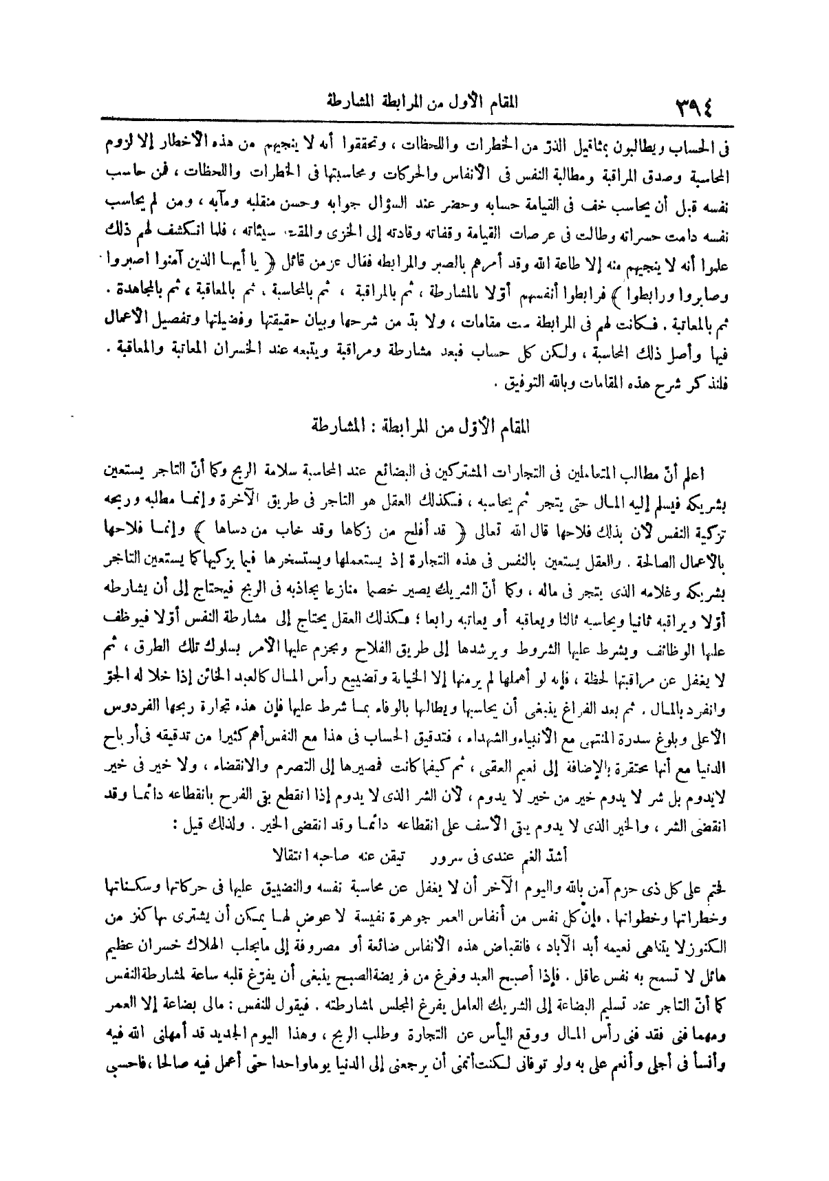 فإذا أَصْبَحَ الْعَبْدُ وَفَرَغَ مِنْ فَرِيضَةِ الصُّبْحِ يَنْبَغِي أن يفرغ قلبه ساعة لمشارطة النفس كما أن التاجر عند تسليم البضاعة إلى الشريك العامل يفرغ المجلس لمشارطته