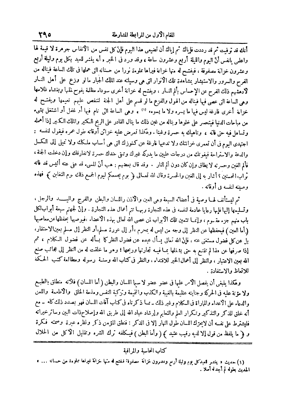 أَنَّكِ قَدْ تُوُفِّيتِ ثُمَّ قَدْ رُدِدْتِ فَإِيَّاكِ ثُمَّ إِيَّاكِ أَنْ تُضَيِّعِي هَذَا الْيَوْمَ فَإِنَّ كُلَّ نَفَسٍ مِنَ الْأَنْفَاسِ جَوْهَرَةٌ لَا قِيمَةَ لها واعلمي يا نفس أن اليوم والليلة أربع وعشرون ساعة وقد ورد في الخبر أنه ينشر للعبد بكل يوم وليلة أربع وعشرون خزانة مصفوفة فيفتح له منها خزانة فيراها مملوءة نوراً من حسناته التي عملها في تلك الساعة فيناله من الفرح والسرور والاستبشار بمشاهدة تلك الأنوار التي هي وسيلته عند الملك الجبار ما لو وزع على أهل النار لأدهشهم ذلك الفرح عن الإحساس بألم النار ويفتح له خزانة أخرى سوداء مظلمة يفوح منها نتنها ويغشاه ظلامها وهي الساعة التي عصي فيها فيناله من الهول والفزع ما لو قسم على أهل الجنة لتنغص عليهم نعيمها ويفتح له خزانة أخرى فارغة ليس فيها ما يسره ولا ما يسؤه (¬1) وهي الساعة التي نام فيها أو غفل أو اشتغل بشيء من مباحات الدنيا فيتحسر على خلوها ويناله من غبن ذلك ما ينال القادر على الربح الكثير والملك الكبير إذا أهمله وتساهل فيه حتى فاته وناهيك به حسرة وغبناً وهكذا تعرض عليه خزائن أوقاته طول عمره فيقول لنفسه اجتهدي اليوم في أن تعمري خزانتك ولا تدعيها فارغة عن كنوزك التي هي أسباب ملكك ولا تَمِيلِي إِلَى الْكَسَلِ وَالدَّعَةِ وَالِاسْتِرَاحَةِ فَيَفُوتَكِ مِنْ دَرَجَاتِ عِلِّيِّينَ مَا يُدْرِكُهُ غَيْرُكِ وَتَبْقَى عِنْدَكِ حَسْرَةٌ لَا تُفَارِقُكِ وَإِنْ دَخَلْتِ الْجَنَّةَ فَأَلَمُ الغبن وحسرته لا يطاق وإن كان دون ألم النار