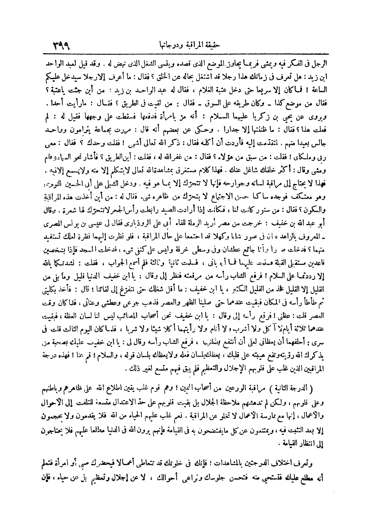 وقال أبو عبد الله بن خفيف خرجت من مصر أريد الرملة للقاء أبي على الروذبارى فقال لي عيسى بن يونس المصري المعروف بالزاهد وأن في صور شابا وكهلا قد اجتمعا على حال المراقبة فلو نظرت إليهما نظرة لعلك تستفيد منهما فدخلت صورا وأنا جائع عطشان وفي وسطى خرقة وليس على كتفي شيء فدخلت المسجد فإذا بشخصين قاعدين مستقبلى القبلة فسلمت عليهما فما أجابانى فسلمت ثانية وثالثة فلم أسمع الجواب فقلت نشدتكما بالله إلا رددتما على السلام فرفع الشاب رأسه من مرقعته فنظر إلى وقال يا ابن خفيف الدنيا قليل ومابقى من القليل إلا القليل فخذ من القليل الكثير يا ابن خفيف ما أقل شغلك حتى تتفرغ إلى لقائنا قال فأخذ بكليتي ثم طأطأ رأسه في المكان فبقيت عندهما حتى صلينا الظهر والعصر فذهب جوعي وعطشي وعنائي فلما كان وقت العصر قلت عظنى فرفع رأسه إلى وقال يا ابن خفيف نحن أصحاب المصائب ليس لنا لسان العظة فبقيت عندهما ثلاثة أيام لا آكل ولا أشرب ولا أنام ولا رأيتهما أكلا شيئا ولا شربا فلما كان اليوم الثالث قلت في سري أحلفهما أن يعظاني لعلى أن أنتفع اضطرها فرفع الشاب رأسه وقال لي يا ابن خفيف عليك بصحبة من يذكرك الله رؤيته وتقع هيبته على قلبك يعظك بلسان فعله ولا يعظك بلسان قوله والسلام قم عنا فهذه درجة المراقبين الذين غلب على قلوبهم الإجلال والتعظيم فلم يبق فيهم متسع لغير ذلك