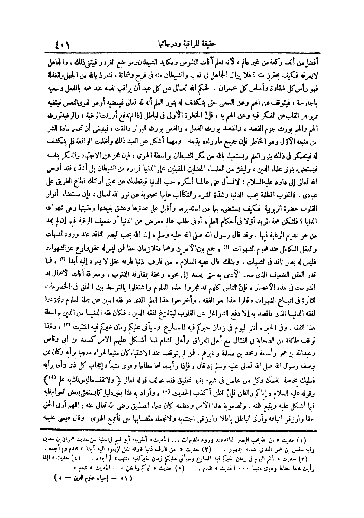 ولذلك قال عليه السلام من قارف ذنباً فارقه عقل لا يعود إليه أبدا (¬2) فما قدر العقل الضعيف الذي سعد الآدمي به حتى يعمد إلى محوه ومحقه بمقارنة الذنوب ومعرفة آفات الأعمال قد اندرست في هذه الأعصار فإن الناس كلهم قد هجروا هذه العلوم واشتغلوا بالتوسط بين الخلق في الخصومات الثائرة في اتباع الشهوات وقالوا هذا هو الفقة وأخرجوا هذا العلم الذي هو فقه الدين عن جملة العلوم وتجردوا لفقه الدنيا الذى ما قصد به الا دفع الشواغل عن القلوب ليتفرغ لفقه الدين فكان فقه الدنيا من الدين بواسطة هذا الفقه