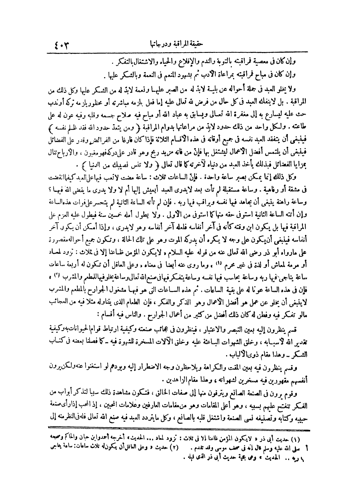 وما روى عنه أيضا في معناه وعلى العاقل أن تكون له أربعة ساعات ساعة يناجي فيها ربه وساعة يحاسب فيها نفسه وساعة يتفكر فيها في صنع الله تعالى وساعة يخلو فيها للمطعم والمشرب (¬2) فإن في هذه الساعة عونا له على بقية الساعات