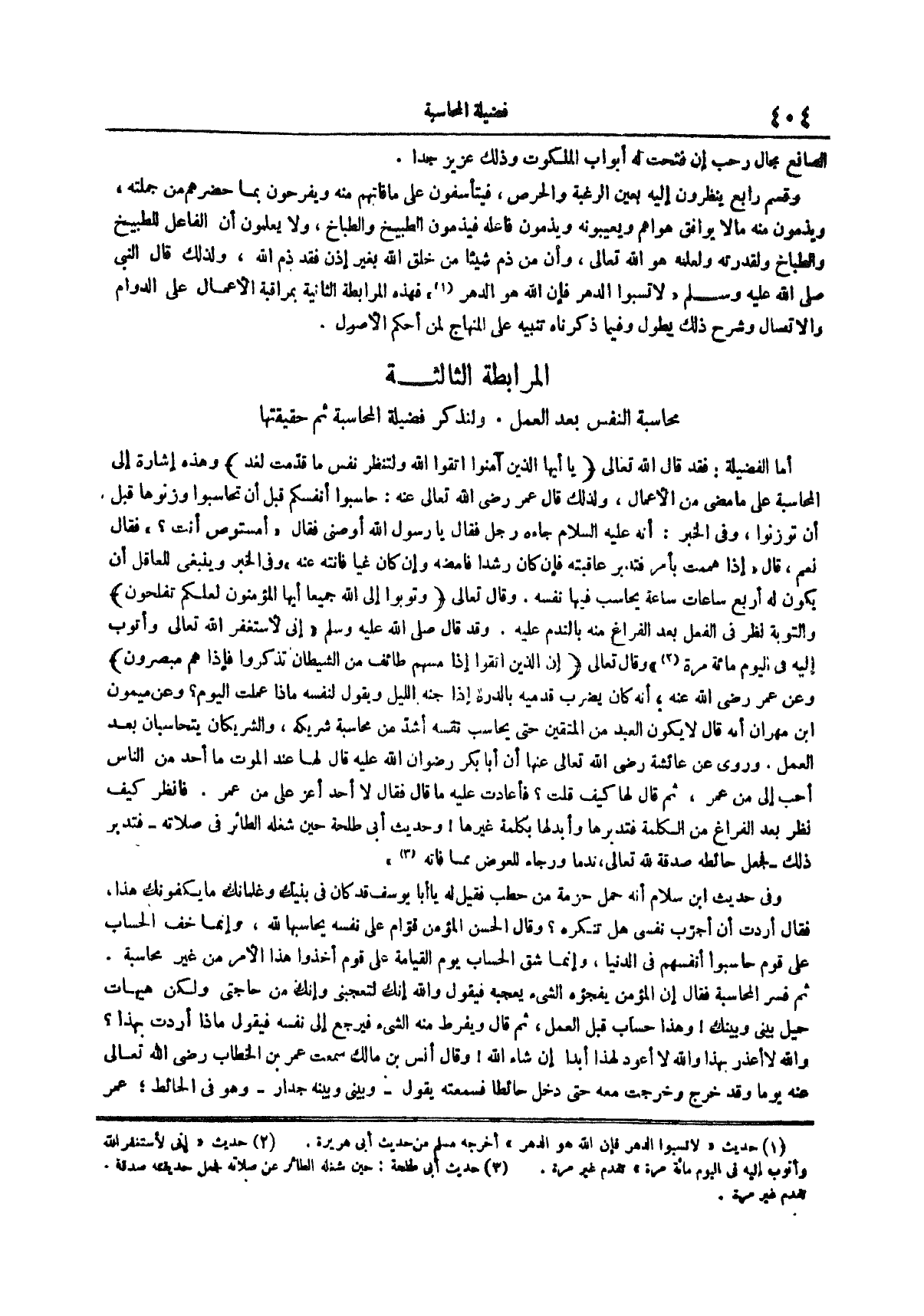 وقسم رابع ينظرون إليه بعين الرغبة والحرص فيتأسفون على ما فاتهم منه ويفرحون بما حضرهم من جملته ويذمون منه مالا يوافق هواهم ويعيبونه ويذمون فاعله فيذمون الطبيخ والطباخ ولا يعلمون أن الفاعل للطبيخ والطباخ ولقدرته ولعلمه هو الله تعالى وأن من ذم شيئا من خلق الله بغير إذن فقد ذم الله ولذلك قال النبي صلى الله عليه وسلم لا تسبوا الدهر فإن الله هو الدهر (¬1) فهذه المرابطة الثانية بمراقبة الأعمال على الدوام والاتصال وشرح ذلك يطول وفيما ذكرناه تنبيه على المنهاج لمن أحكم الأصول المرابطة الثالثة محاسبة النفس بعد العمل ولنذكر فضيلة المحاسبة ثم حقيقتها