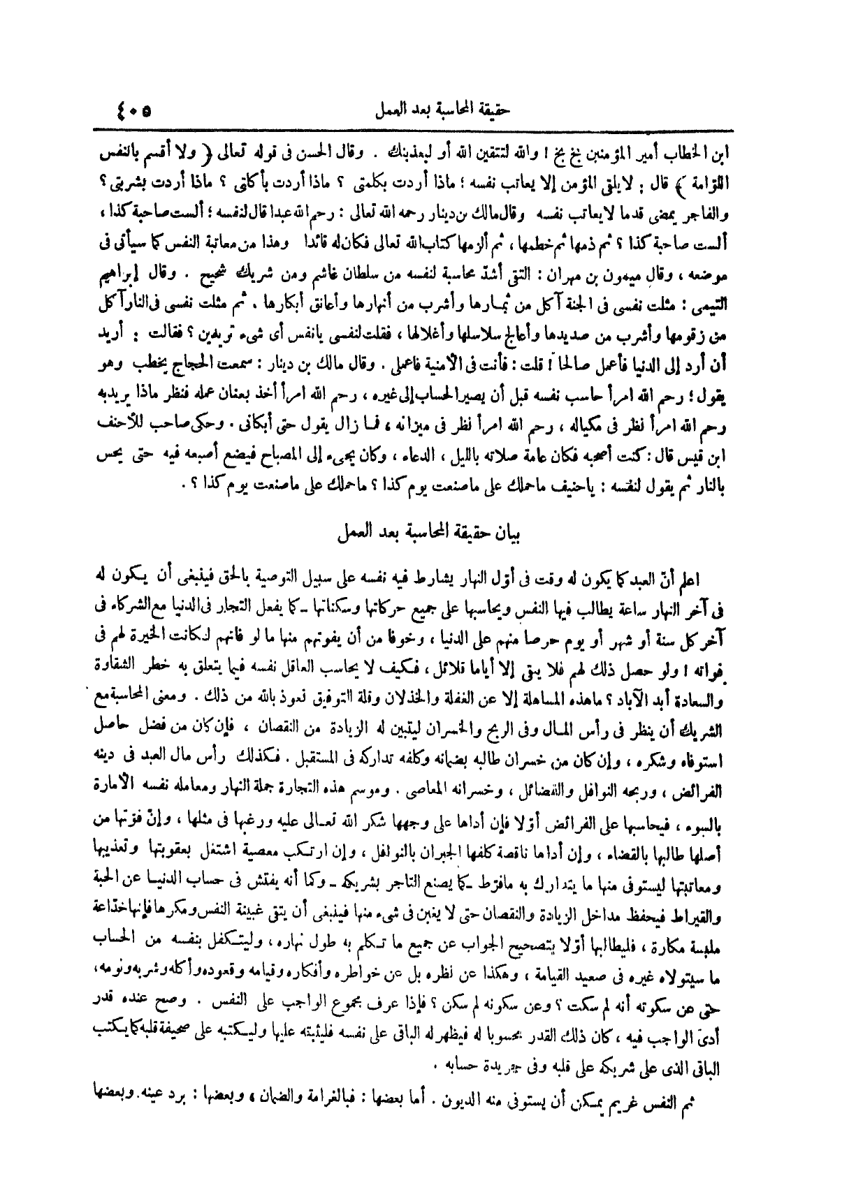 أعلم أن العبد كما يكون له وقت في أول النهار يشارط فيه نفسه على سبيل التوصية بالحق فينبغى أن يكون له فِي آخِرِ النَّهَارِ سَاعَةٌ يُطَالِبُ فِيهَا النَّفْسَ وَيُحَاسِبُهَا عَلَى جَمِيعِ حَرَكَاتِهَا وَسَكَنَاتِهَا كَمَا يَفْعَلُ التُّجَّارُ فِي الدُّنْيَا مَعَ الشُّرَكَاءِ فِي آخِرِ كُلِّ سَنَةٍ أَوْ شَهْرٍ أَوْ يَوْمٍ حِرْصًا منهم على الدنيا وخوفا من أن يفوتهم منها ما لو فاتهم لكانت الخيرة لهم في فواته ولو حصل ذلك لهم فلا يبقى إلا أياما قلائل فكيف لَا يُحَاسِبُ الْعَاقِلُ نَفْسَهُ فِيمَا يَتَعَلَّقُ بِهِ خَطَرُ الشَّقَاوَةِ وَالسَّعَادَةِ أَبَدَ الْآبَادِ مَا هَذِهِ المساهلة إلا عن الغفلة والخذلان وقلة التوفيق نعوذ بالله من ذلك وَمَعْنَى الْمُحَاسَبَةِ مَعَ الشَّرِيكِ أَنْ يَنْظُرَ فِي رَأْسِ الْمَالِ وَفِي الرِّبْحِ وَالْخُسْرَانِ لِيَتَبَيَّنَ لَهُ الزِّيَادَةُ مِنَ النُّقْصَانِ فَإِنْ كَانَ مِنْ فَضْلٍ حَاصِلٍ اسْتَوْفَاهُ وَشَكَرَهُ وَإِنْ كَانَ مِنْ خُسْرَانٍ طَالَبَهُ بِضَمَانِهِ وَكُلَّفَهُ تَدَارُكَهُ فِي الْمُسْتَقْبَلِ فَكَذَلِكَ رَأْسُ مَالِ الْعَبْدِ فِي دِينِهِ الْفَرَائِضُ وَرِبْحُهُ النَّوَافِلُ وَالْفَضَائِلُ وَخُسْرَانُهُ الْمَعَاصِي وَمَوْسِمُ هَذِهِ التِّجَارَةِ جملة النهار ومعامله نفسه الأمارة بالسوء فيحاسبها عَلَى الْفَرَائِضِ أَوَّلًا فَإِنْ أَدَّاهَا عَلَى وَجْهِهَا شَكَرَ اللَّهَ تَعَالَى عَلَيْهِ وَرَغَّبَهَا فِي مِثْلِهَا وَإِنْ فَوَّتَهَا مِنْ أَصْلِهَا طَالَبَهَا بِالْقَضَاءِ وَإِنْ أَدَّاهَا نَاقِصَةً كَلَّفَهَا الْجُبْرَانَ بِالنَّوَافِلِ وَإِنِ ارْتَكَبَ معصية اشتغل بعقوبتها وتعذيبها وَمُعَاتَبَتِهَا لِيَسْتَوْفِيَ مِنْهَا مَا يَتَدَارَكُ بِهِ مَا فرط كما يصنع التاجر بشريكه وكما أنه يفتش في حساب الدنيا عن الحبة والقيراط فيحفظ مداخل الزيادة والنقصان حتى لا يغبن في شيء منها فينبغى أن يتقى غبينة النفس ومكرها فإنها خداعة ملبسة مكارة فليطالبها أولا بتصحيح الجواب عن جميع ماتكلم به طول نهاره وَلْيَتَكَفَّلْ بِنَفْسِهِ مِنَ الْحِسَابِ مَا سَيَتَوَلَّاهُ غَيْرُهُ في صعيد القيامة وهكذا عن نظره بل عن خواطره وأفكاره وقيامه وقعوده وأكله وشربه ونومه حتى عن سكوته أنه لم سكت وعن سكونه لم سكن فإذا عرف مجموع الواجب على النفس وصح عنده قدر أدى الواجب فيه كان ذلك القدر محسوبا له فيظهر له الباقي على نفسه فليثبته عليها وليكتبه على صحيفة قلبه كما يكتب الباقي الذي على شريكه على قلبه وفي جريدة حسابه