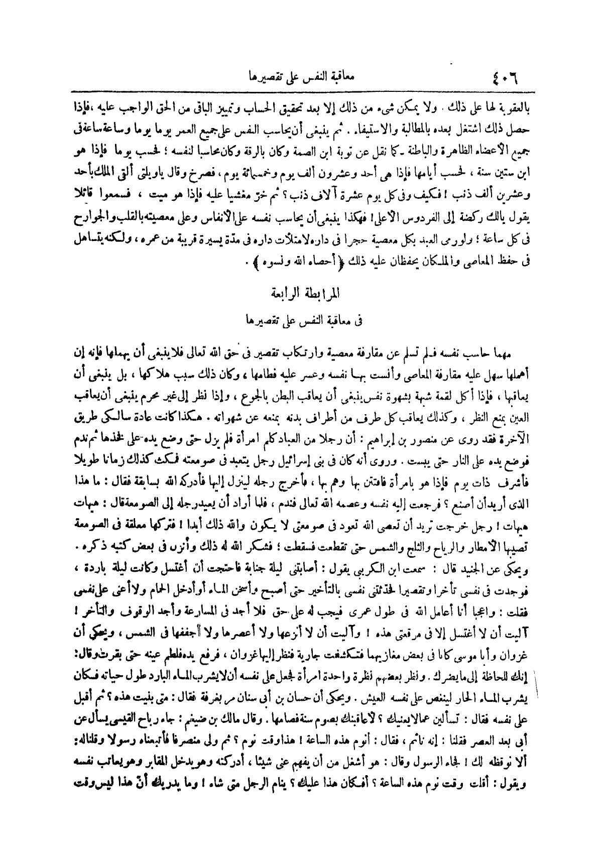 ثم ينبغي أن يحاسب النفس على جميع العمر يوما يوما وساعة ساعة في جميع الأعضاء الظاهرة والباطنة كما نقل عن توبه ابن الصمة وكان بالرقة وكان محاسبا لنفسه فحسب يوما فإذا هو ابن ستين سنة فحسب أيامها فإذا هي أحد وعشرون ألف يوم وخمسمائة يوم فصرخ وقال يا ويلتي ألقى الملك بأحد وعشرين ألف ذنب فكيف وفي كل يوم عشرة آلاف ذنب ثم خر مغشيا عليه فإذا هو ميت فسمعوا قائلا يقول يا لك ركضة إلى الفردوس الأعلى فهكذا ينبغي أن يحاسب نفسه على الأنفاس وعلى معصيته بالقلب والجوارح في كل ساعة ولو رمى العبد بكل معصية حجرا في داره لامتلأت داره في مدة يسيرة قريبة من عمره ولكنه يتساهل في حفظ المعاصى والملكان يحفظان عليه ذلك {أحصاه الله ونسوه} المرابطة الرابعة في معاقبة النفس على تقصيرها