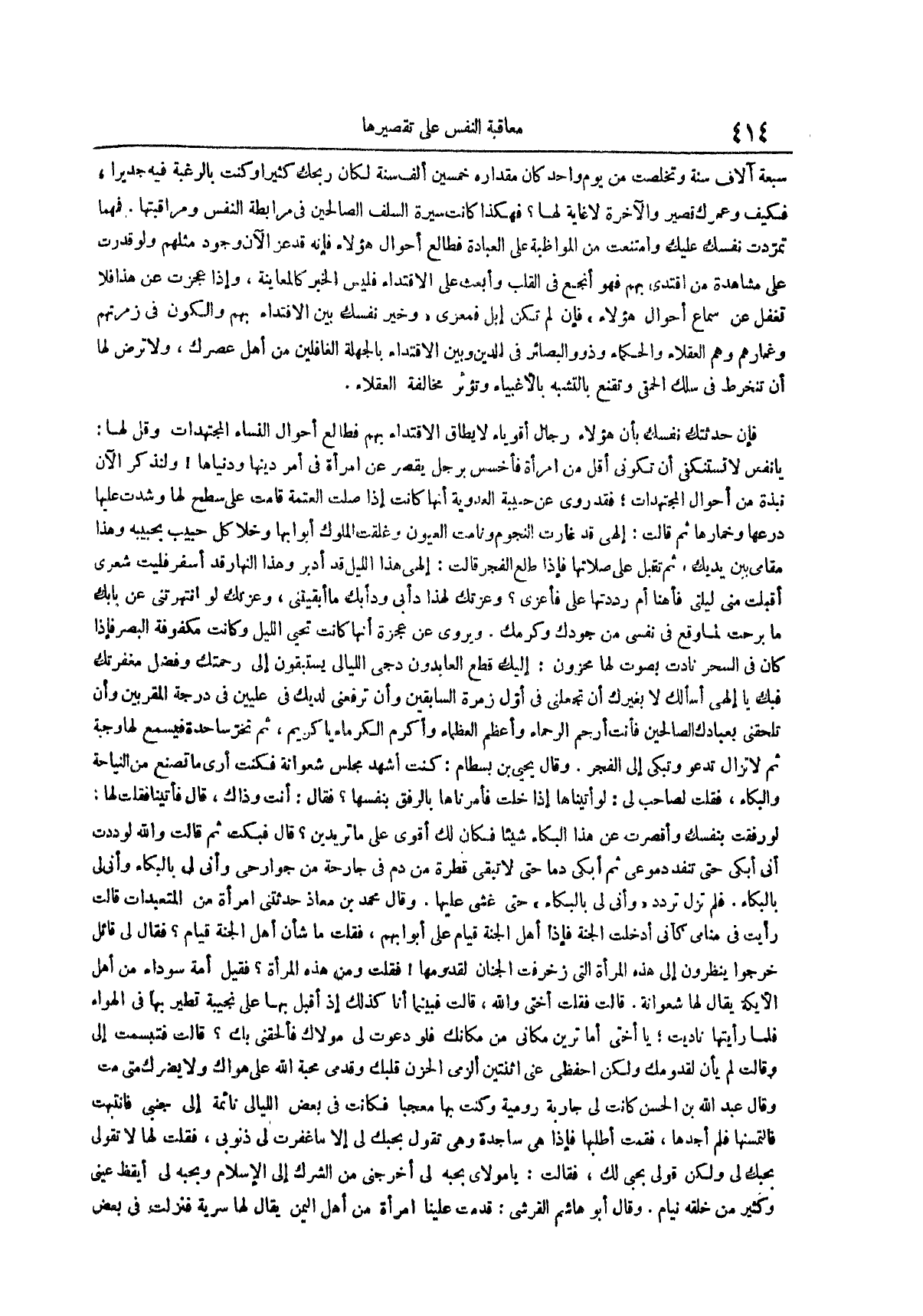 فإن حدثتك نفسك بأن هؤلاء رجال أقوياء لا يطاق الاقتداء بهم فطالع أحوال النساء المجتهدات وقل لها يا نفس لا تستنكفى أن تكونى أقل من امرأة فأخسس برجل يقصر عن امرأة في أمر دينها ودنياها ولنذكر الآن نبذة من أحوال المجتهدات فقد روى عن حبيبة العدوية أنها كانت إذا صلت العتمة قامت على سطح لها وشدت عليها درعها وخمارها ثم قالت إلهى قد غارت النجوم ونامت العيون وغلقت الملوك أبوابها وخلا كل حبيب بحبيبه وهذا مقامى بين يديك ثم تقبل على صلاتها فإذا طلع الفجر قالت إلهى هذا الليل قد أدبر وهذا النهار قد أسفر فليت شعرى أقبلت منى ليلتى فأهنا أم رددتها على فأعزى وعزتك لهذا دأبى ودأبك ما أبقيتنى وعزتك لو انتهرتنى عن بابك ما برحت لما وقع في نفسى من جودك وكرمك