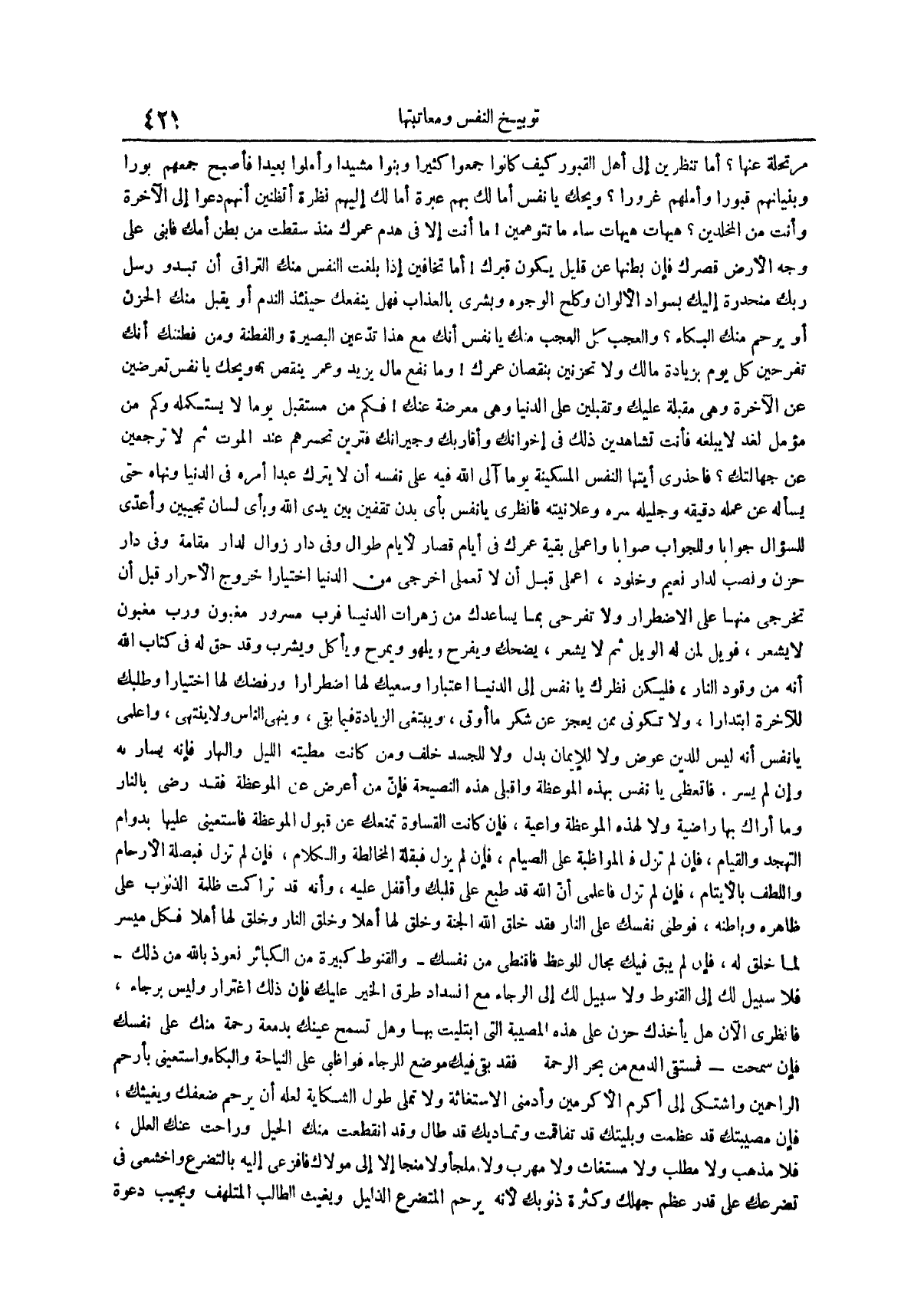 مرتحلة عنها أما تنظرين إلى أهل القبور كيف كانوا جمعوا كثيرا وبنوا مشيدا وأملوا بعيدا فأصبح جمعهم بورا وبنيانهم قبورا وأملهم غرورا ويحك يا نفس أما لك بهم عبرة أما لك إليهم نظرة أتظنين أنهم دعوا إلى الآخرة وأنت من المخلدين هيهات هيهات ساء ما تتوهمين ما أنت إلا فى هدم عمرك منذ سقطت من بطن أمك فابنى على وجه الأرض قصرك فإن بطنها عن قليل يكون قبرك أما تخافين إذا بلغت النفس منك التراقى أن تبدو رسل ربك منحدرة إليك بسواد الألوان وكلح الوجوه وبشرى بالعذاب فهل ينفعك حينئذ الندم أو يقبل منك الحزن أو يرحم منك البكاء والعجب كل العجب منك يا نفس أنك مع هذا تدعين البصيرة والفطنة ومن فطنتك أنك تفرحين كل يوم بزيادة مالك ولا تحزنين بنقصان عمرك وما نفع مال يزيد وعمر ينقص ويحك يا نفس تعرضين عن الآخرة وهى مقبلة عليك وتقبلين على الدنيا وهى معرضة عنك فكم من مستقبل يوما لا يستكمله وكم من مؤمل لغد لا يبلغه فأنت تشاهدين ذلك في إخوانك وأقاربك وجيرانك فترين تحسرهم عند الموت ثم لا ترجعين عن جهالتك فاحذرى أيتها النفس المسكينة يوما آلى الله فيه على نفسه أن لا يترك عبد أمره في الدنيا ونهاه حتى يسأله عن عمله دقيقه وجليله سره وعلانيته فانظرى يَا نَفْسُ بِأَيِّ بَدَنٍ تَقِفِينَ بَيْنَ يَدَيِ اللَّهِ وَبِأَيِّ لِسَانٍ تُجِيبِينَ وَأَعِدِّي لِلسُّؤَالِ جَوَابًا وَلِلْجَوَابِ صَوَابًا وَاعْمَلِي بَقِيَّةَ عُمُرِكِ فِي أَيَّامٍ قِصَارٍ لِأَيَّامٍ طِوَالٍ وَفِي دَارِ زَوَالٍ لِدَارِ مُقَامَةٍ وَفِي دَارِ حَزَنٍ وَنَصَبٍ لِدَارِ نَعِيمٍ وخلود اعملى قبل أن لا تعملى اخرجى من الدنيا اختيارا خروج الأحرار قبل أن تخرجى منها على الاضطرار ولا تفرحى بما يساعدك من زهرات الدنيا فرب مسرور مغبون ورب مغبون لا يشعر فويل لمن له الويل ثم لا يشعر يضحك ويفرح ويلهو ويمرح ويأكل ويشرب وقد حق له في كتاب الله انه من وقود النار فليكن نظرك يا نفس إلى الدنيا اعتبارا وسعيك لها اضطرارا ورفضك لها اختيارا وطلبك للآخرة ابتدارا ولا تكونى ممن يعجز عن شكر ما أوتى ويبتغى الزيادة فيما بقى وينهى الناس ولا ينتهى واعلمى يا نفس أَنَّهُ لَيْسَ لِلدِّينِ عِوَضٌ وَلَا لِلْإِيمَانِ بَدَلٌ وَلَا لِلْجَسَدِ خَلَفٌ وَمَنْ كَانَتْ مَطِيَّتَهُ اللَّيْلُ وَالنَّهَارُ فَإِنَّهُ يُسَارُ بِهِ وَإِنْ لَمْ يَسِرْ