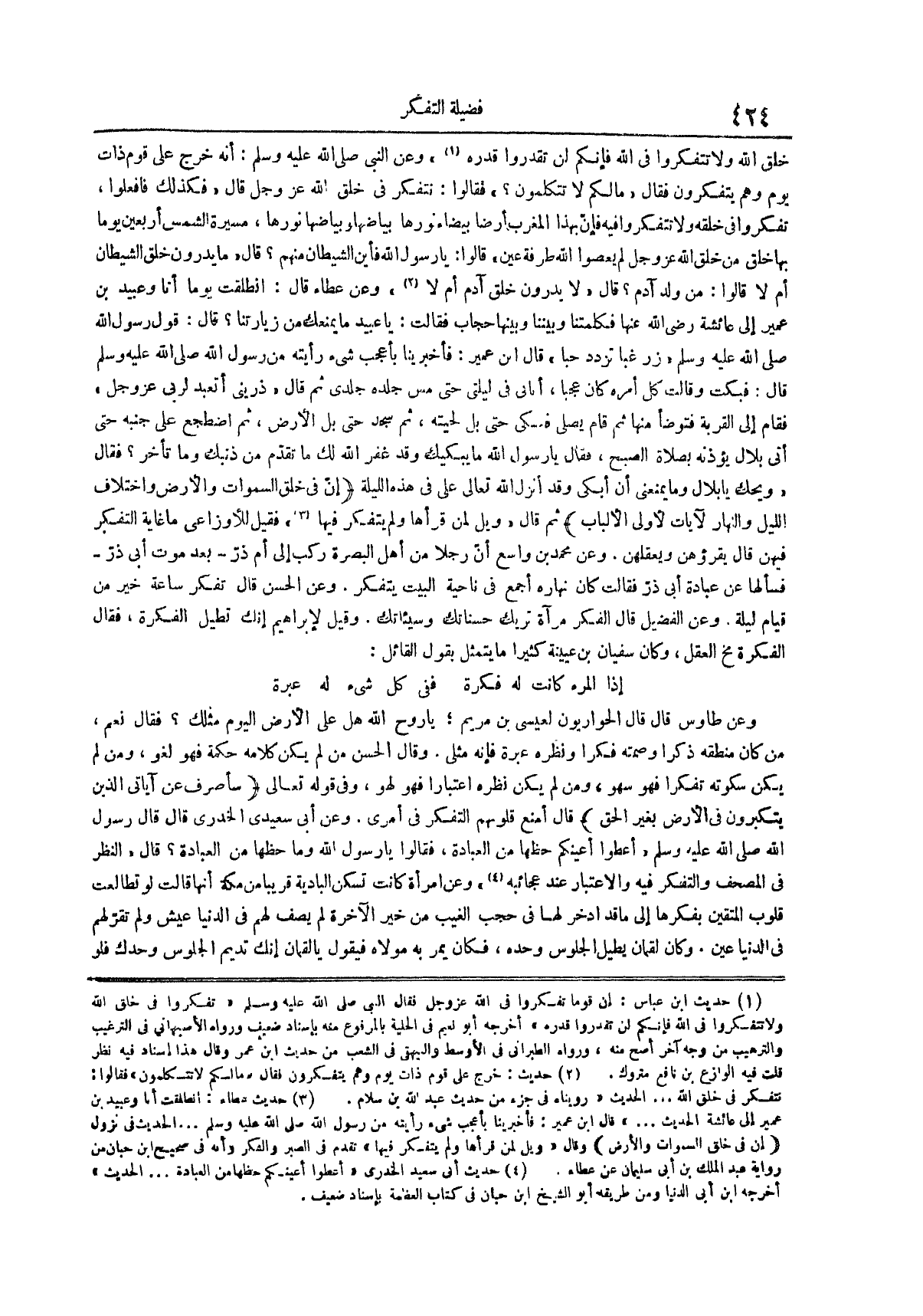 (¬2) حديث خرج على قوم ذات يوم وهم يتفكرون فقال ما لكم لا تتكلمون فقالوا نتفكر في خلق الله الحديث رويناه في جزء من حديث عبد الله بن سلام