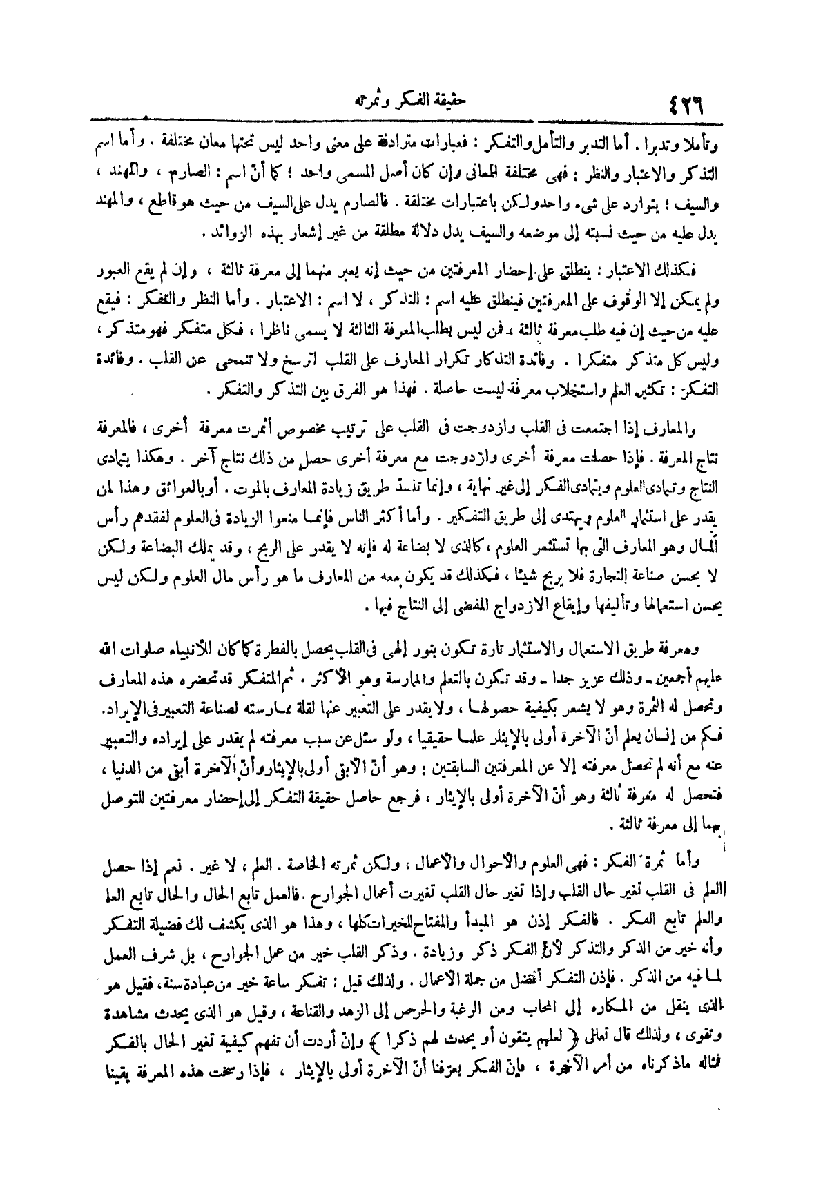 وأما ثمرة الفكر فهى العلوم والأحوال والأعمال ولكن ثمرته الخاصة