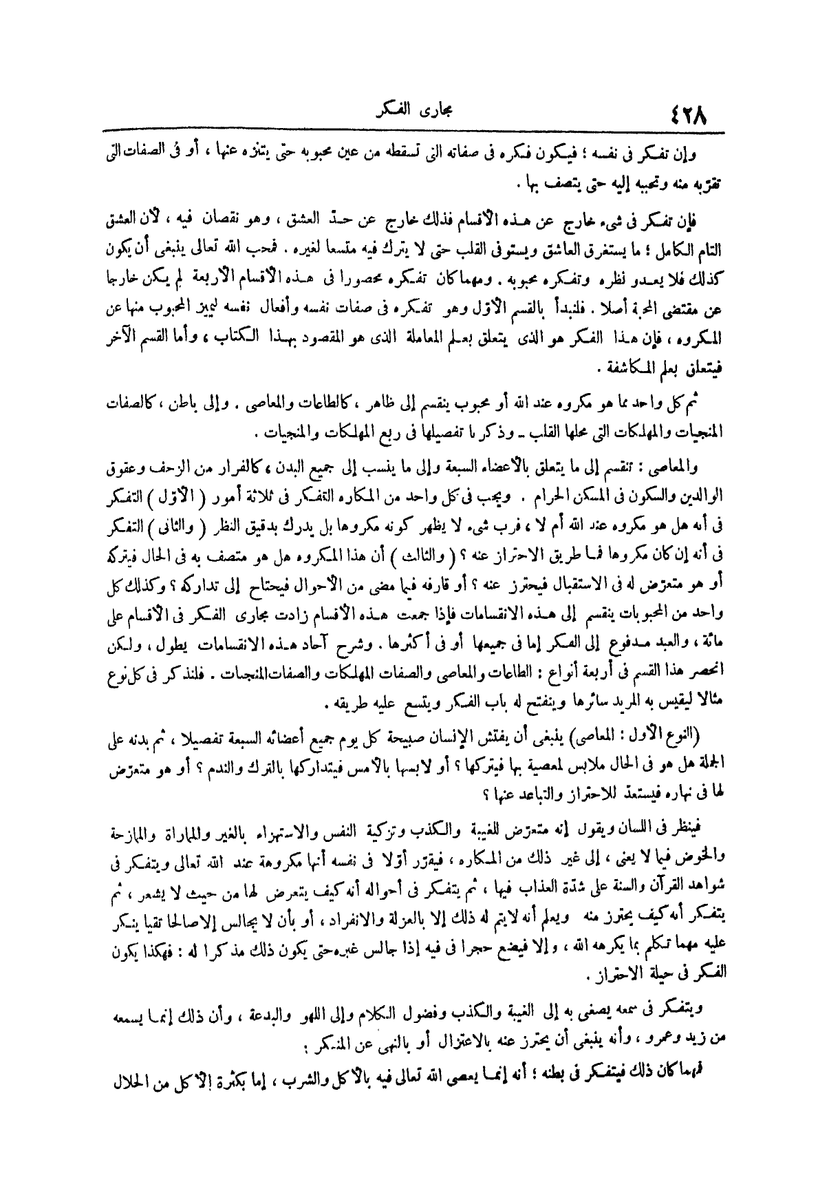 ومهما كان تفكره محصورا في هذه الأقسام الأربعة لم يكن خارجاً عن مقتضى المحبة أصلا فلنبدأ بالقسم الأول وهو تفكره في صفات نفسه وأفعال نفسه ليميز المحبوب منها عن المكروه فإن هذا الفكر هو الذى يتعلق بعلم المعاملة الذى هو المقصود بهذا الكتاب وأما القسم الآخر فيتعلق بعلم المكاشفة